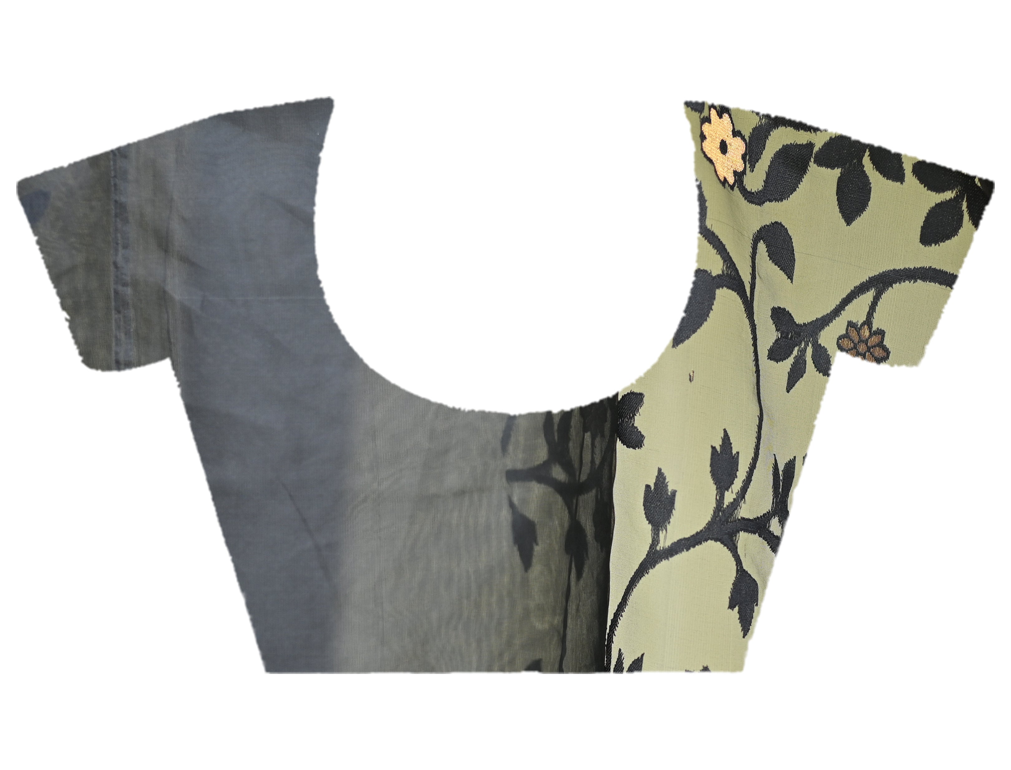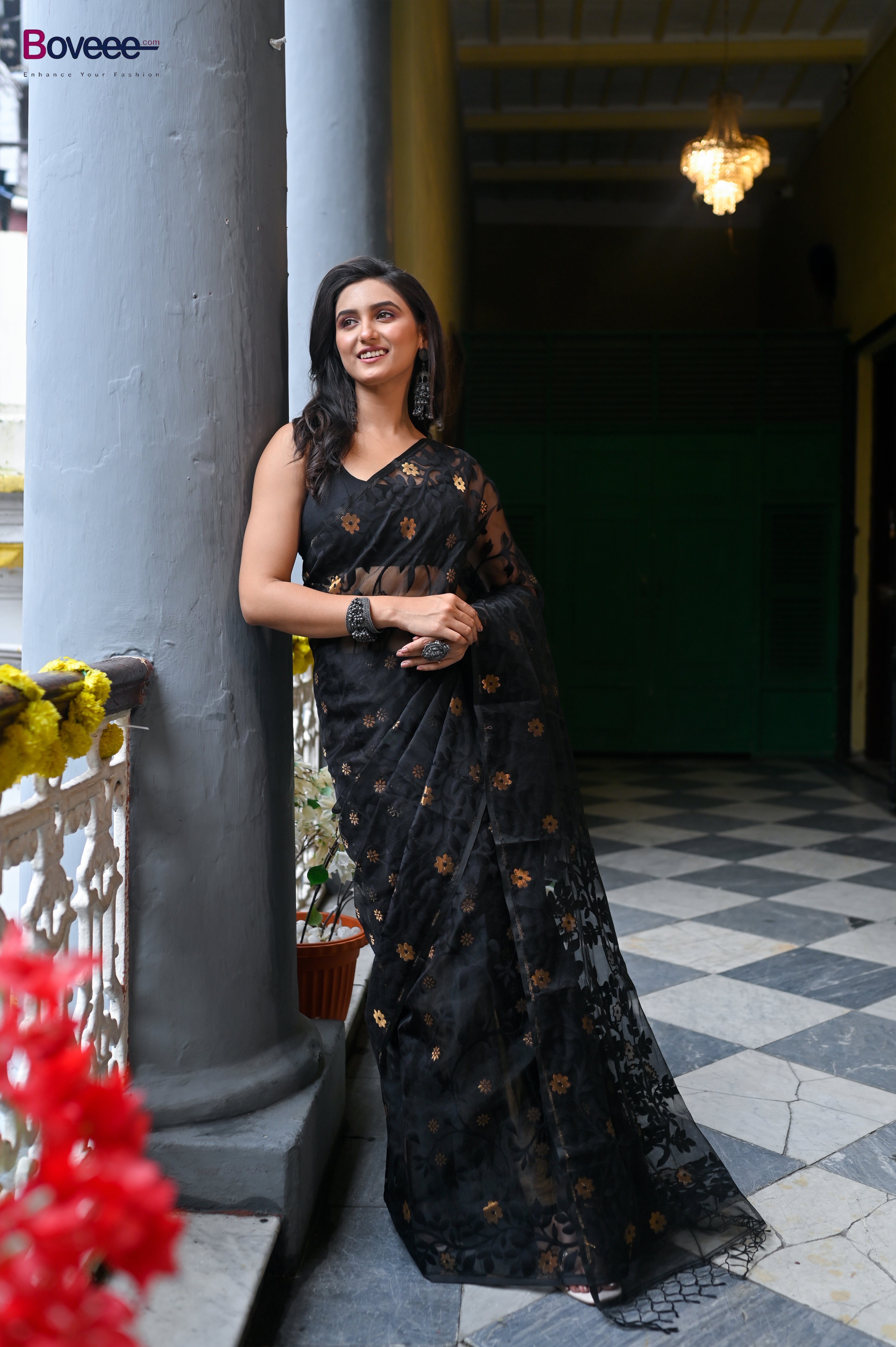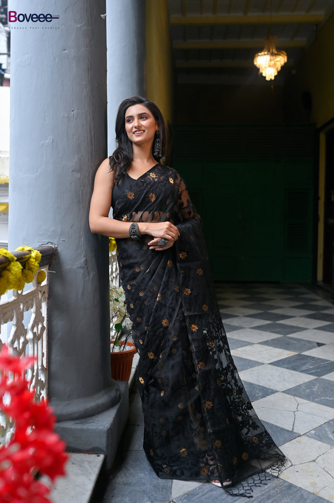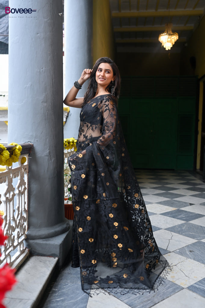 BLACK PURE MUSLIN SILK SAREE WITH SELF LEAF WOVEN MOTIFS AND GOLDEN FLOWER BUTIS