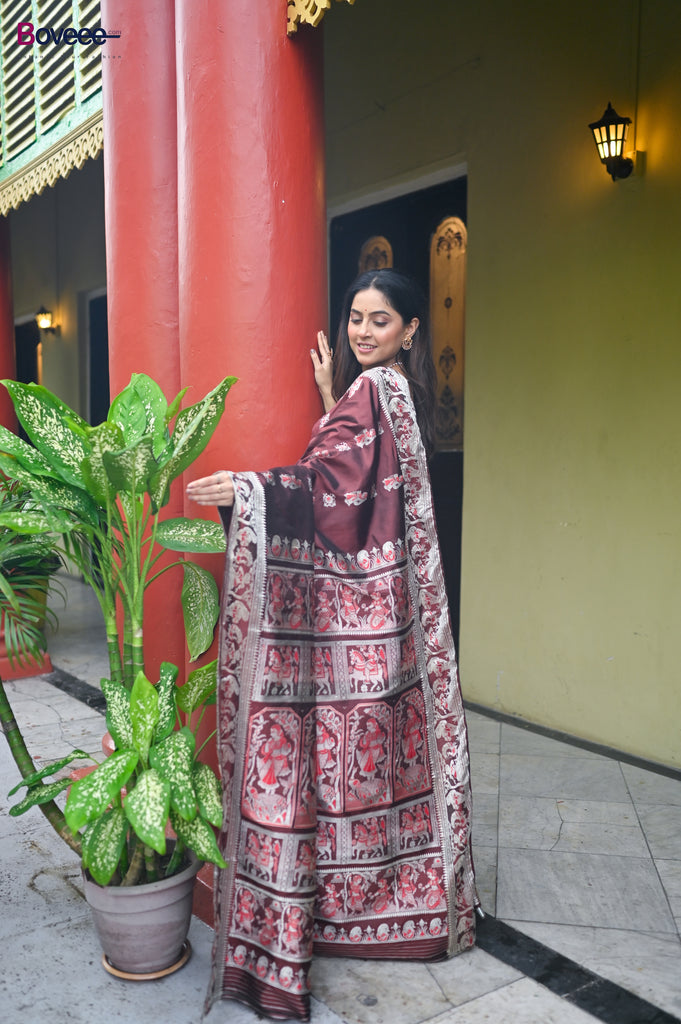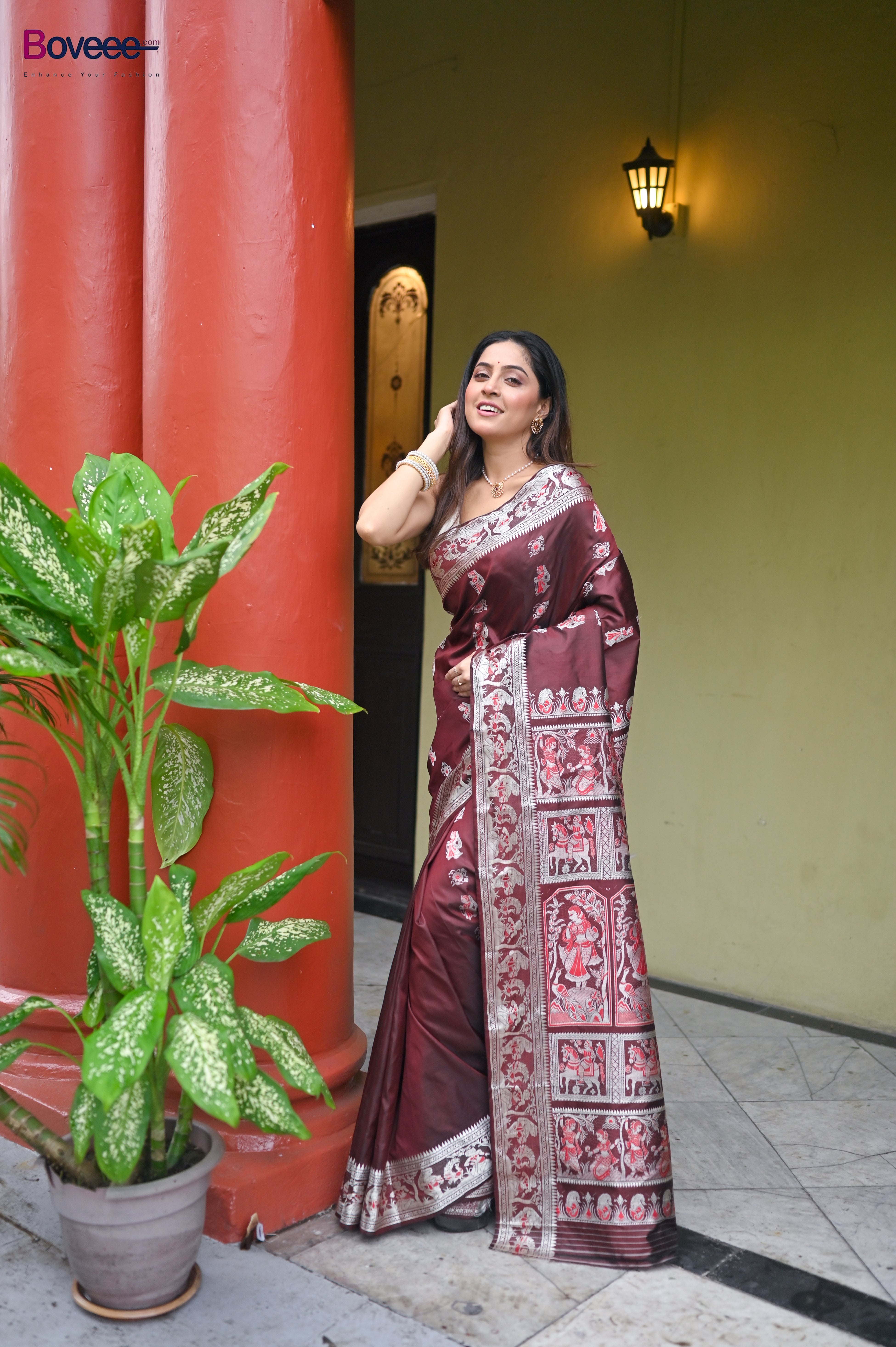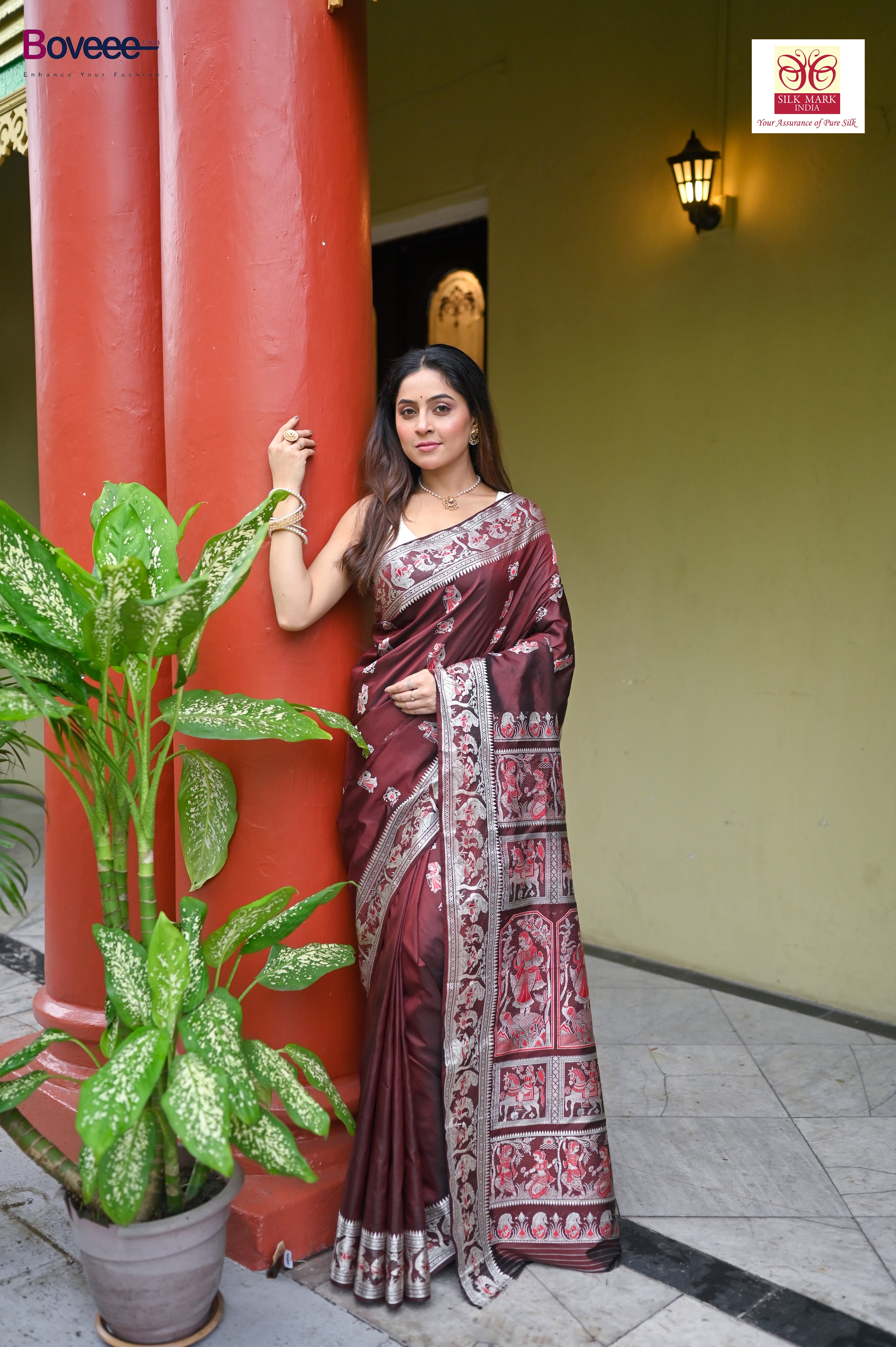 BROWN PURE HANDWOVEN BALUCHARI SILK SAREE WITH EXQUISITE RESHAM MINAKARI WORK IN DUAL COLOR