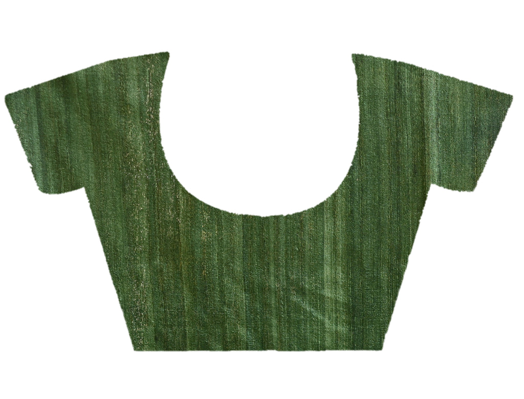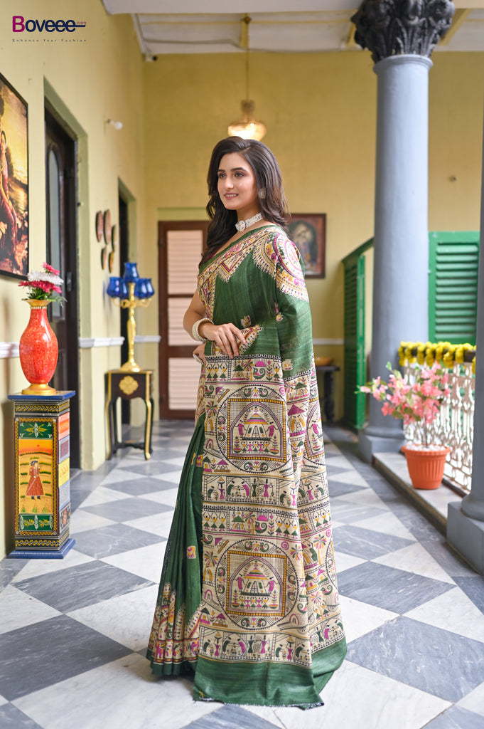 FOREST GREEN BISHNUPURI GHICHA TUSSAR SILK SAREE WITH MULTICOLOR MADHUBANI HAND PAINTED DESIGN