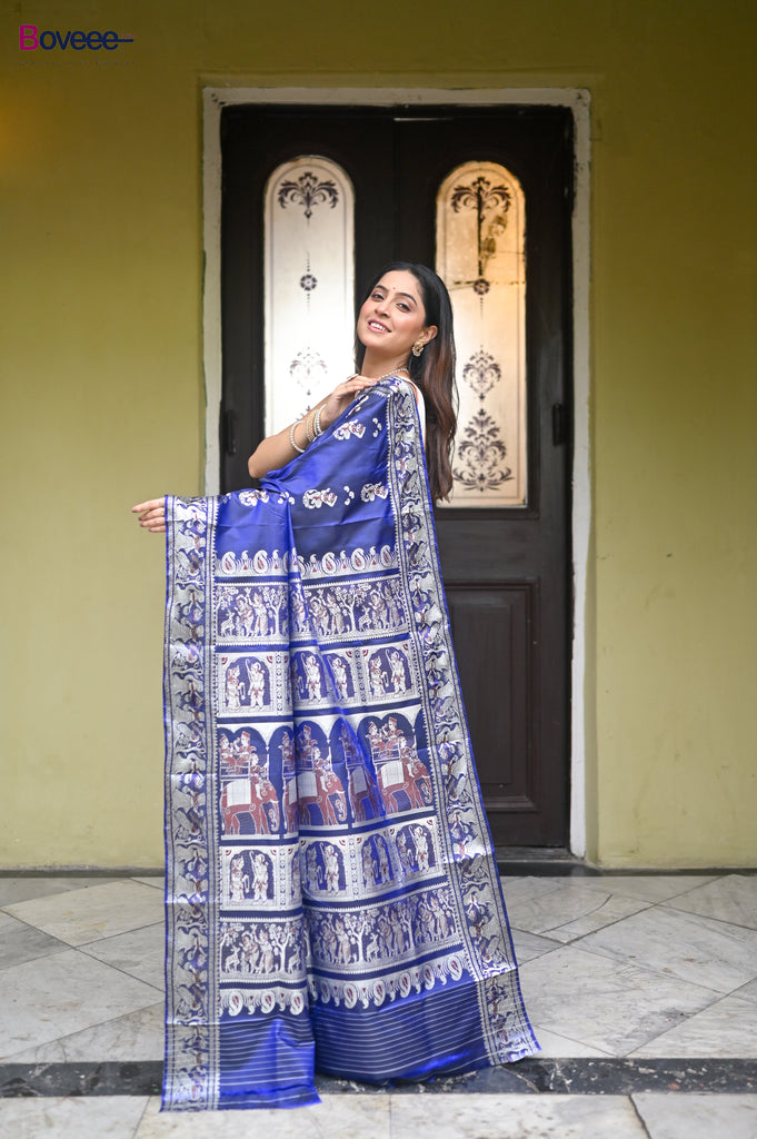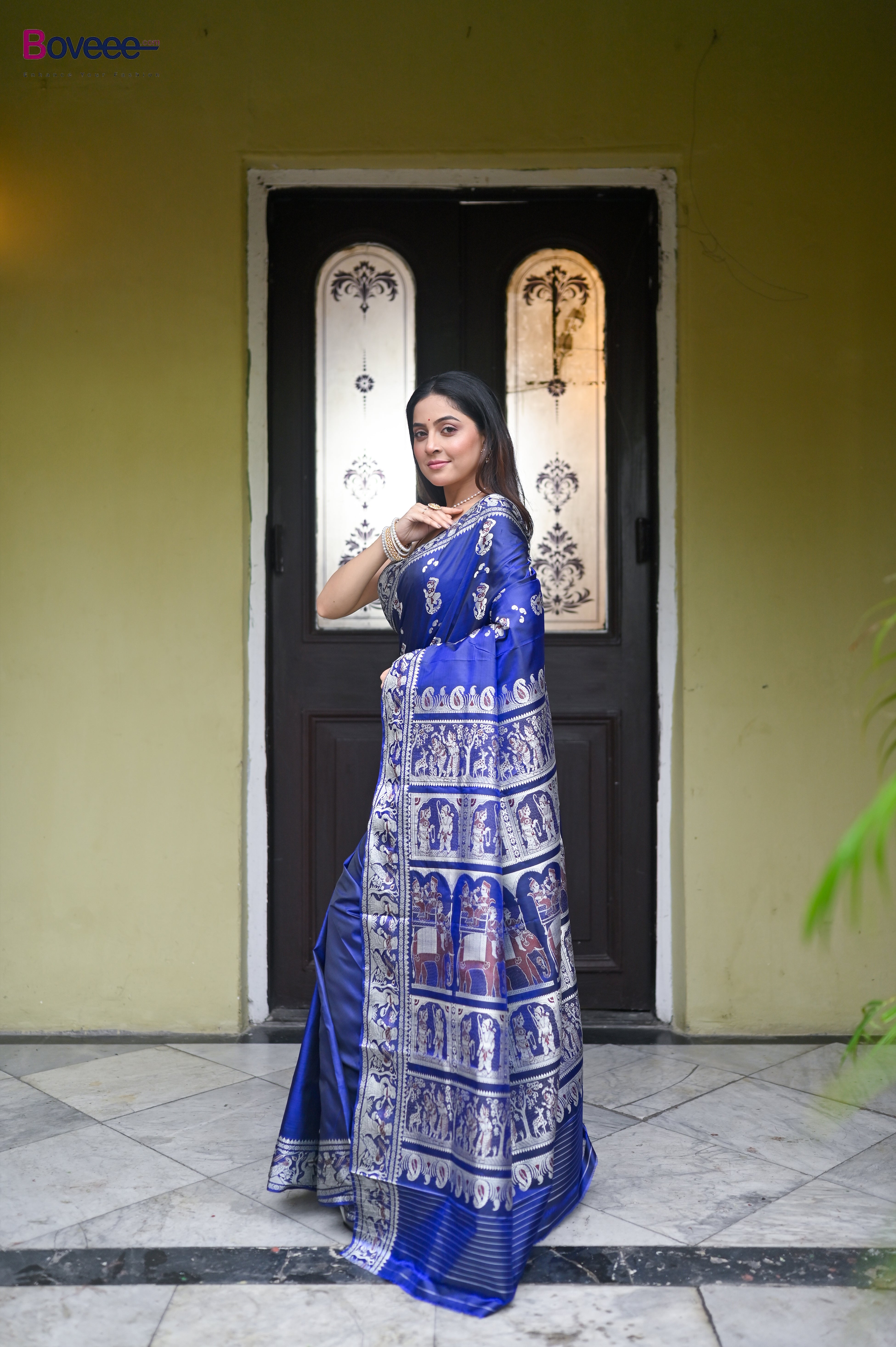 INK BLUE PURE HANDWOVEN BALUCHARI SILK SAREE WITH EXQUISITE RESHAM MINAKARI WORK IN DUAL COLOR