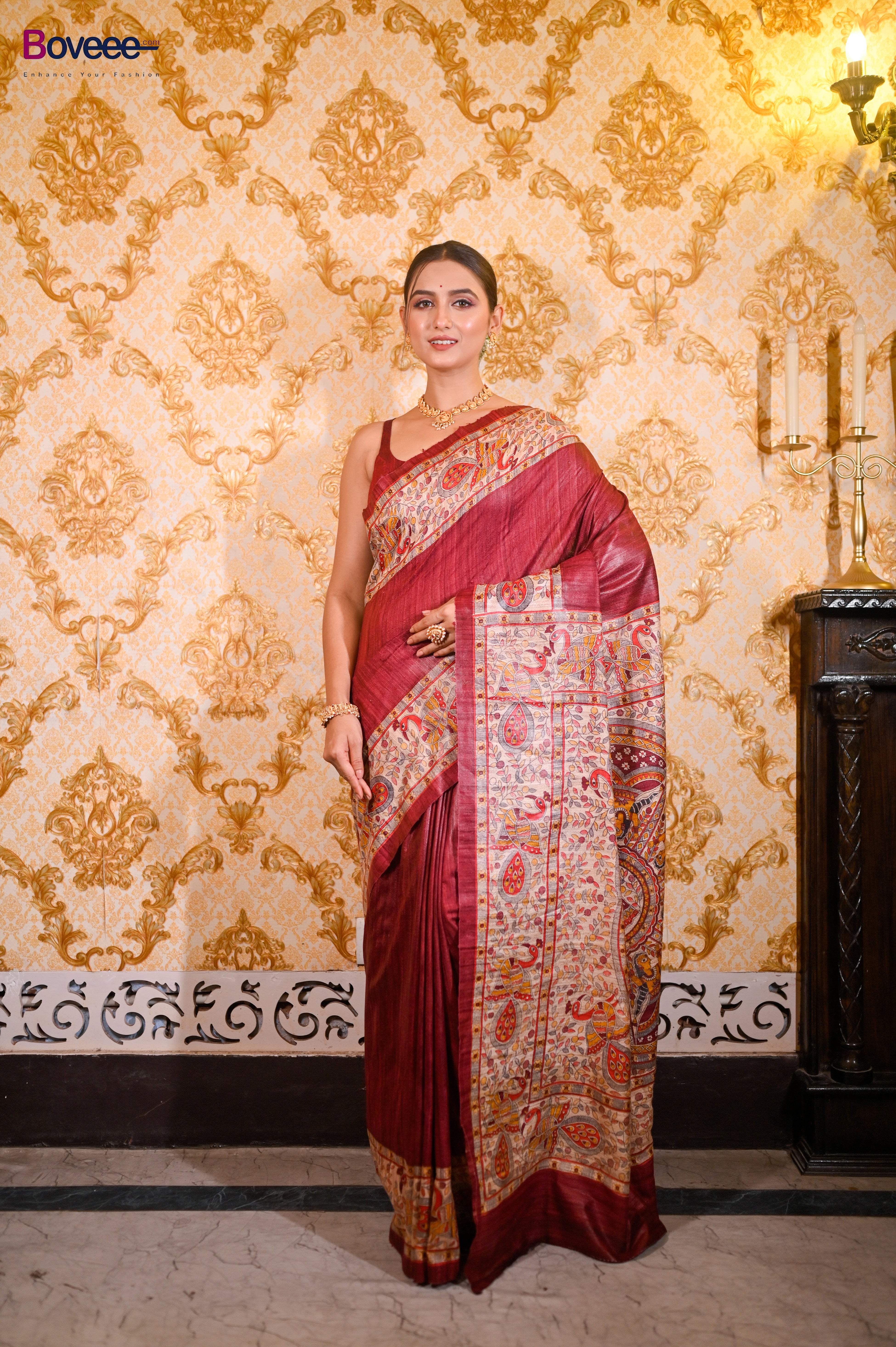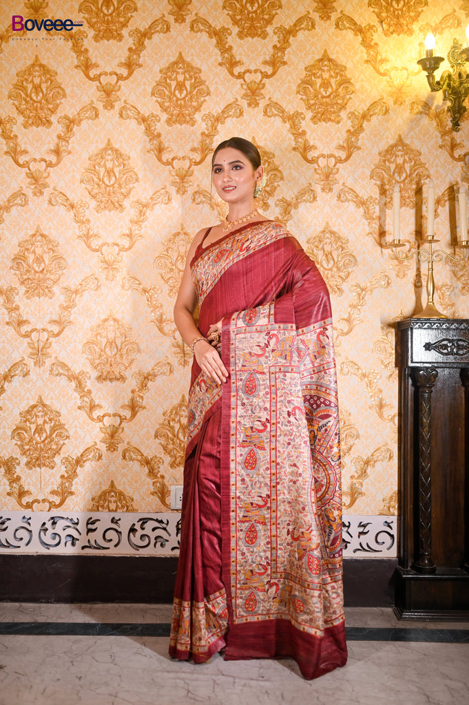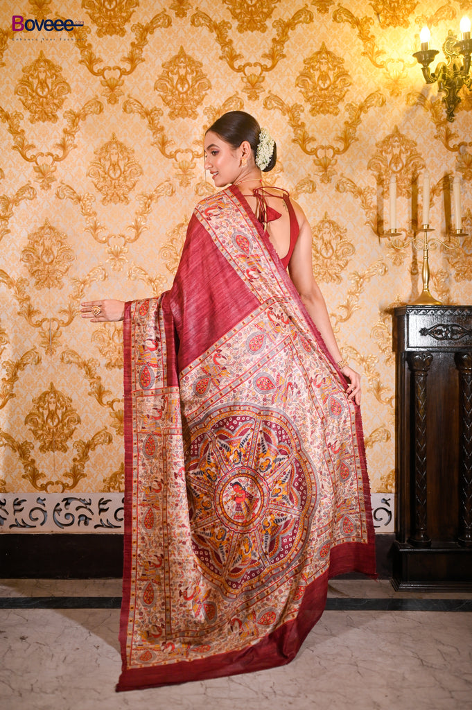 MAROON BISHNUPURI GHICHA TUSSAR SILK SAREE WITH MULTICOLOR MADHUBANI HAND PAINTED DESIGN