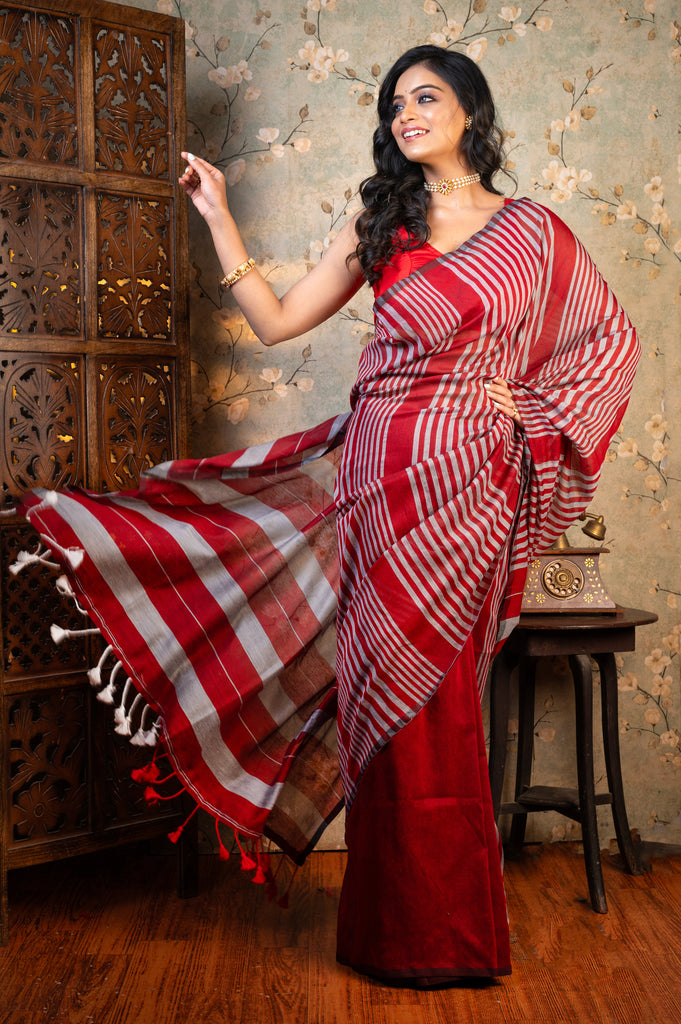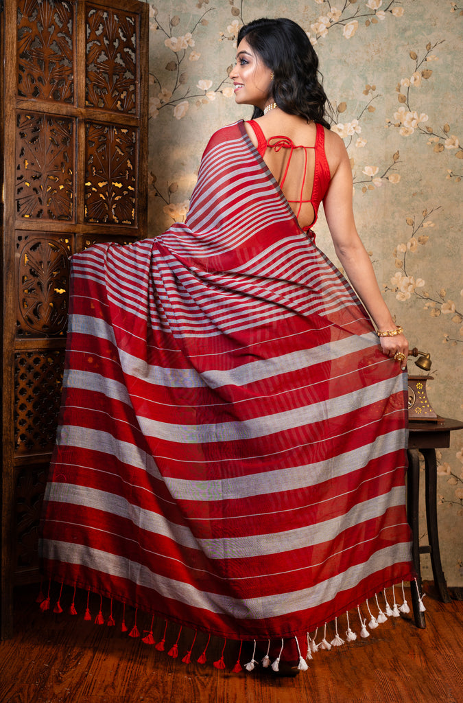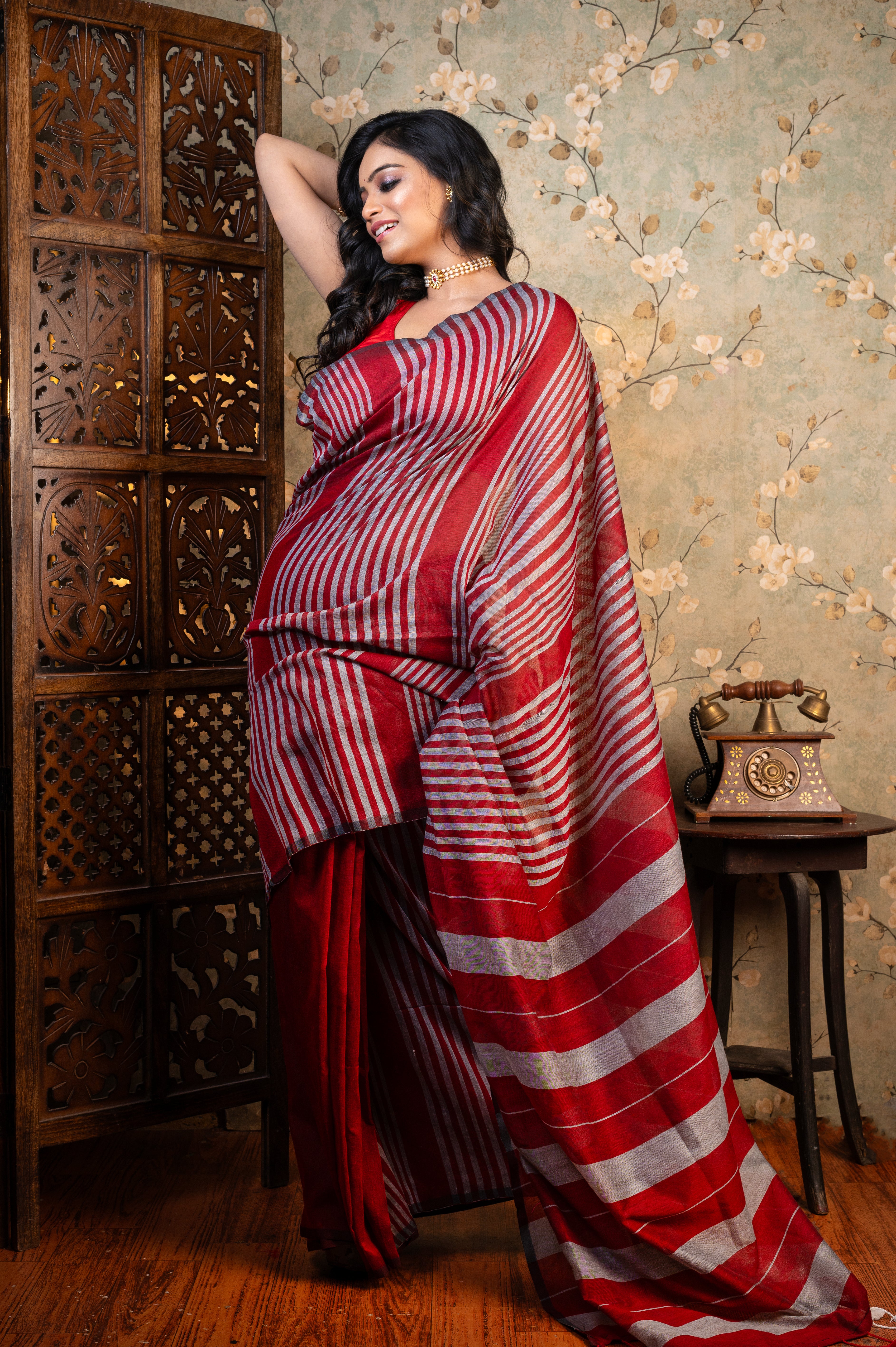 MAROON HANDLOOM COTTON SAREE WITH GREY STRIPE PALLU