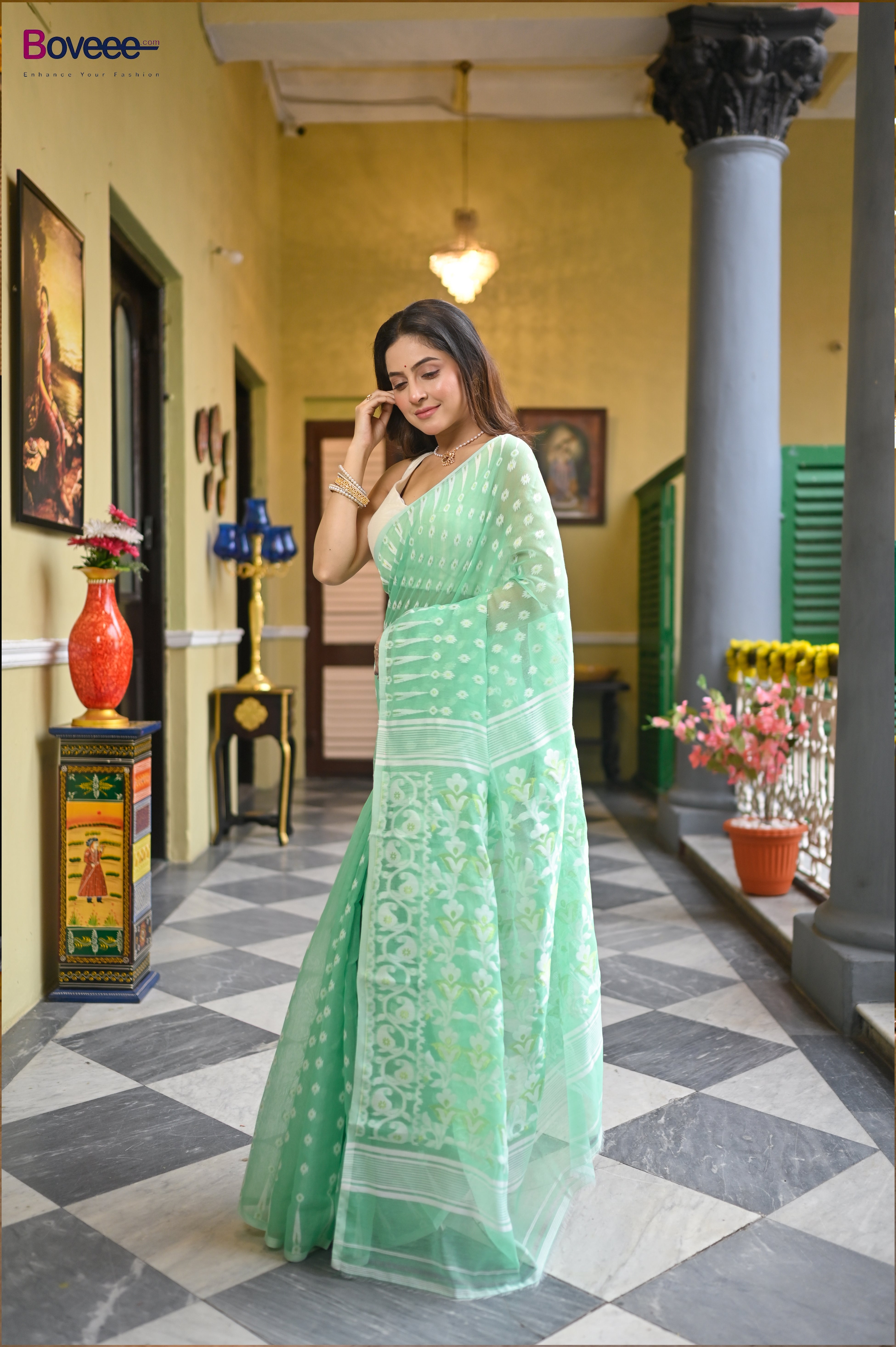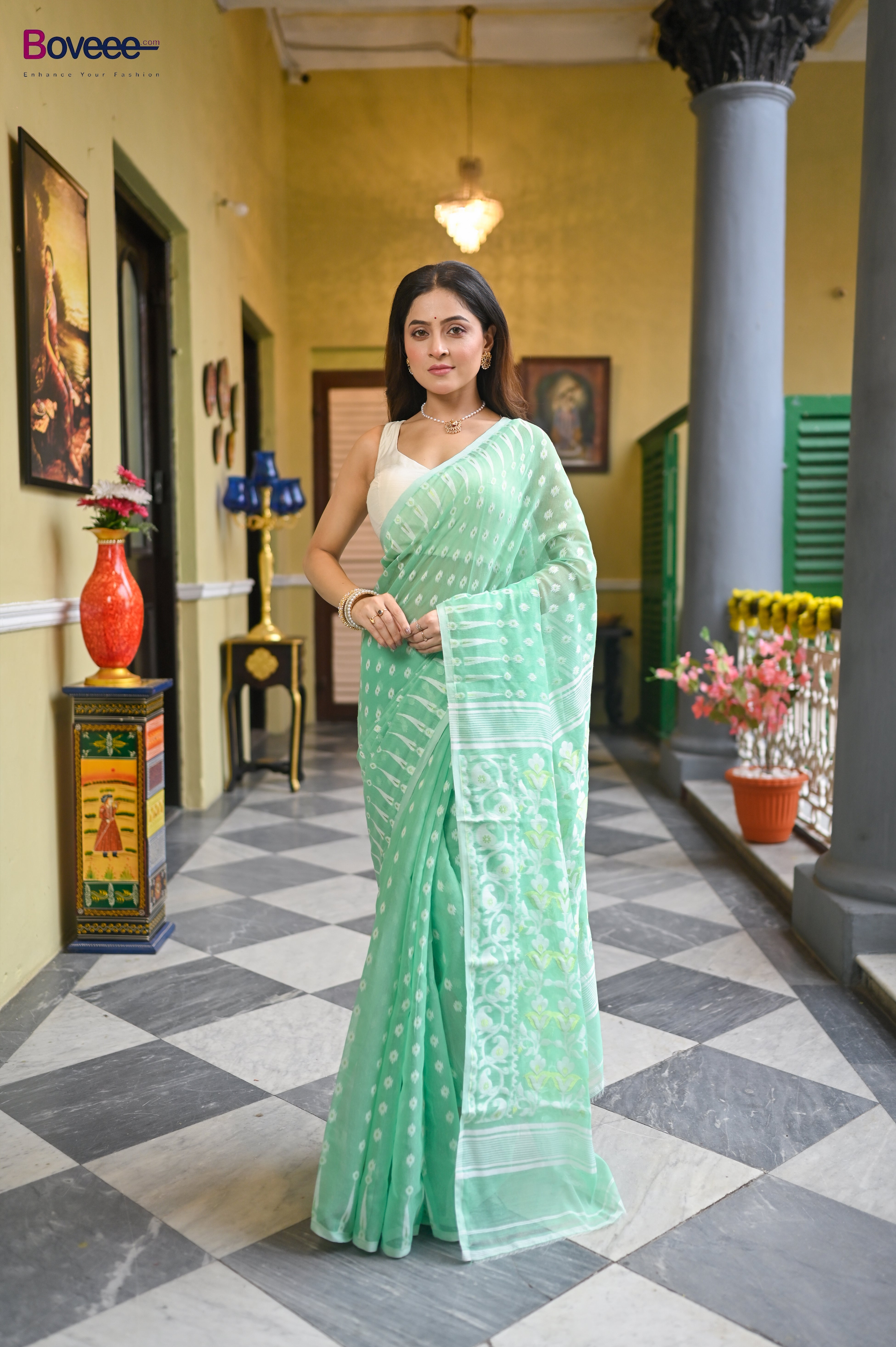 MINT GREEN COTTON JAMDANI SAREE WITH OFFWHITE WOVEN DESIGN