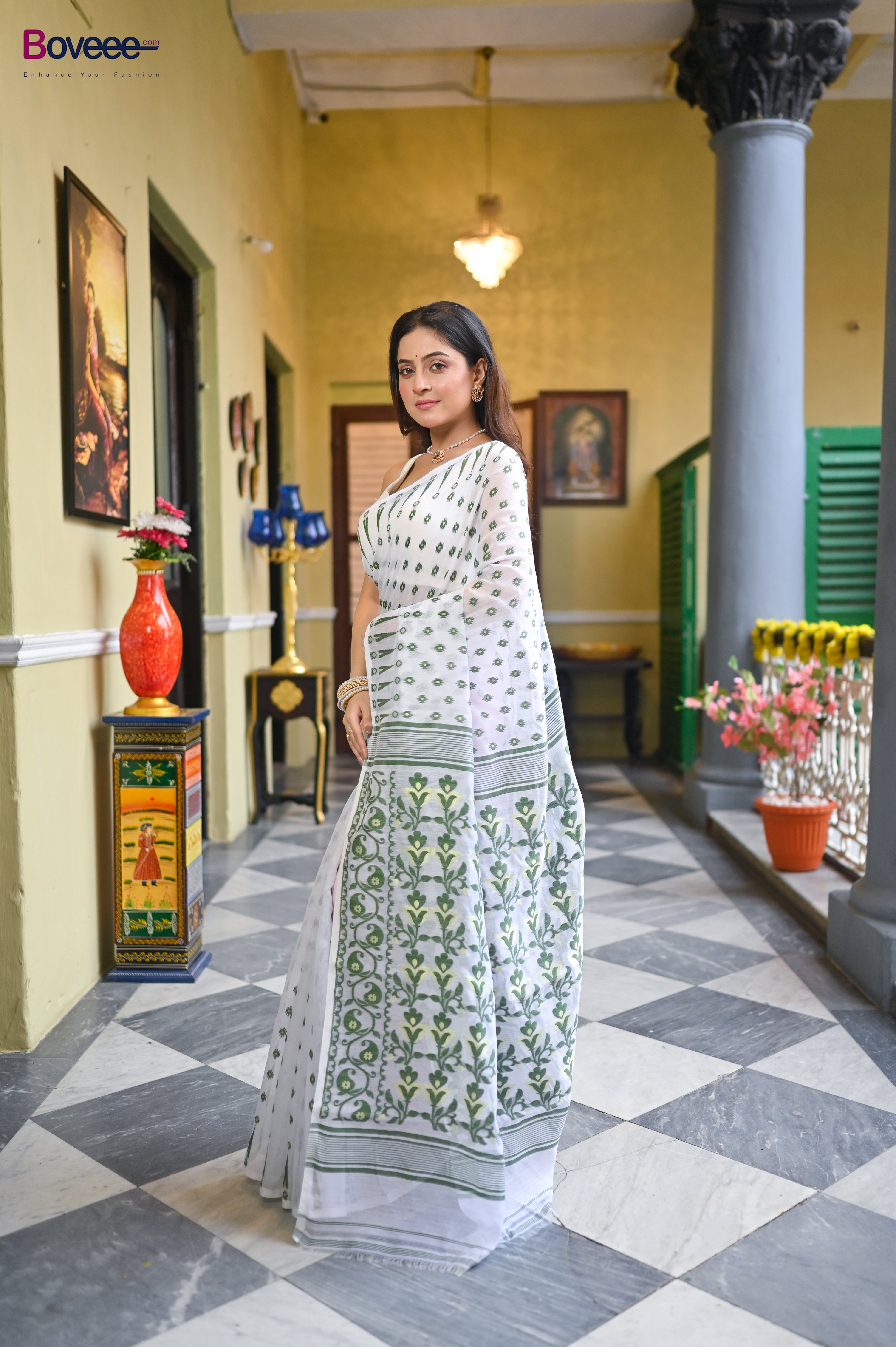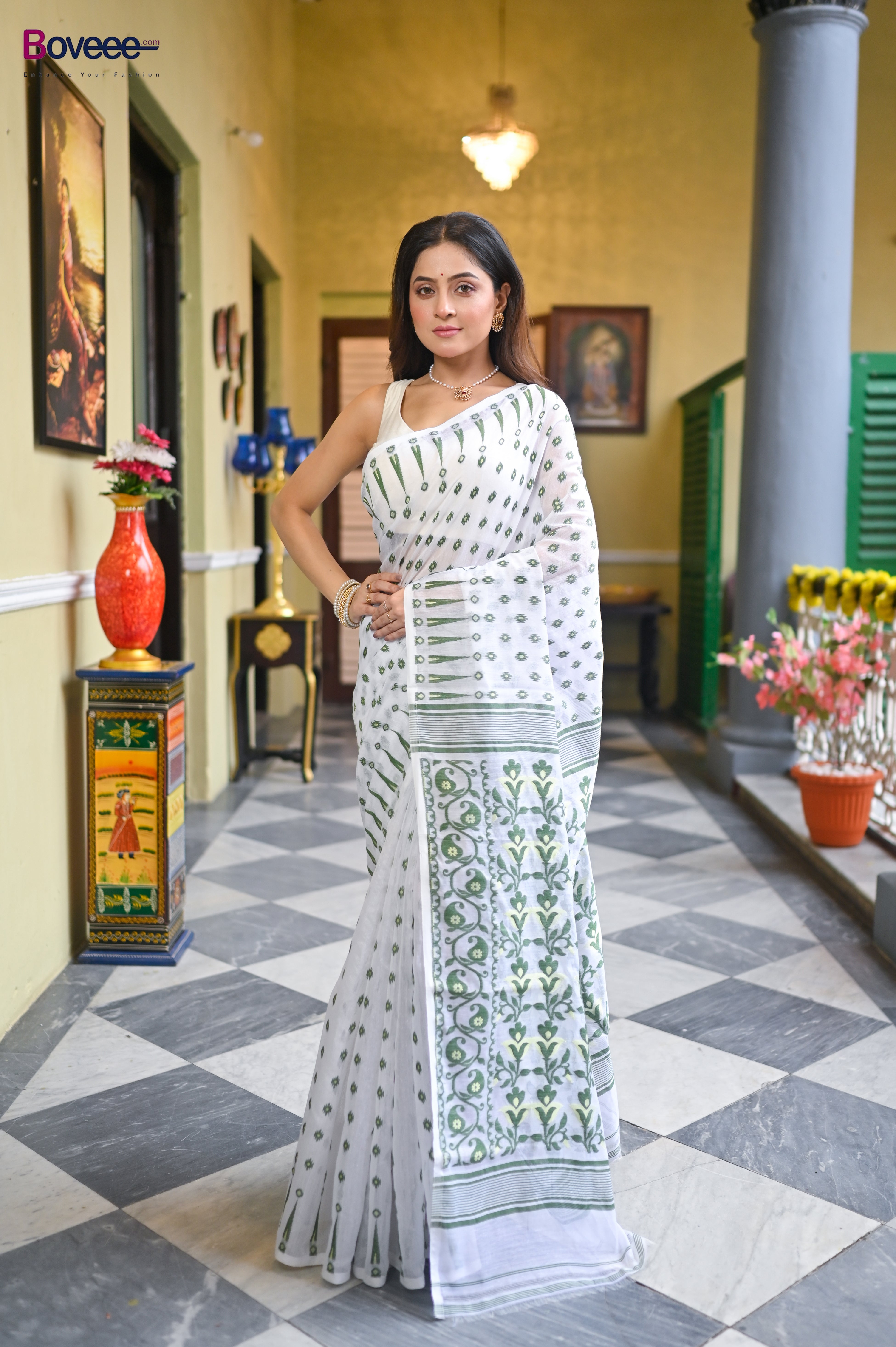 OFFWHITE COTTON JAMDANI SAREE WITH GREEN WOVEN DESIGN