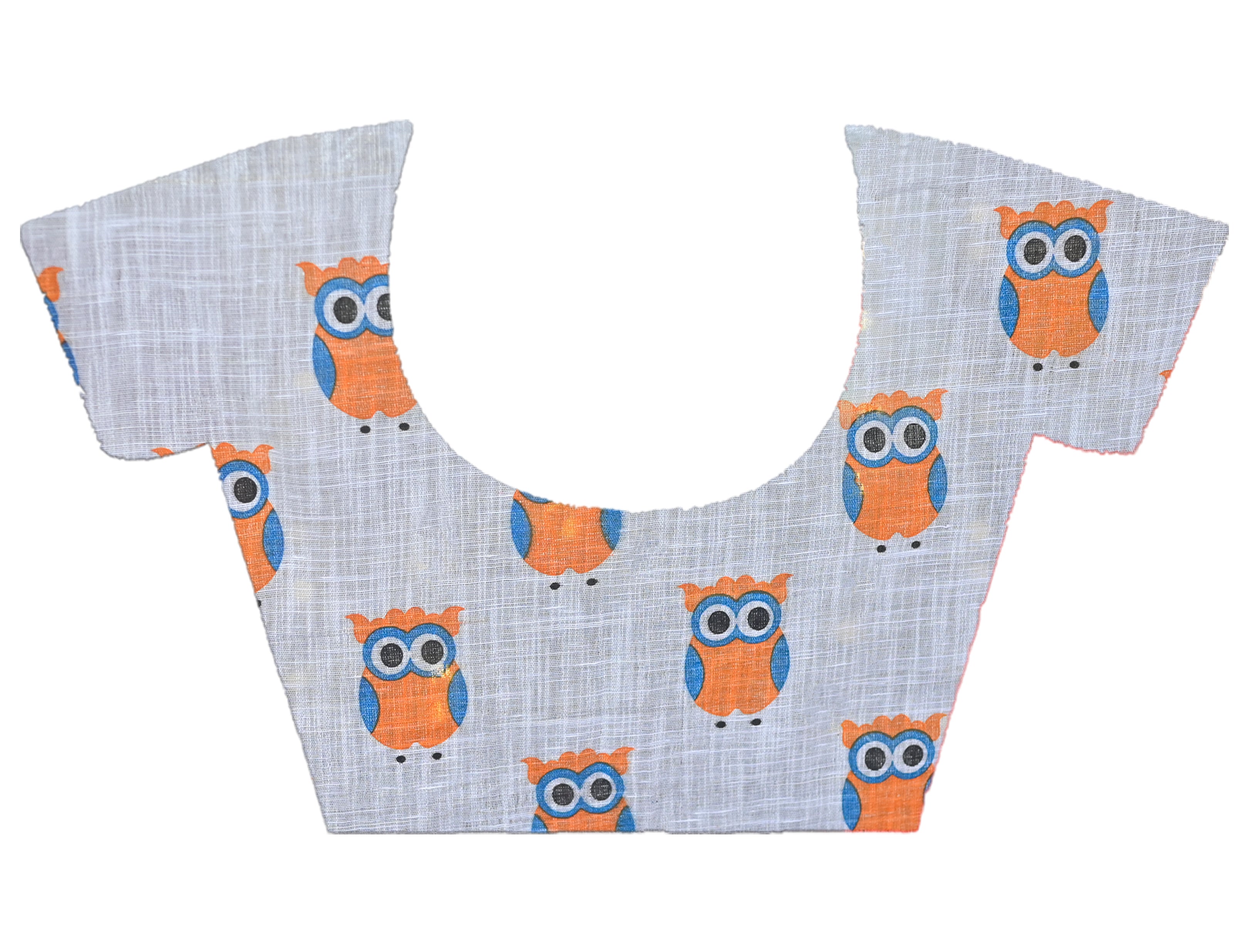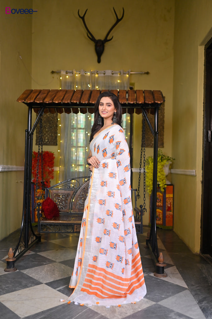 OFFWHITE HANDLOOM LINEN SAREE WITH ORANGE OWL BLOCK PRINTS ALL OVER BODY