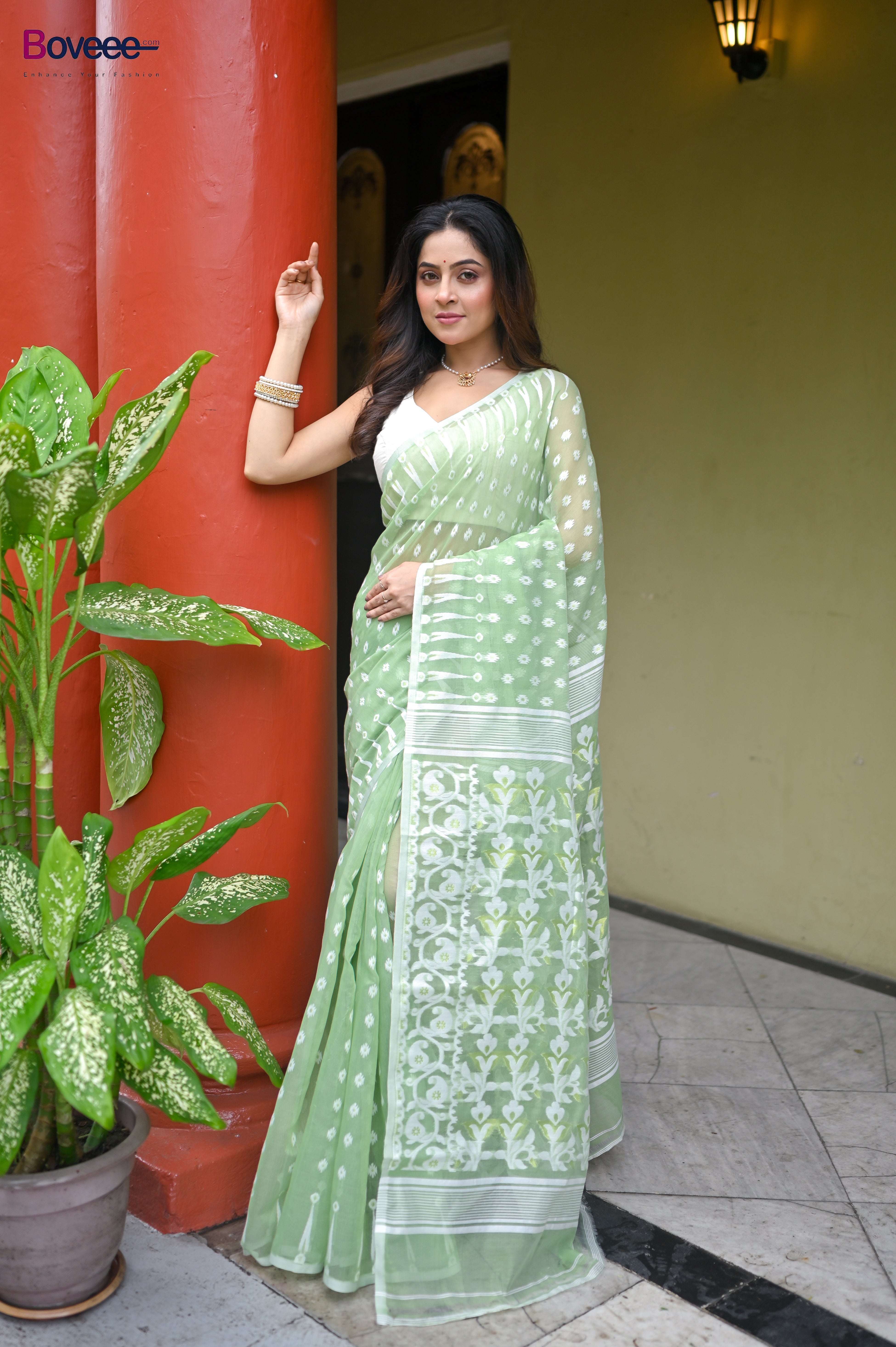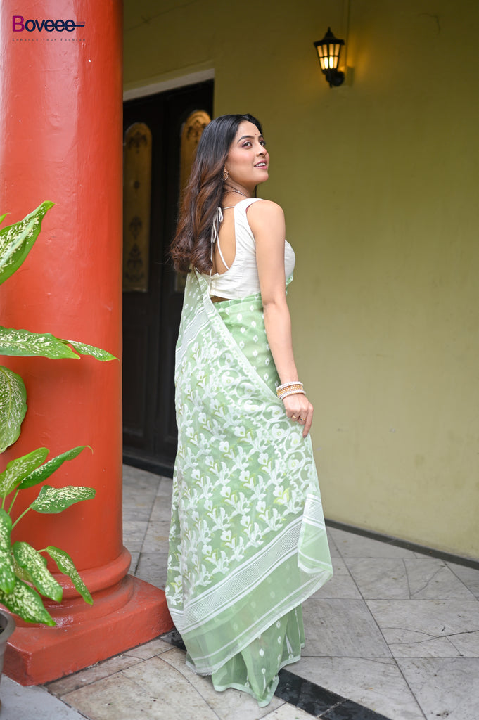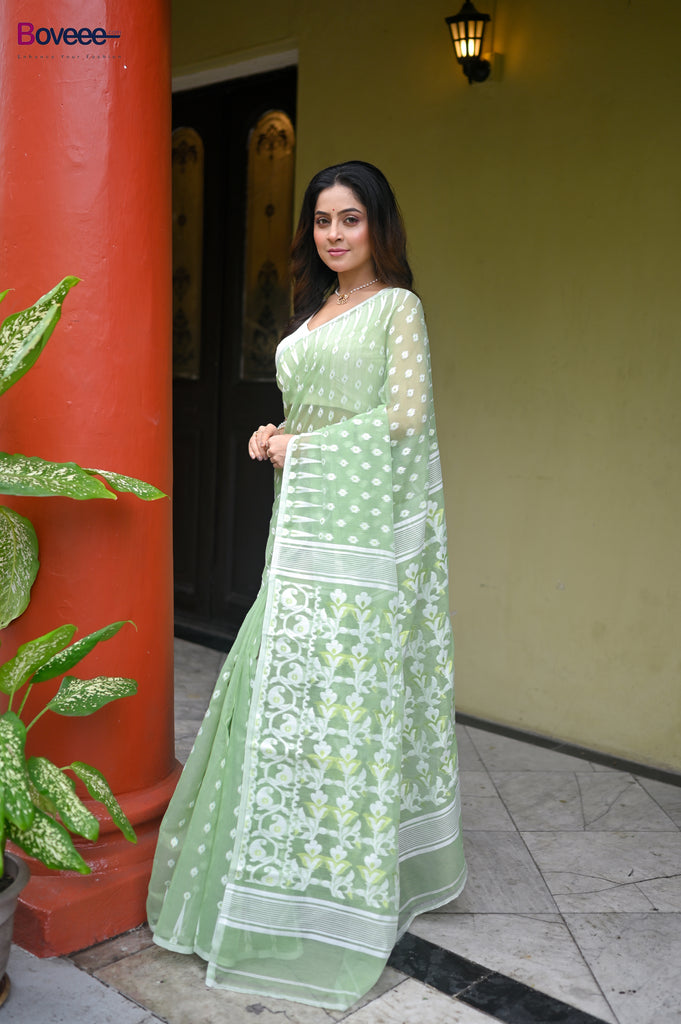 OLIVE GREEN COTTON JAMDANI SAREE WITH OFFWHITE WOVEN DESIGN