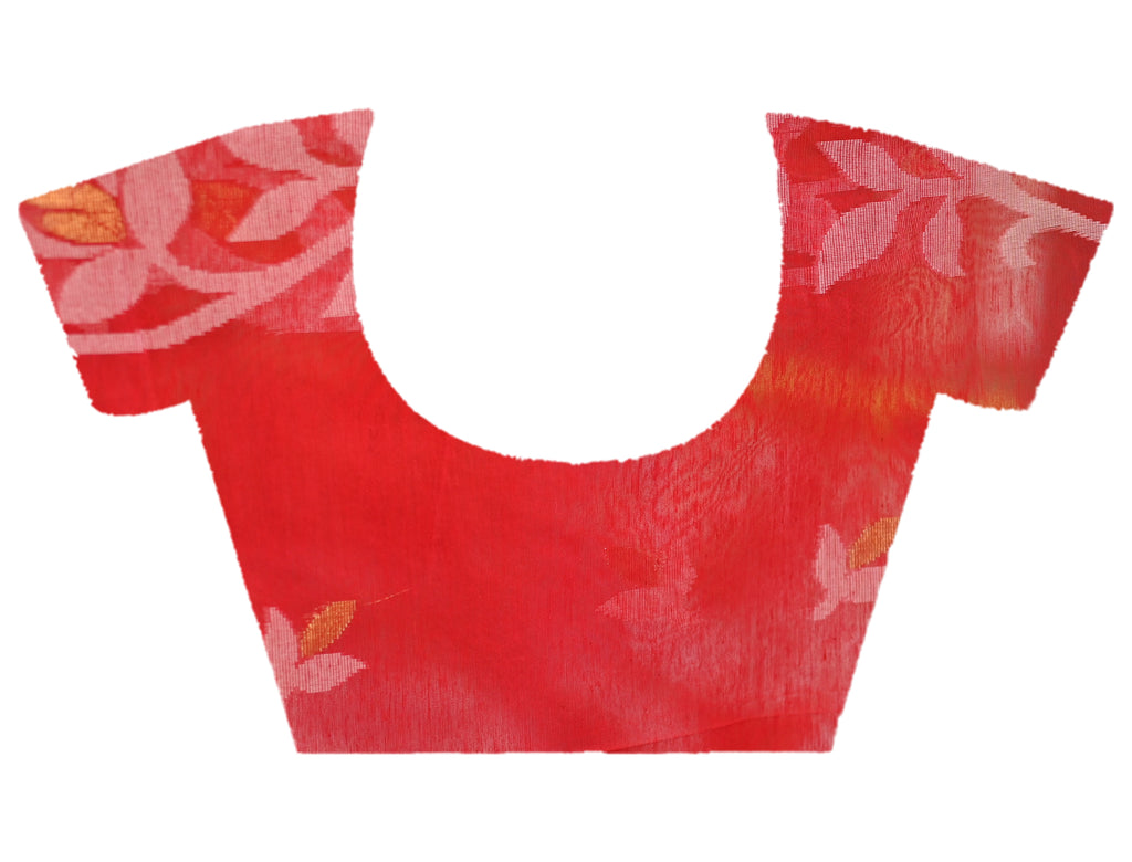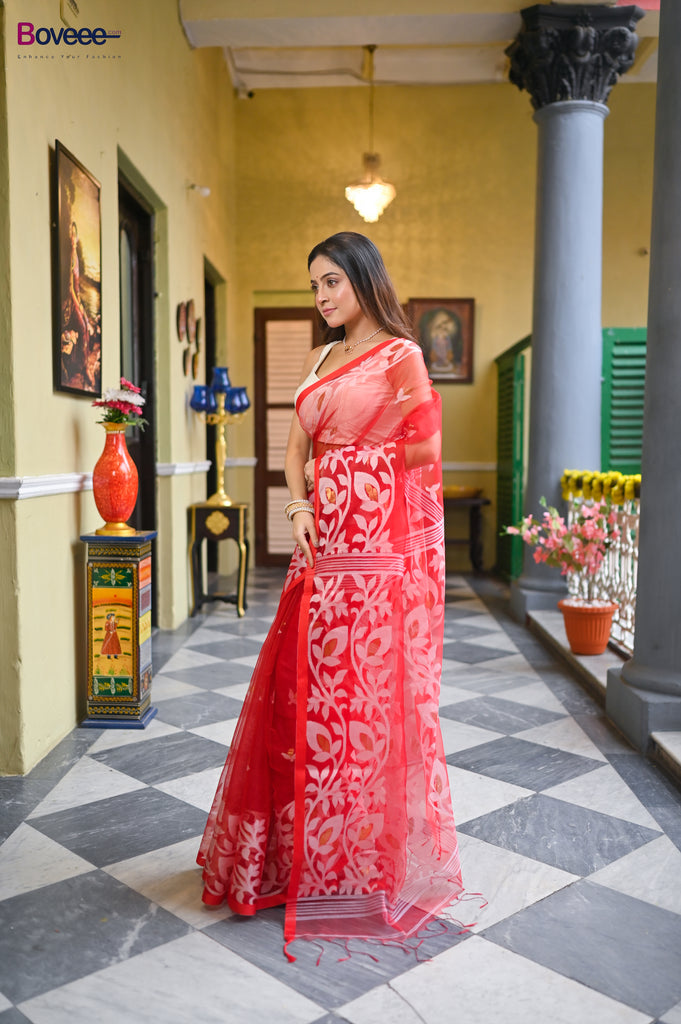 RED PURE MUSLIN SILK SAREE WITH SELF BORDER AND WOVEN MOTIFS