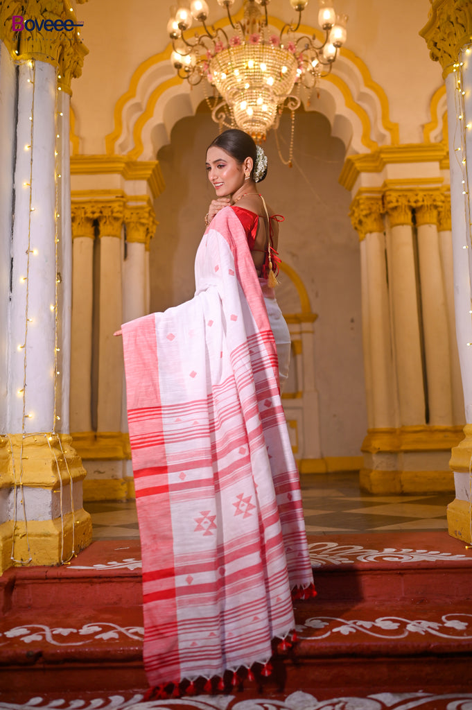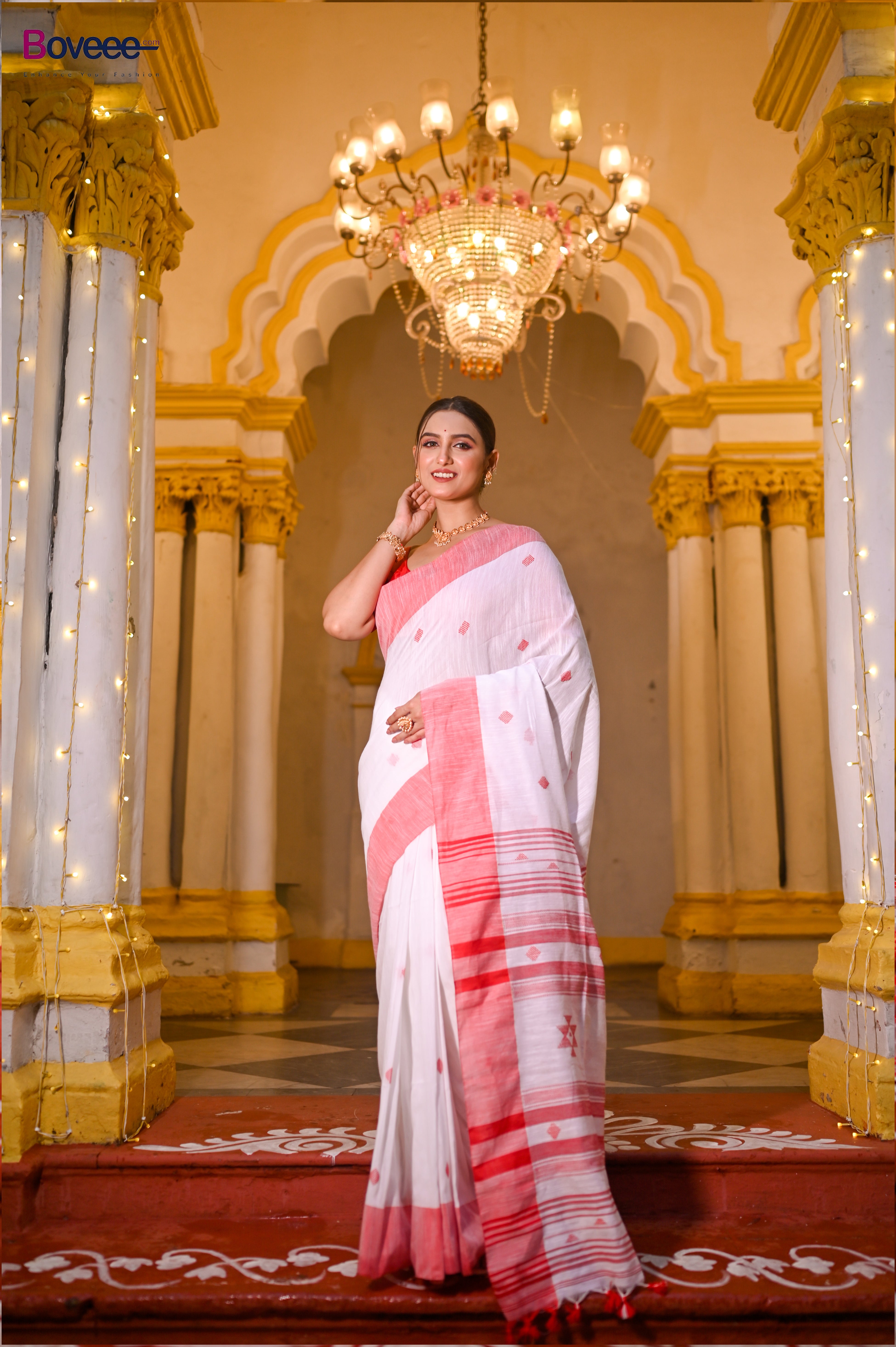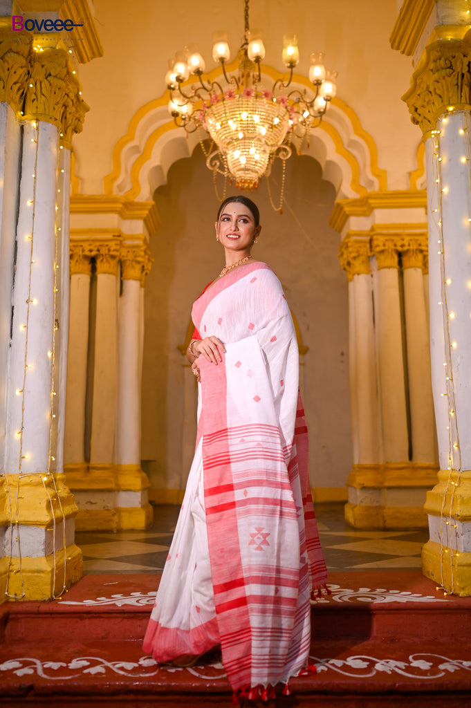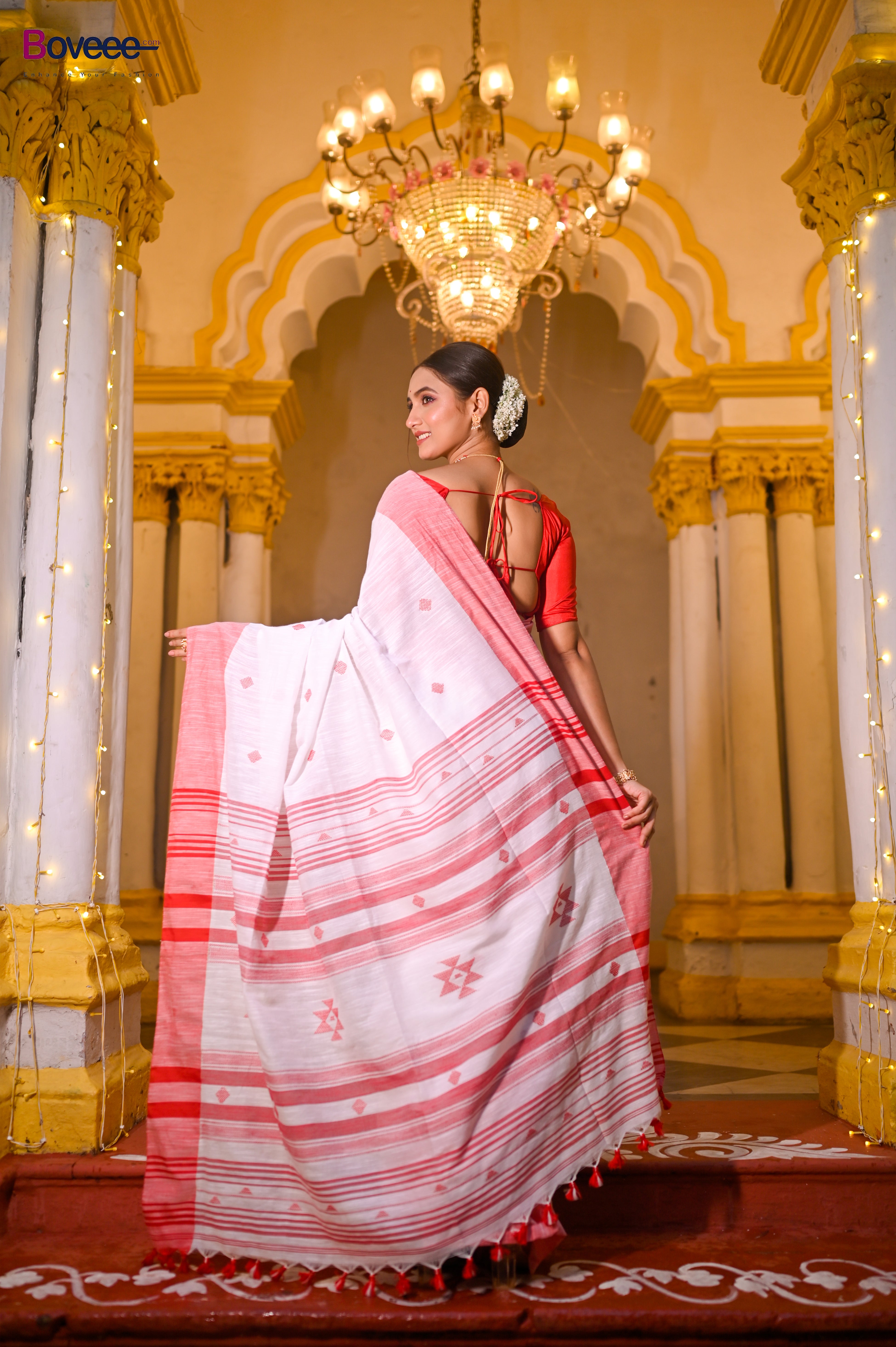WHITE AND RED PURE HANDLOOM COTTON SAREE WITH RED BORDER AND STRIPE