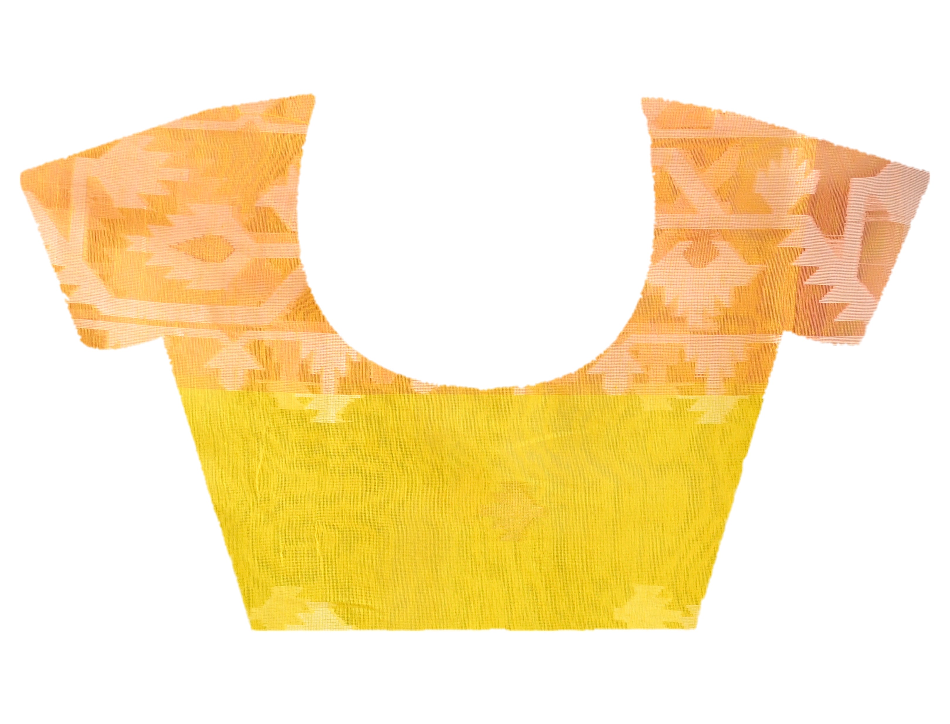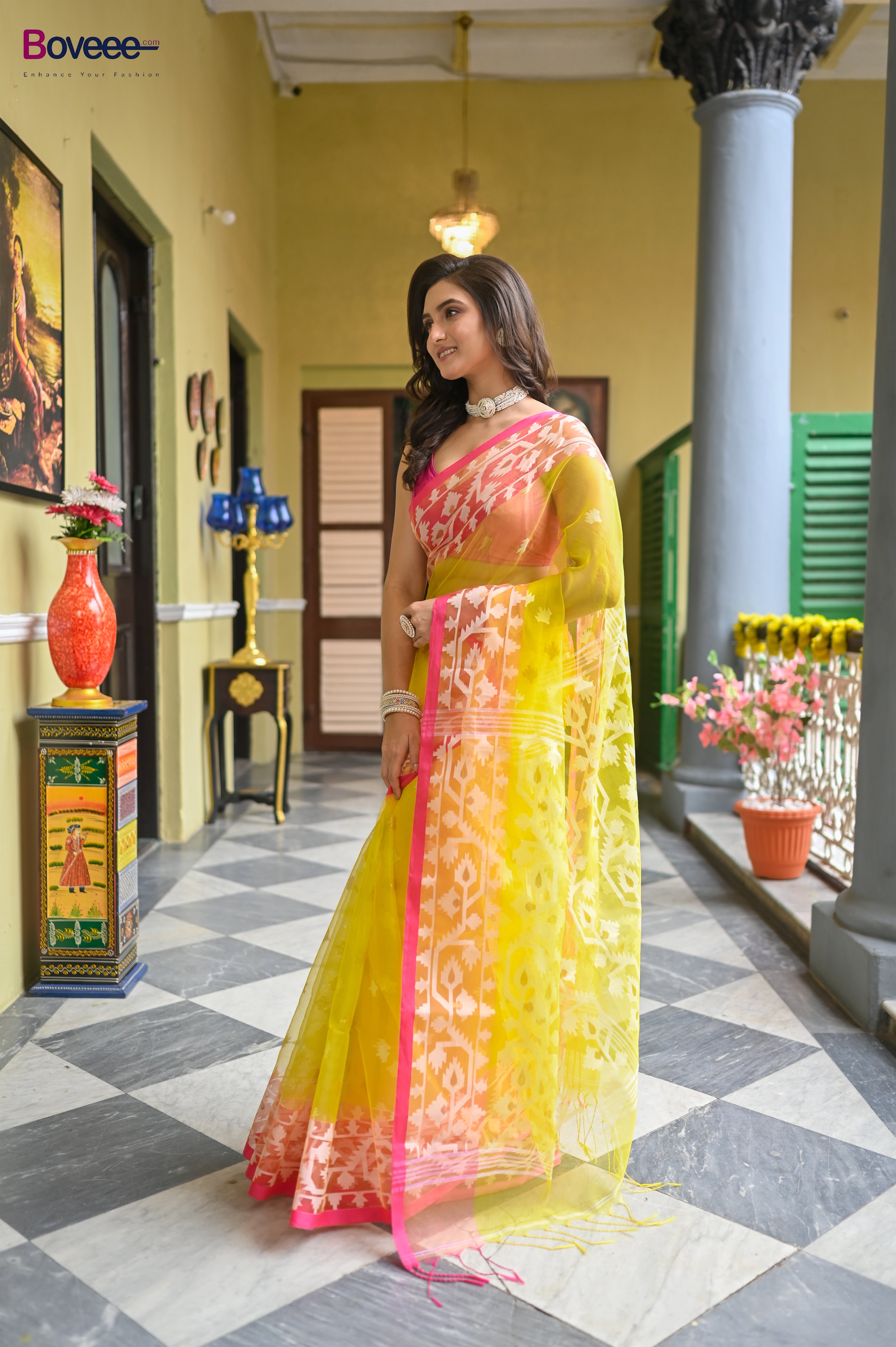 YELLOW PURE MUSLIN SILK SAREE WITH PINK BORDER AND WOVEN MOTIFS