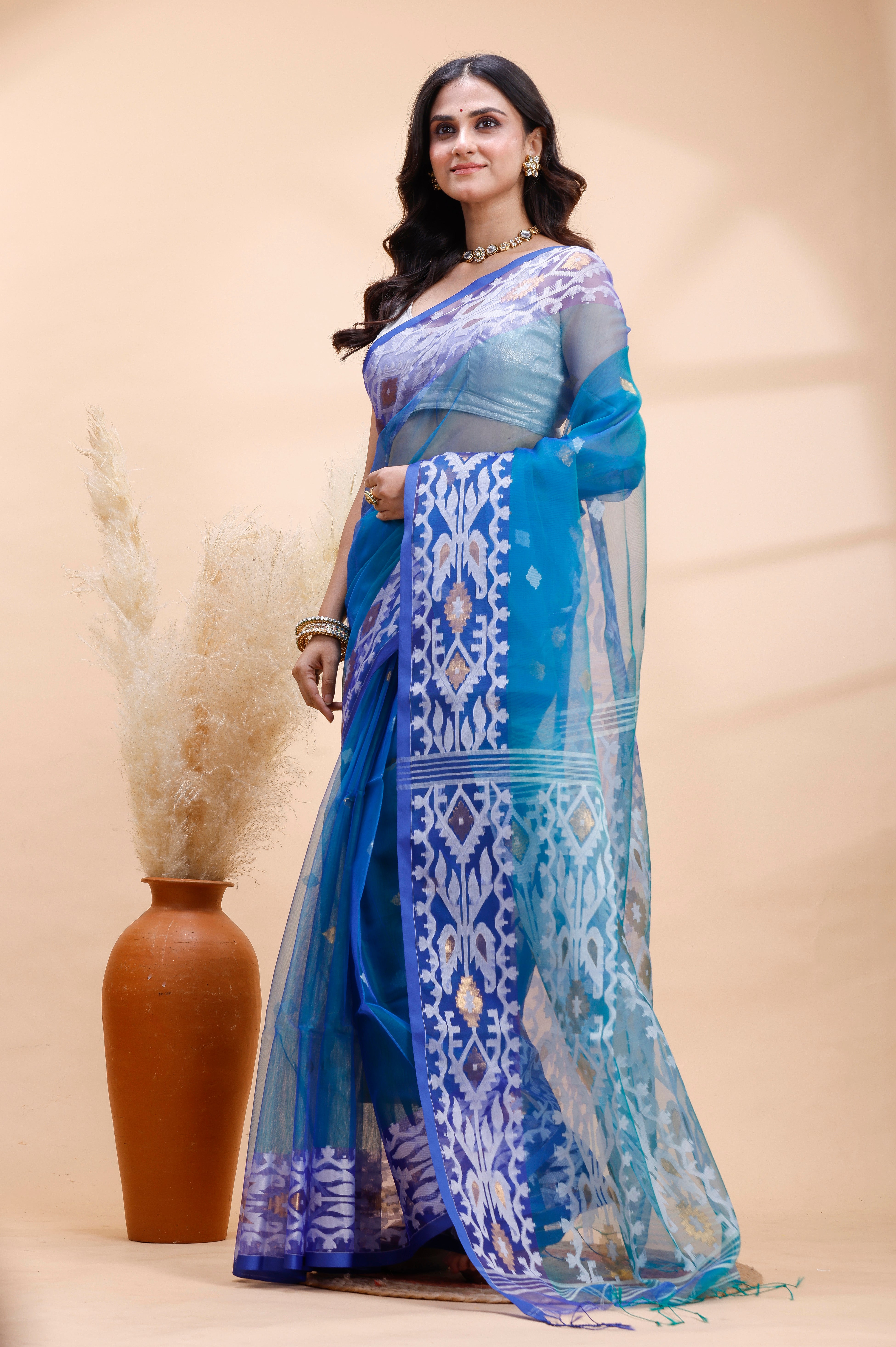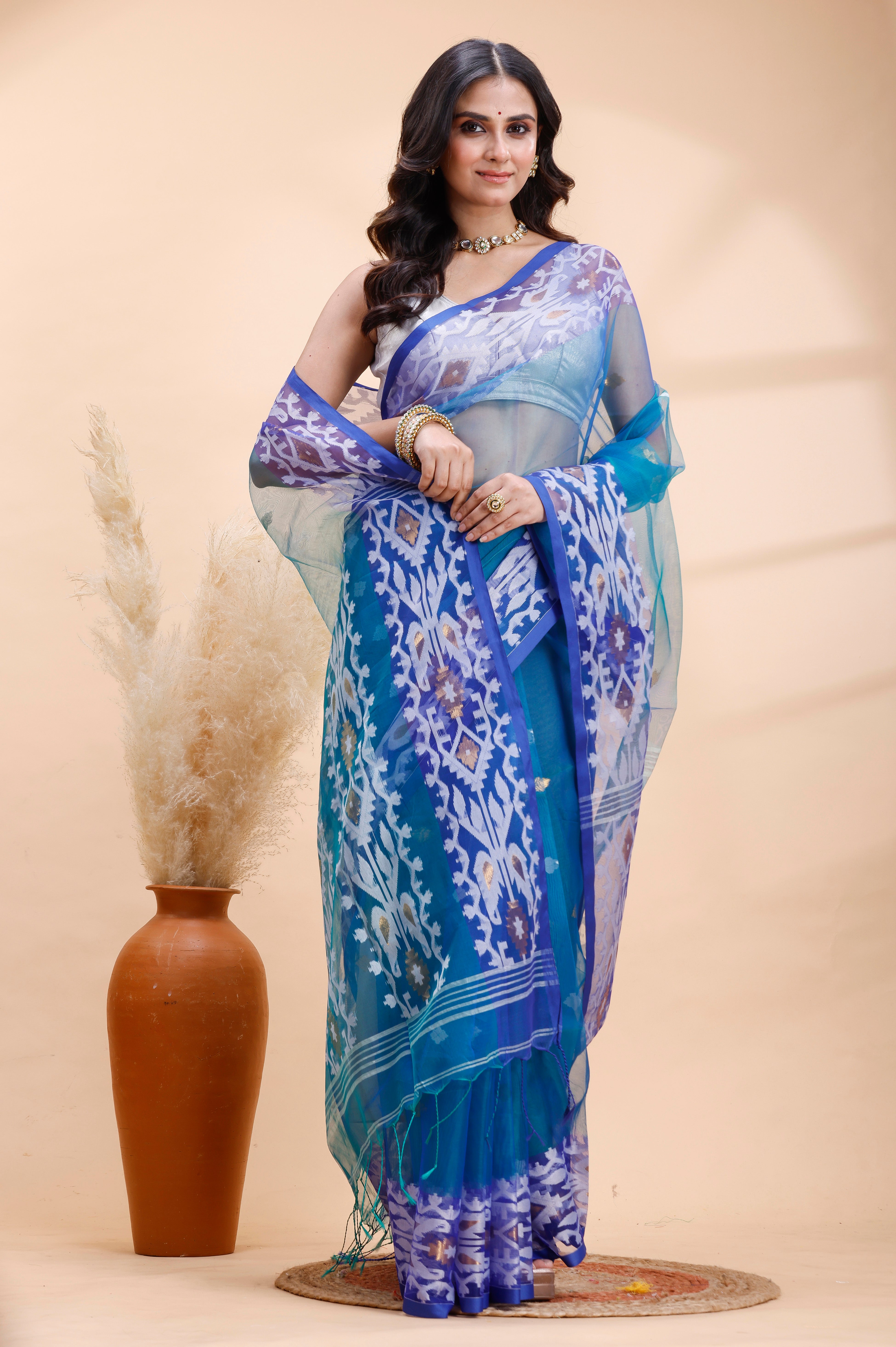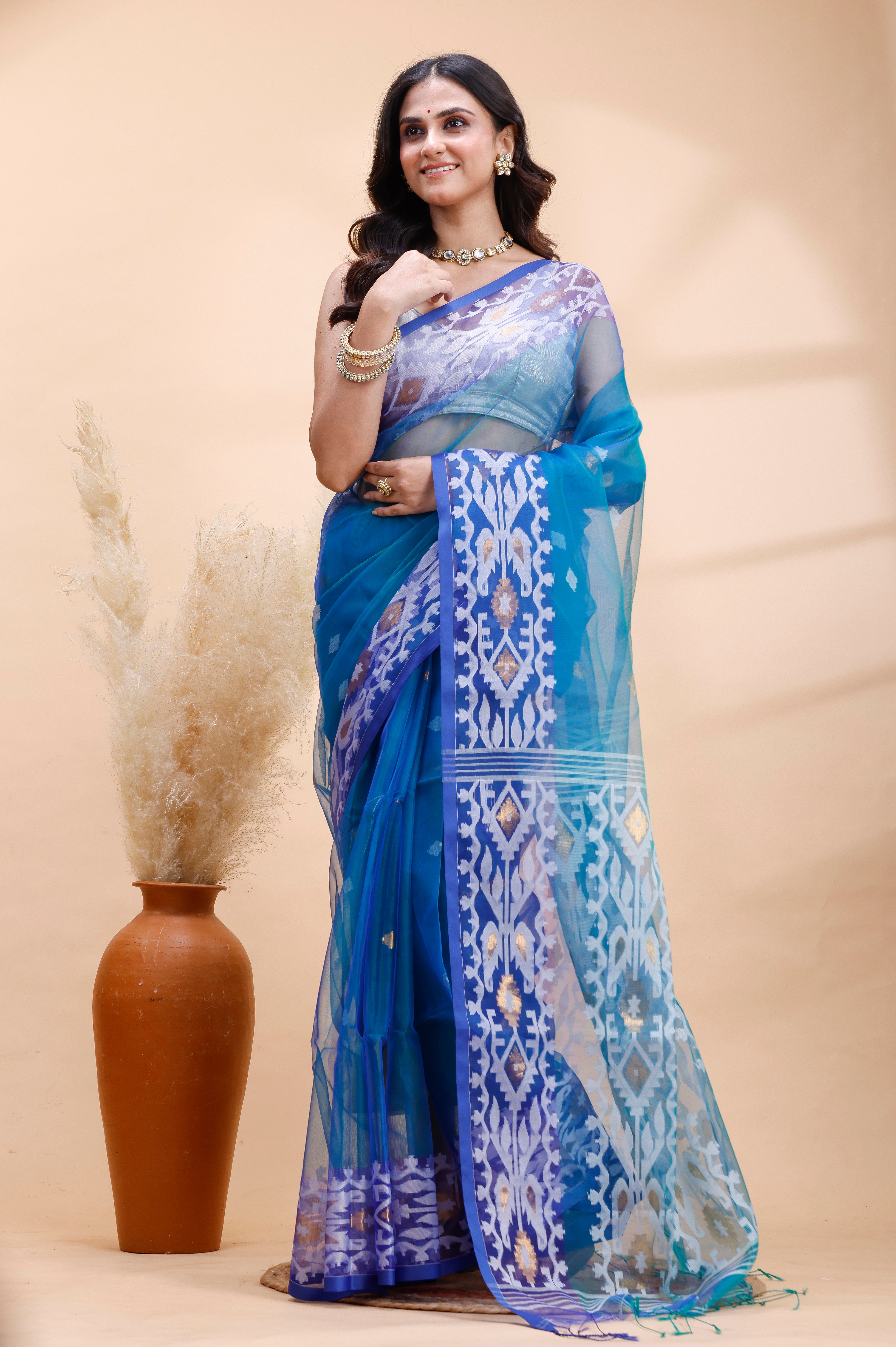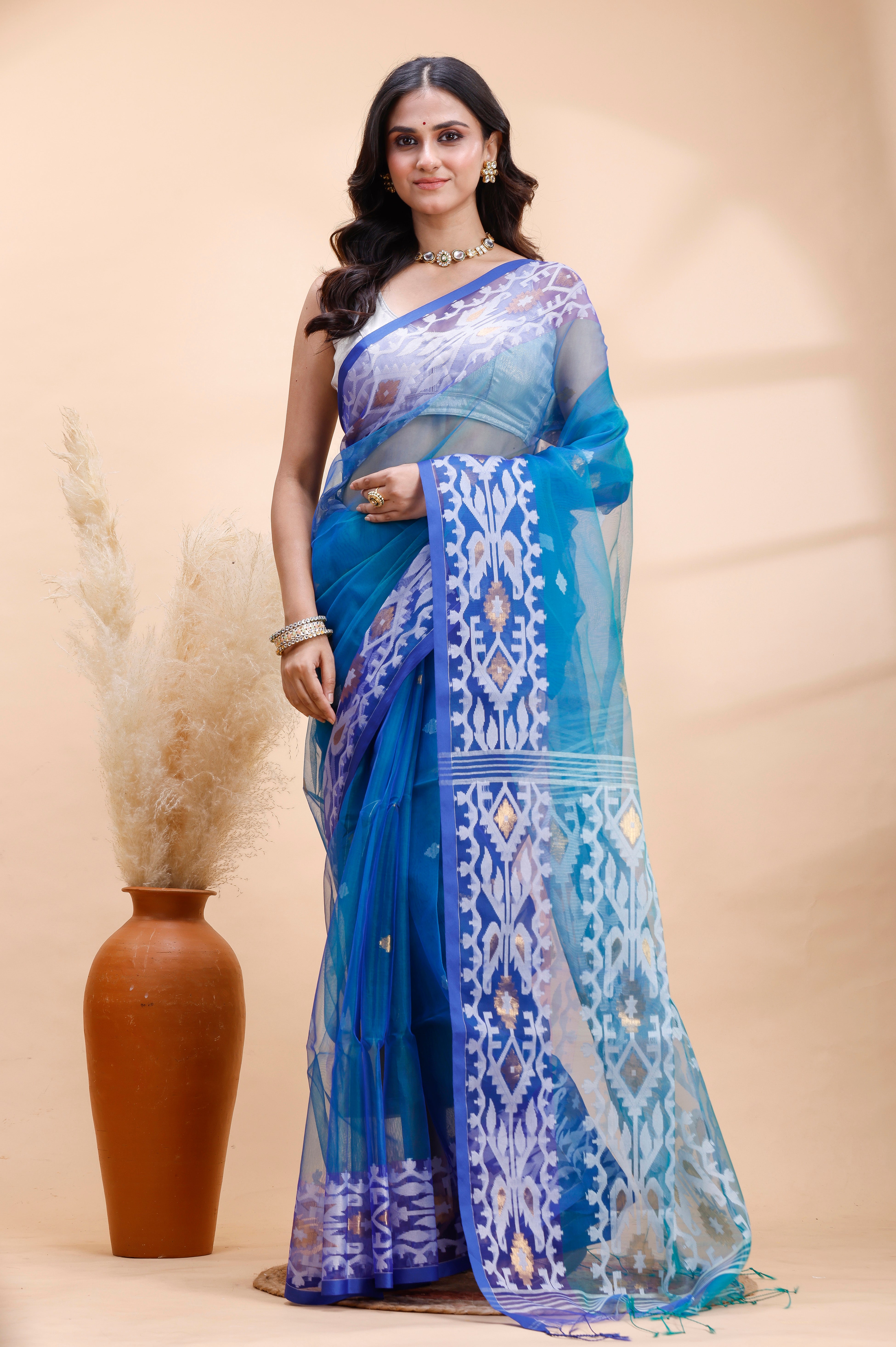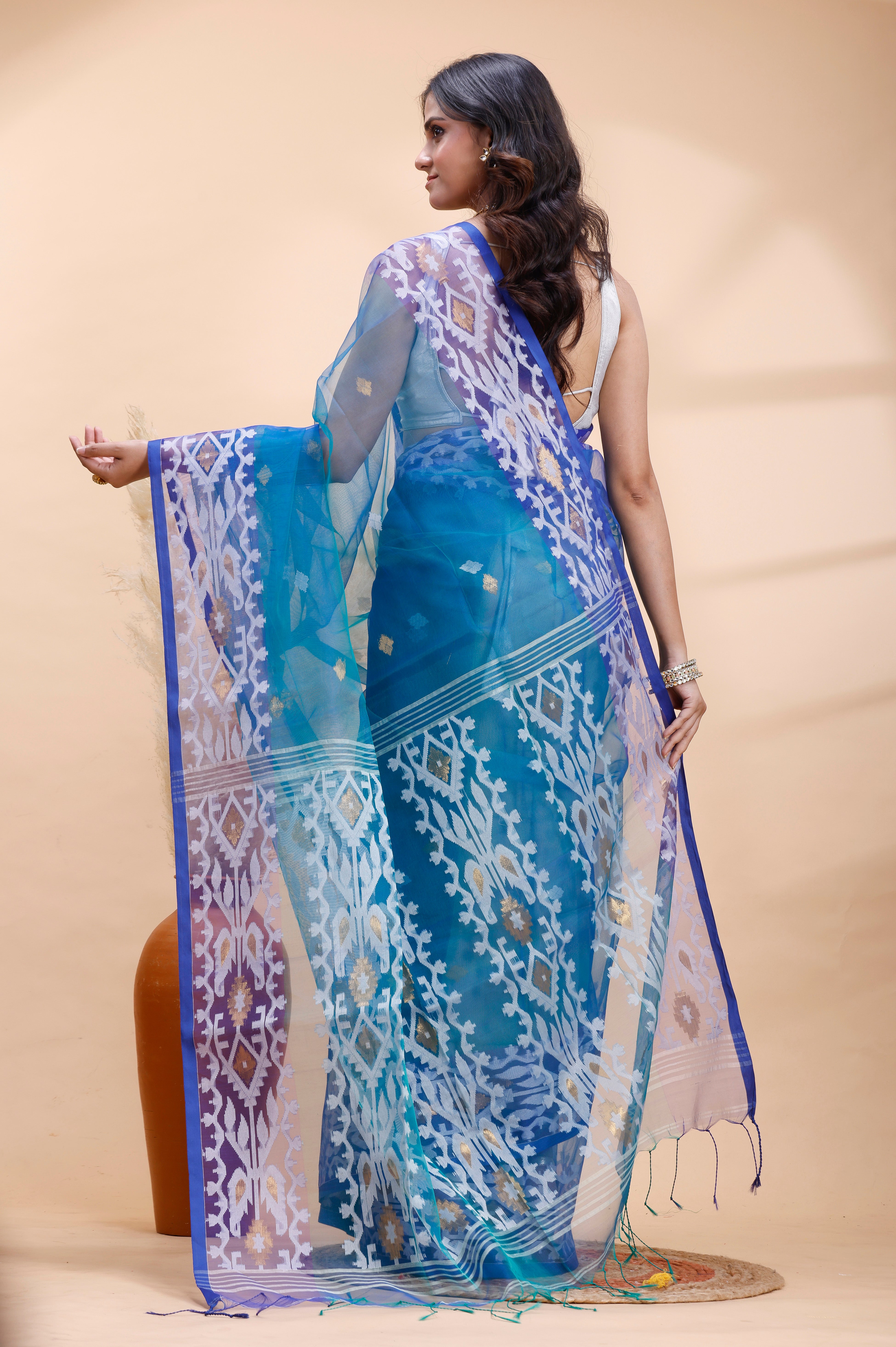 BLUE DUAL TONED MUSLIN SAREE WITH DELICATE JAMDANI MOTIFS AND GRACEFUL CONTRAST BORDER