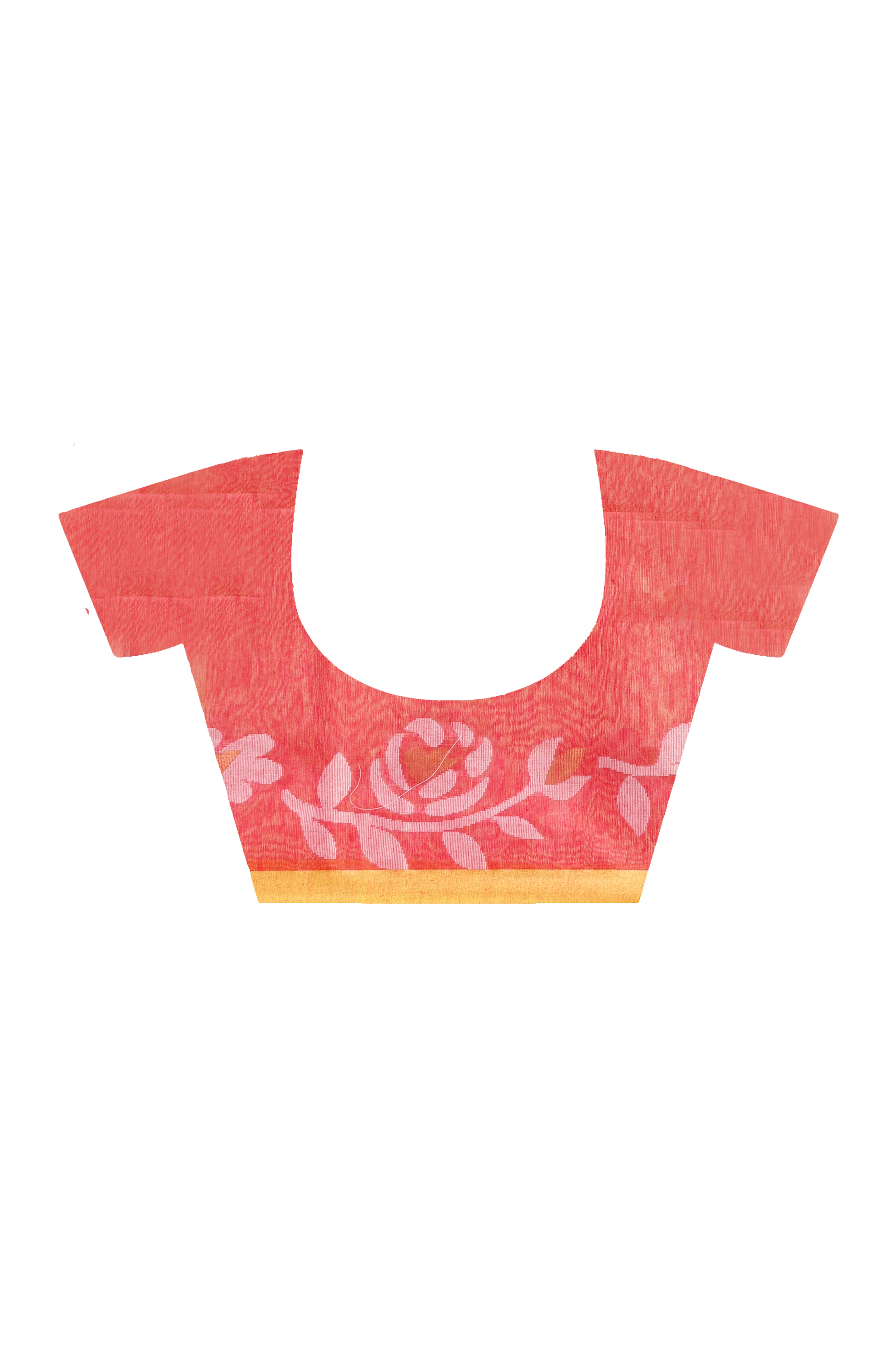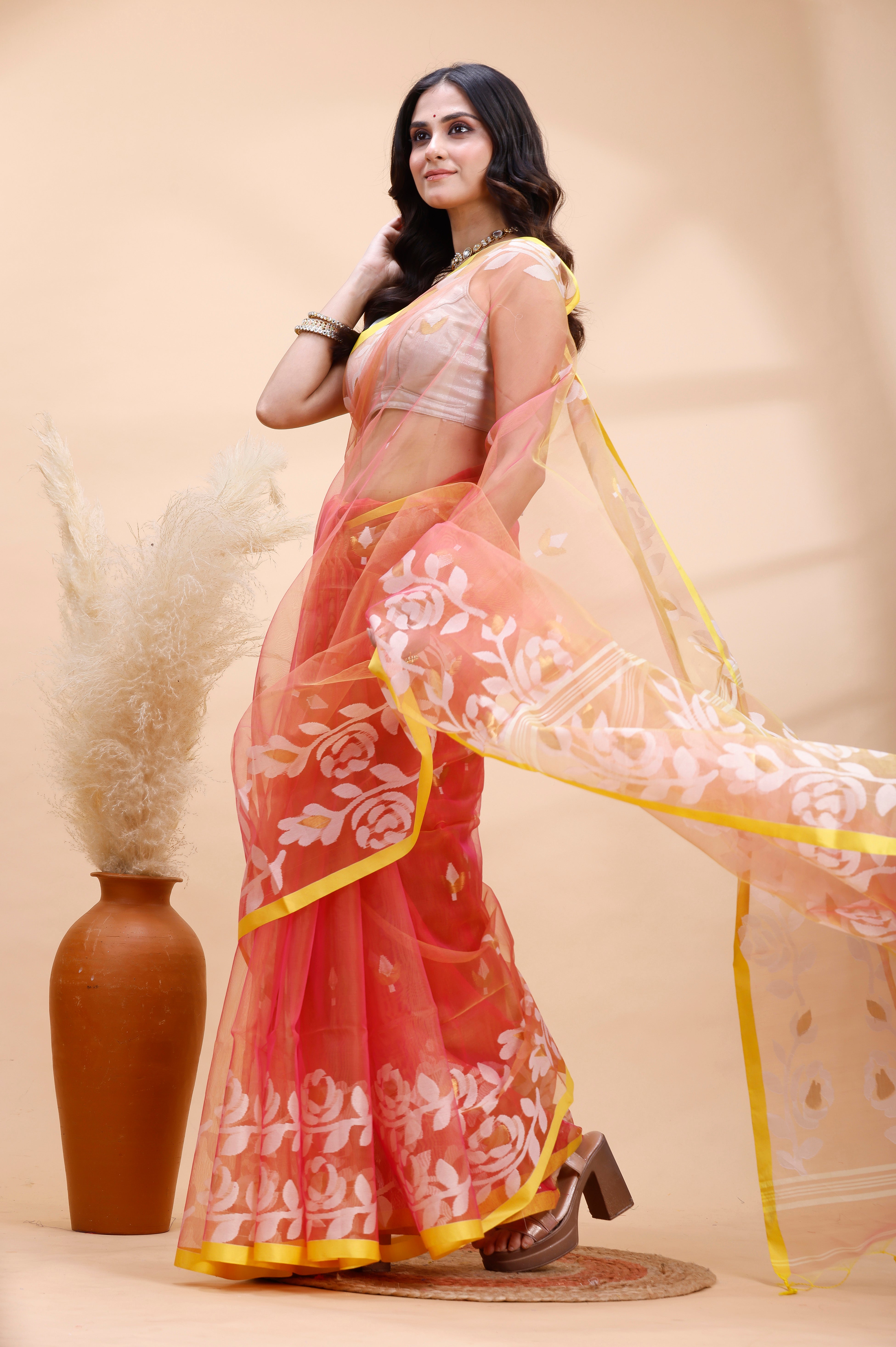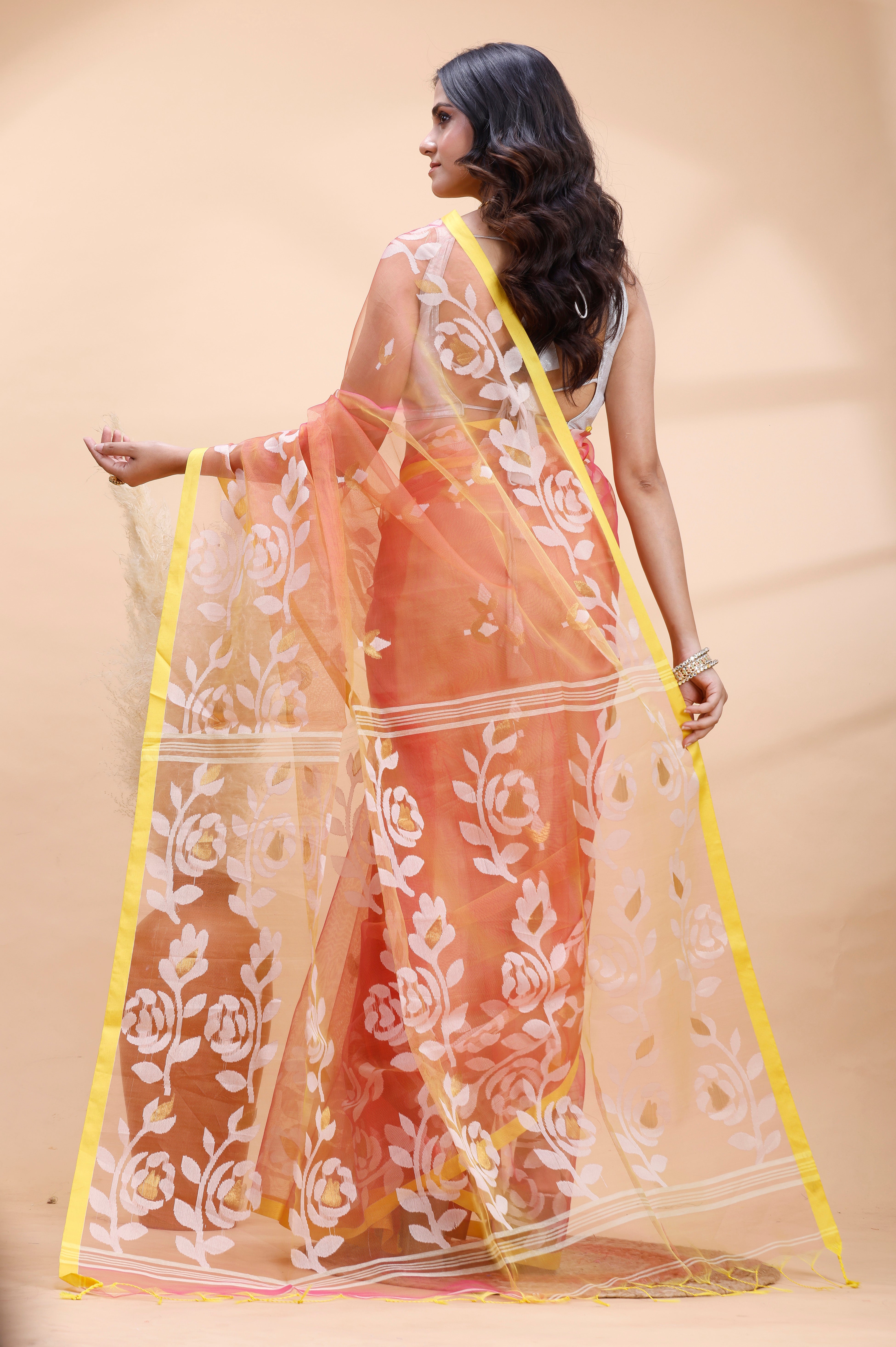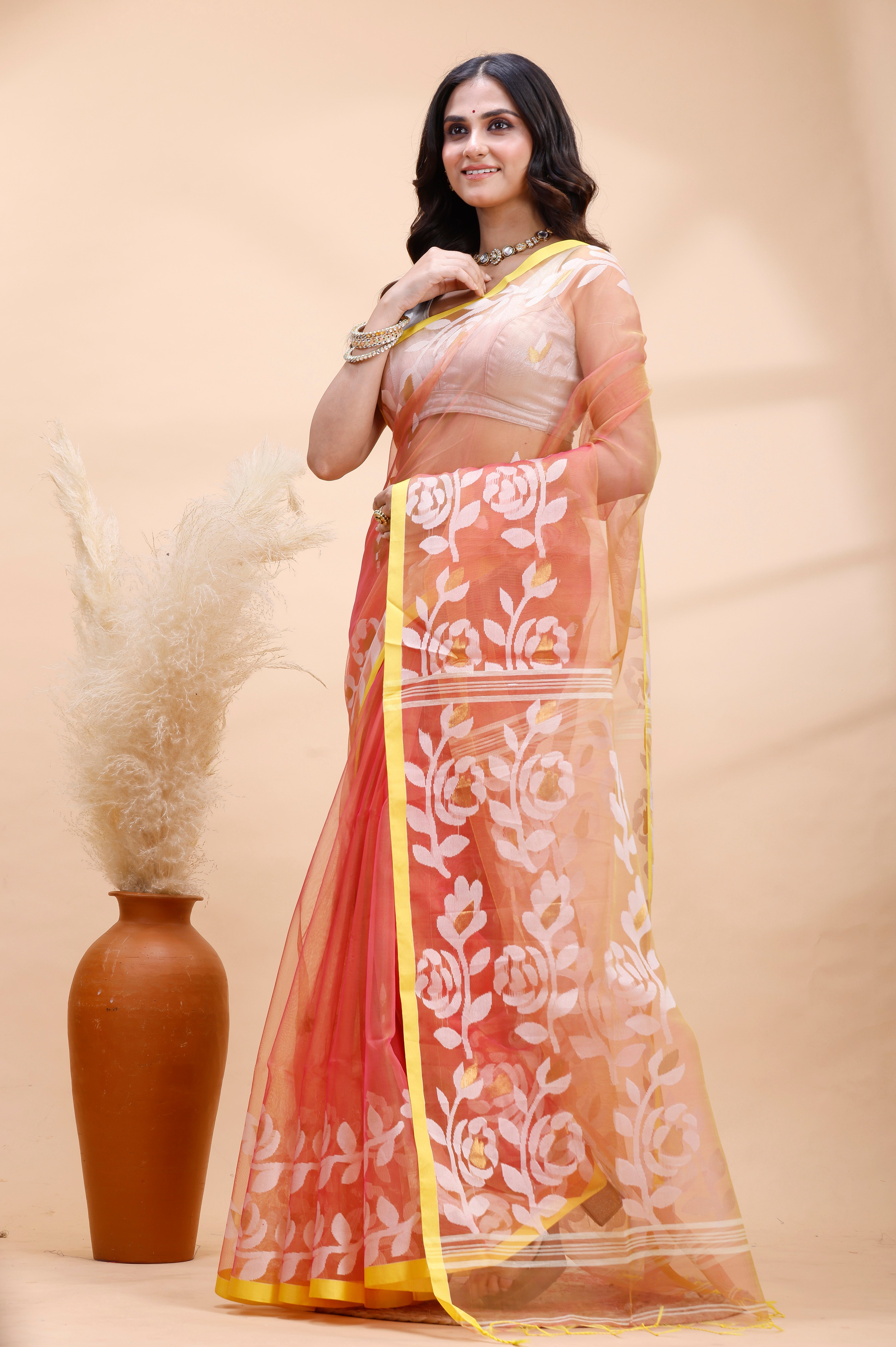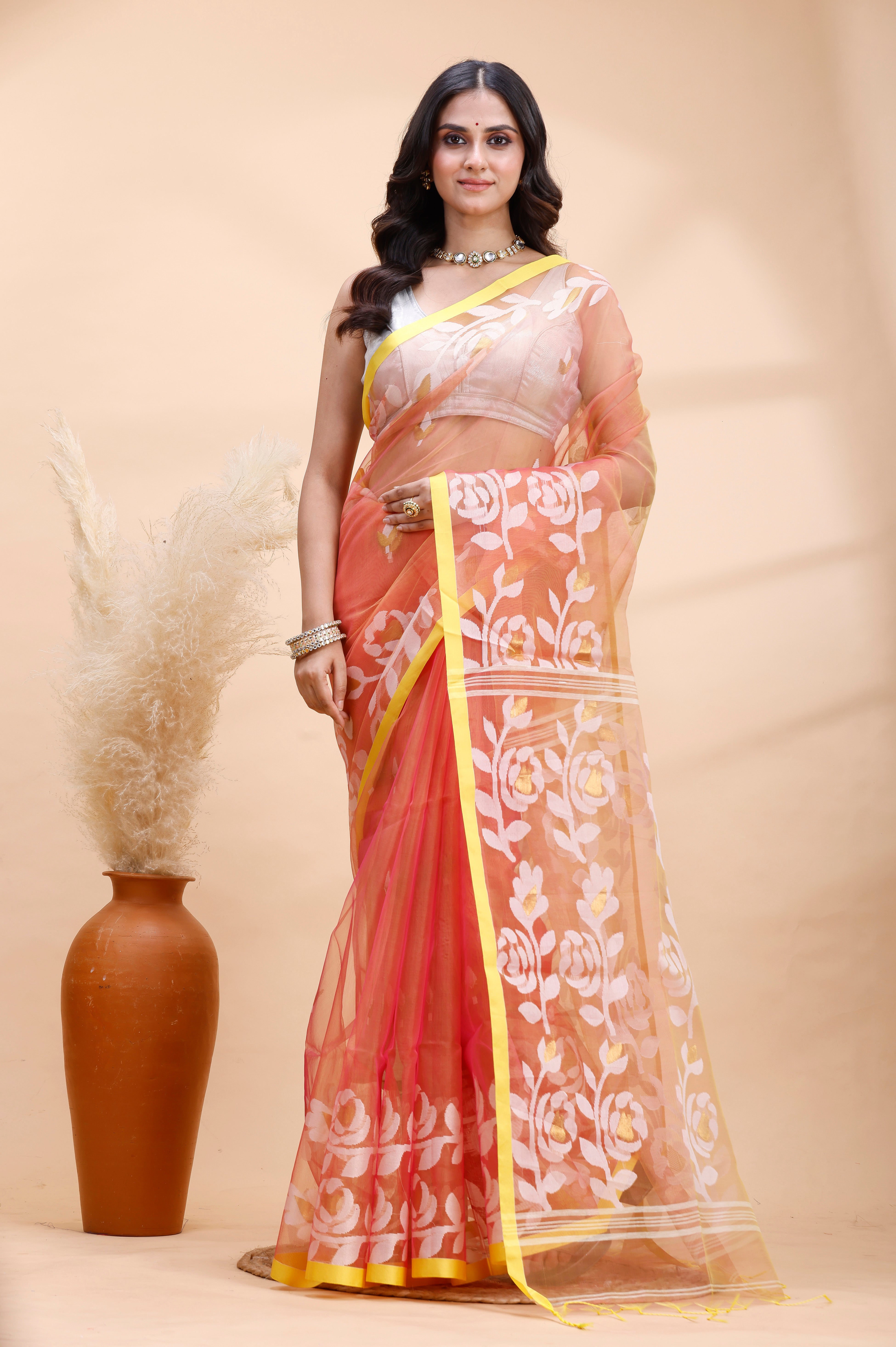 CORAL DUAL TONED MUSLIN SAREE WITH DELICATE JAMDANI MOTIFS AND GRACEFUL CONTRAST BORDER