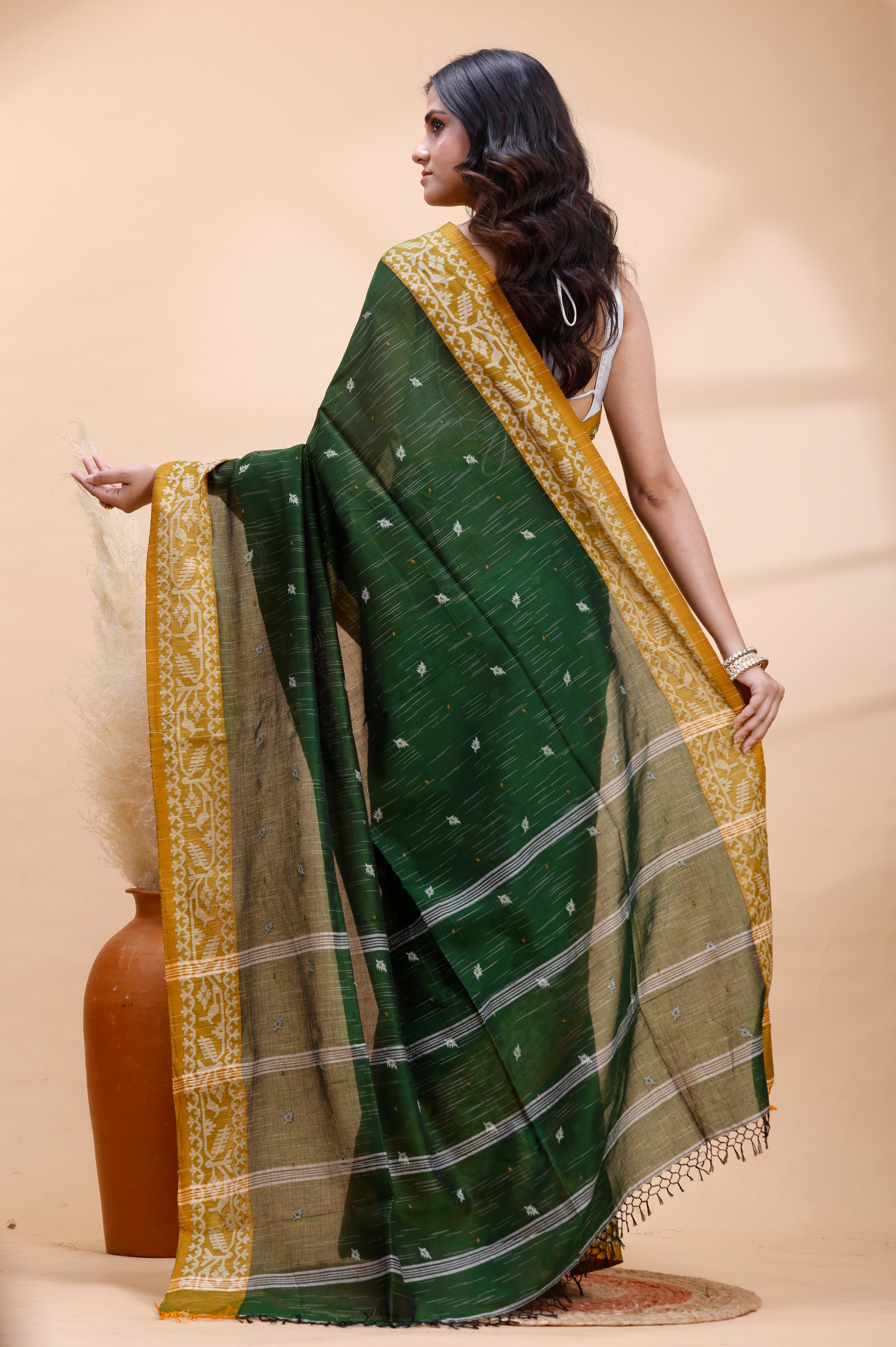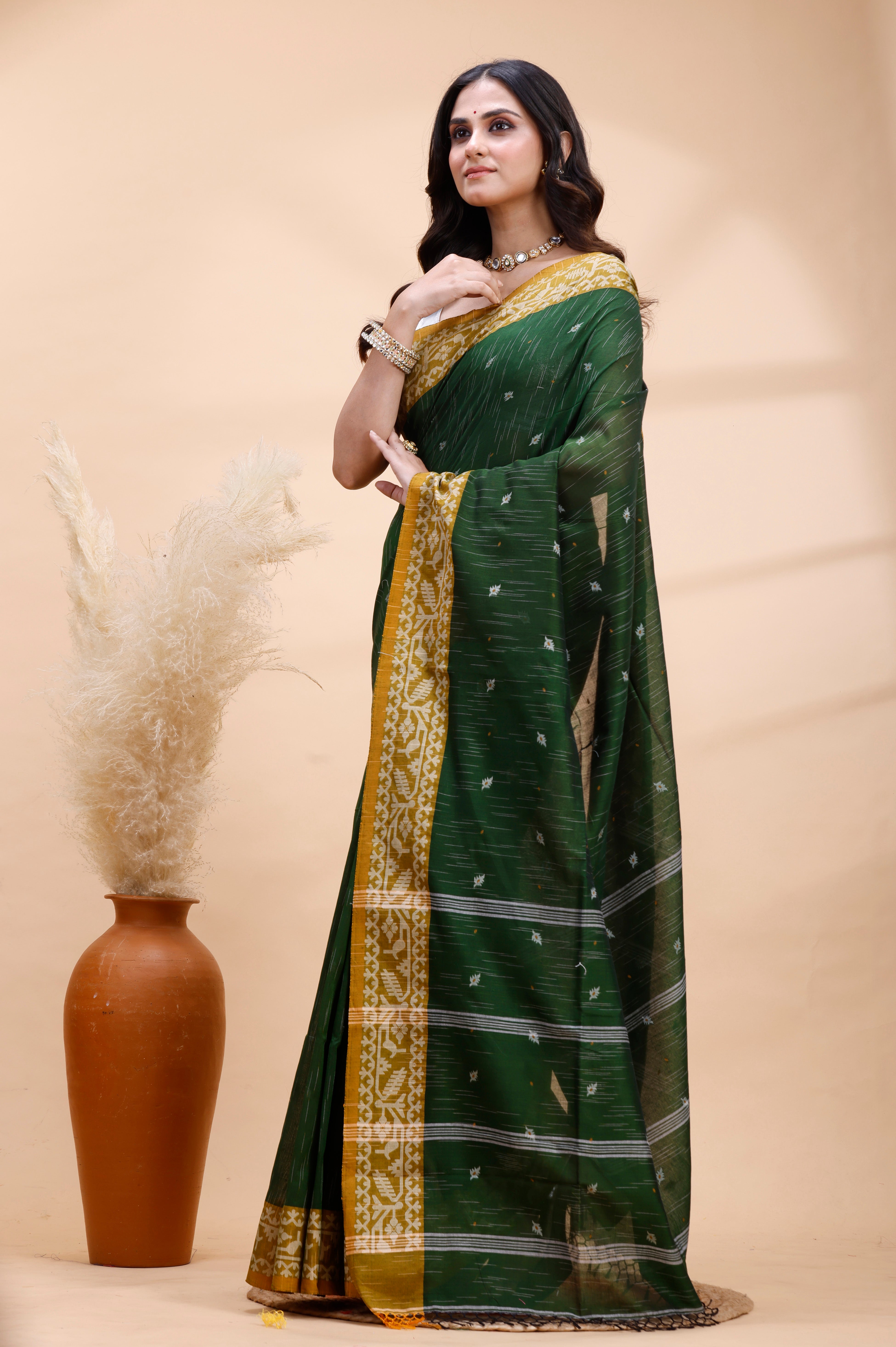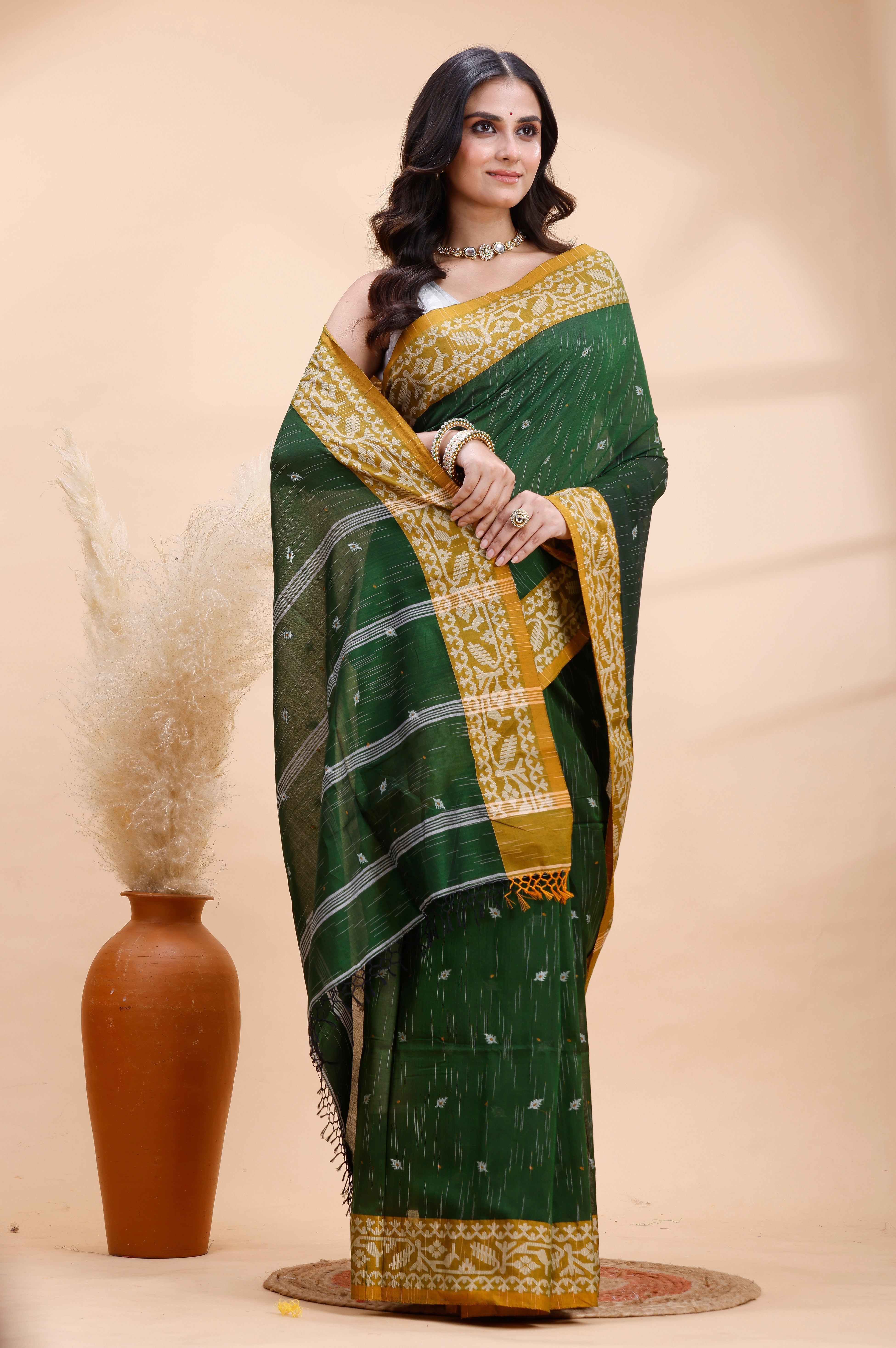 DARK GREEN HANDLOOM COTTON SAREE WITH MUSTARD YELLOW HERITAGE BORDER