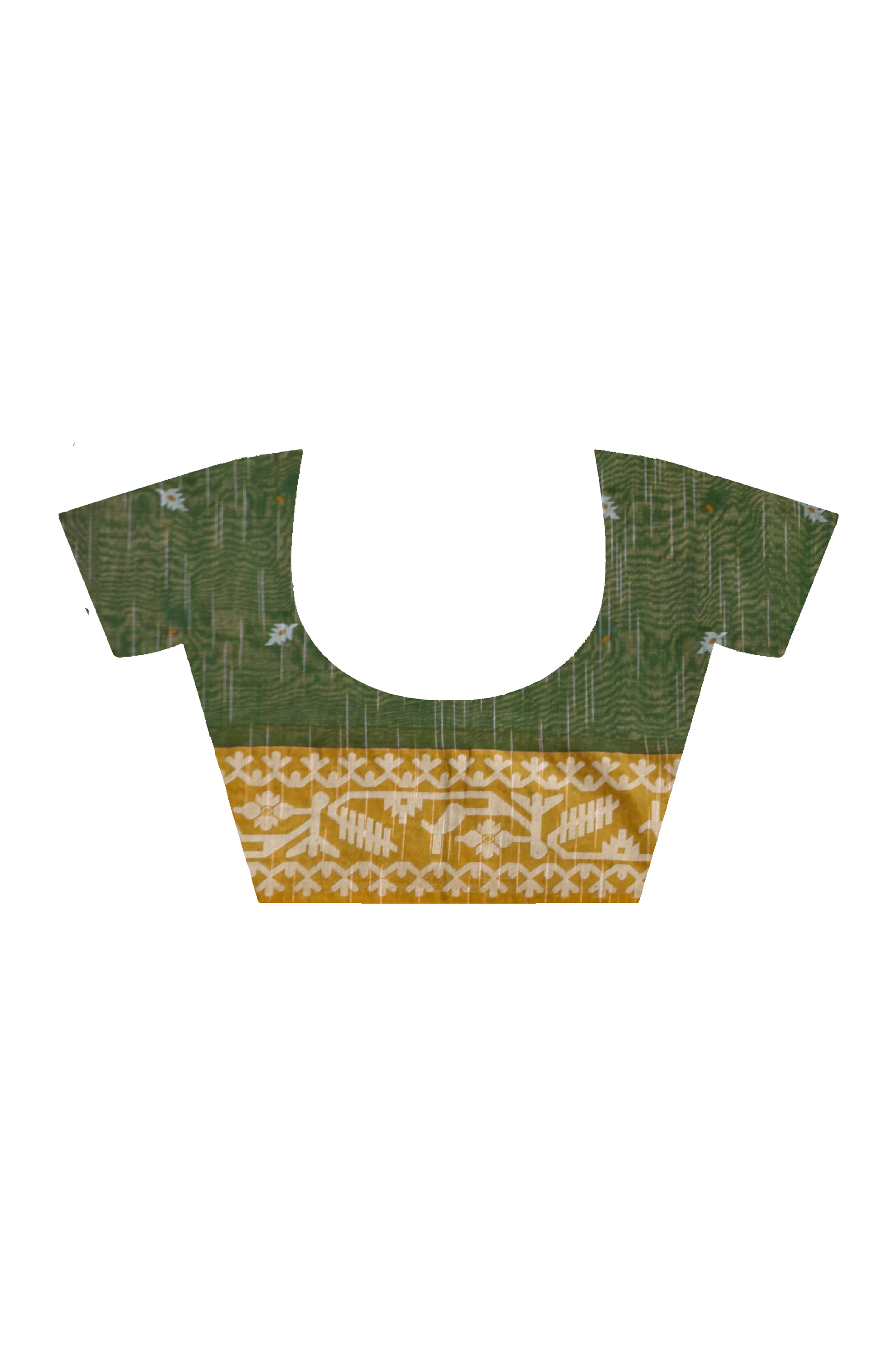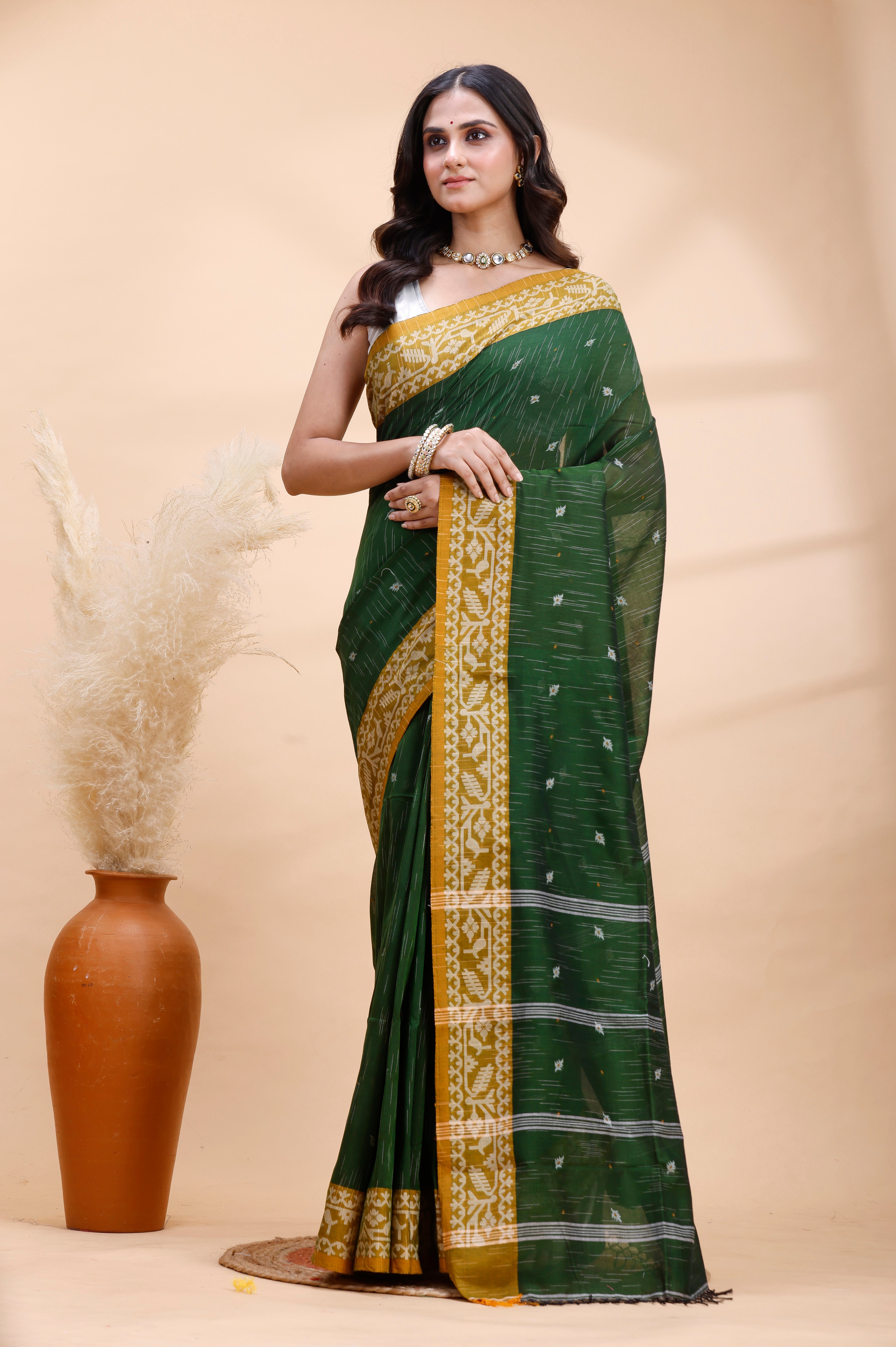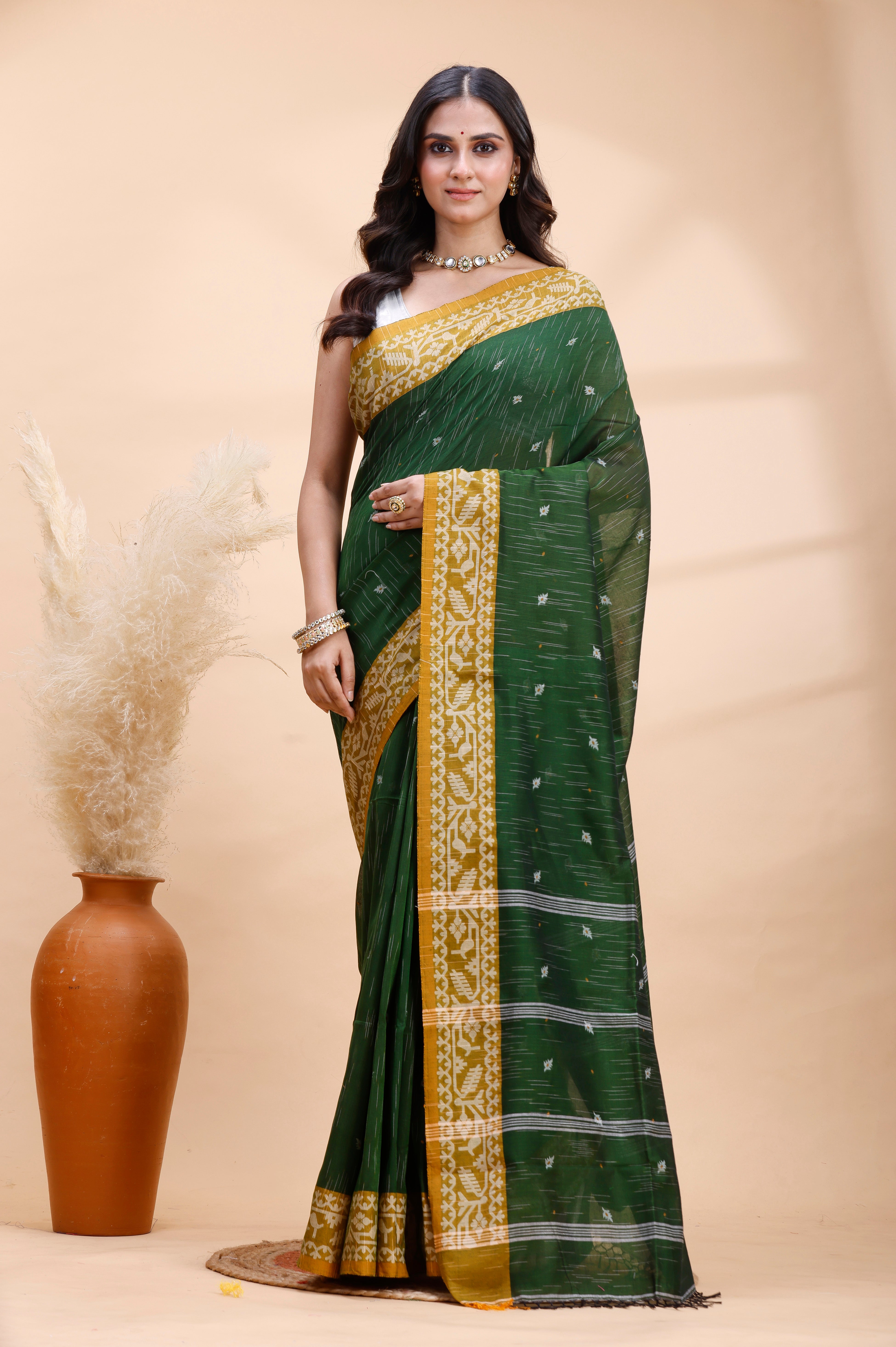 DARK GREEN HANDLOOM COTTON SAREE WITH MUSTARD YELLOW HERITAGE BORDER