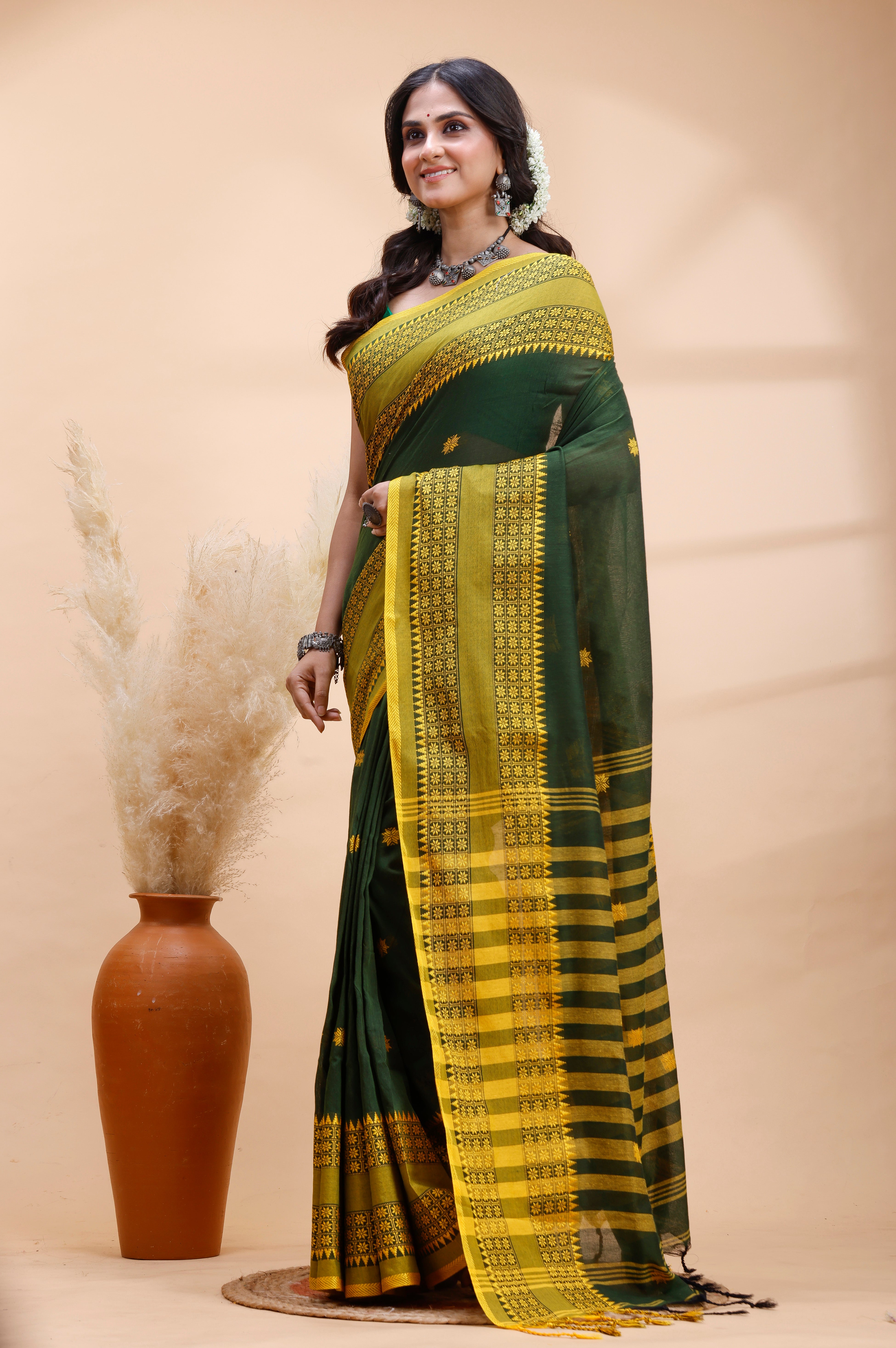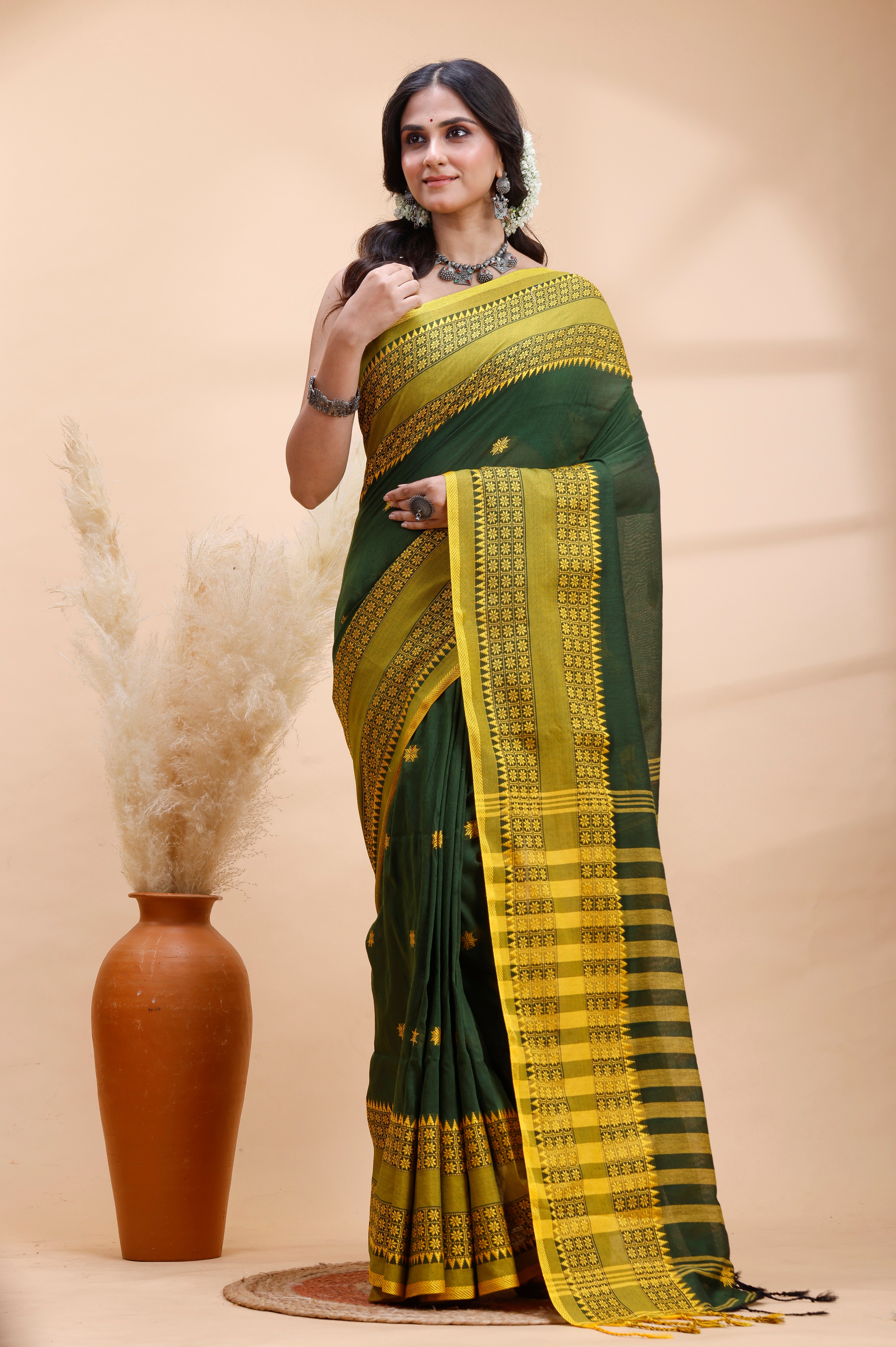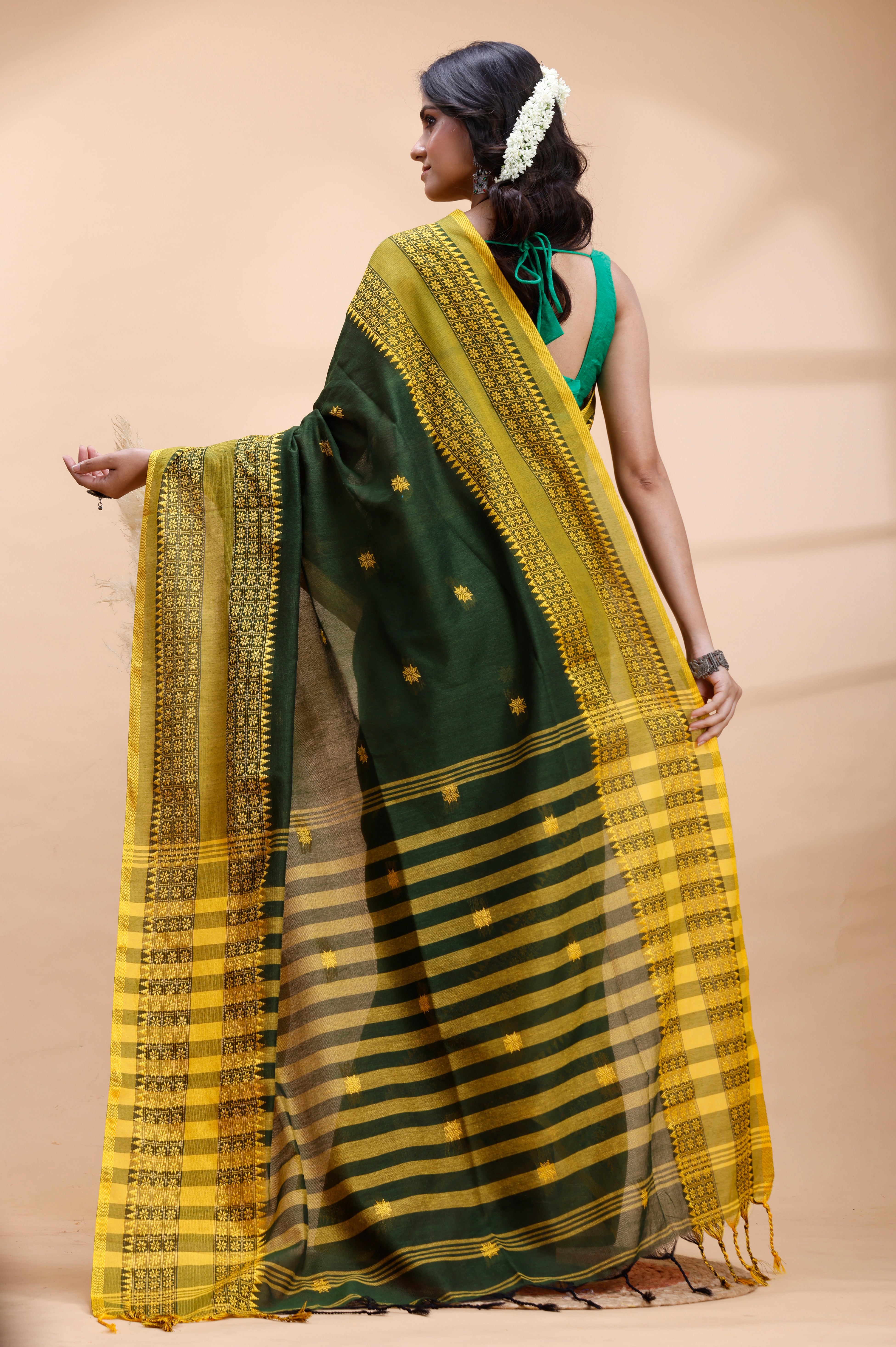 DARK GREEN HANDLOOM COTTON SAREE WITH YELLOW TRADITIONAL BORDER & INTRICATE WEAVING DESIGN