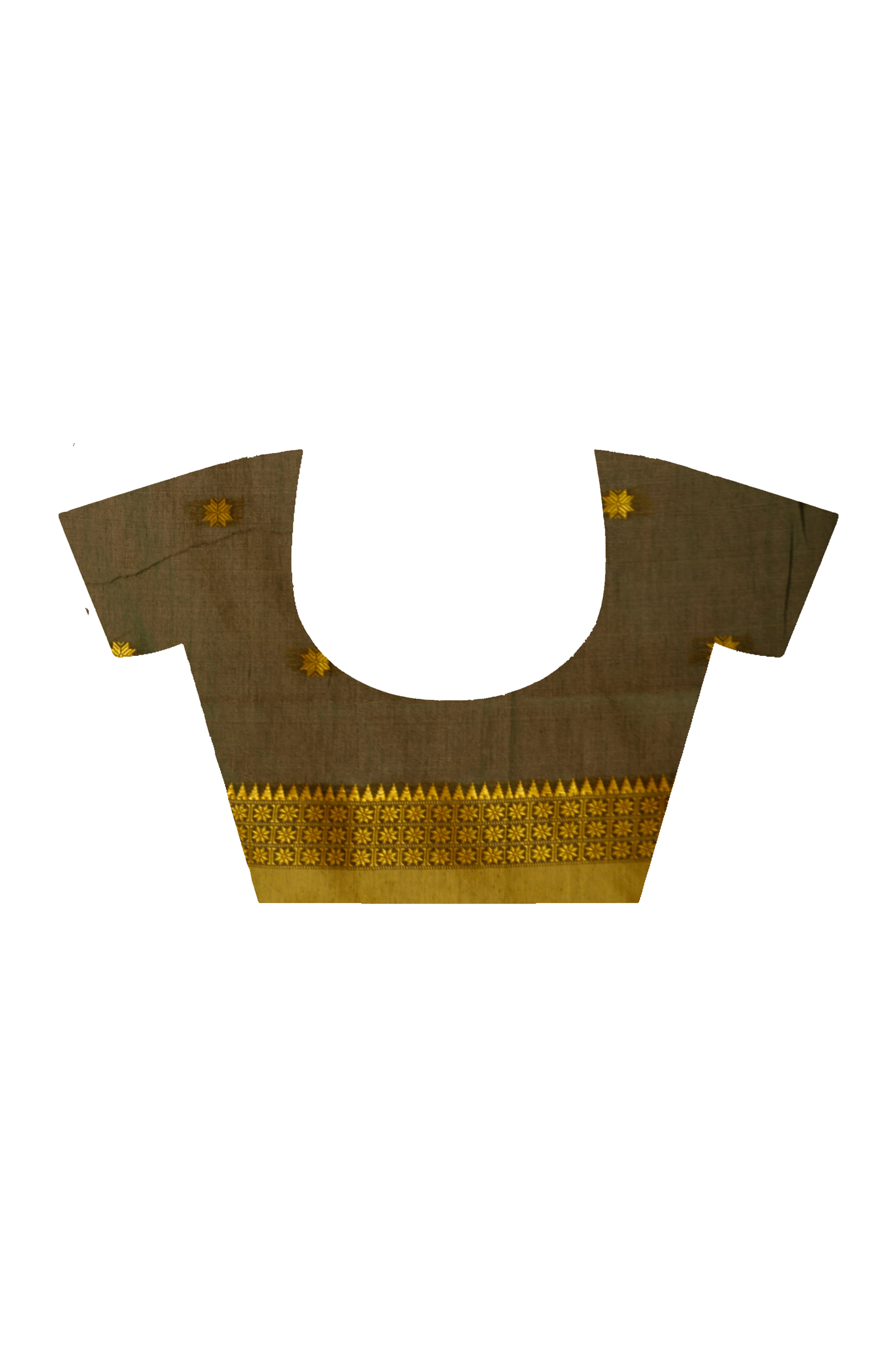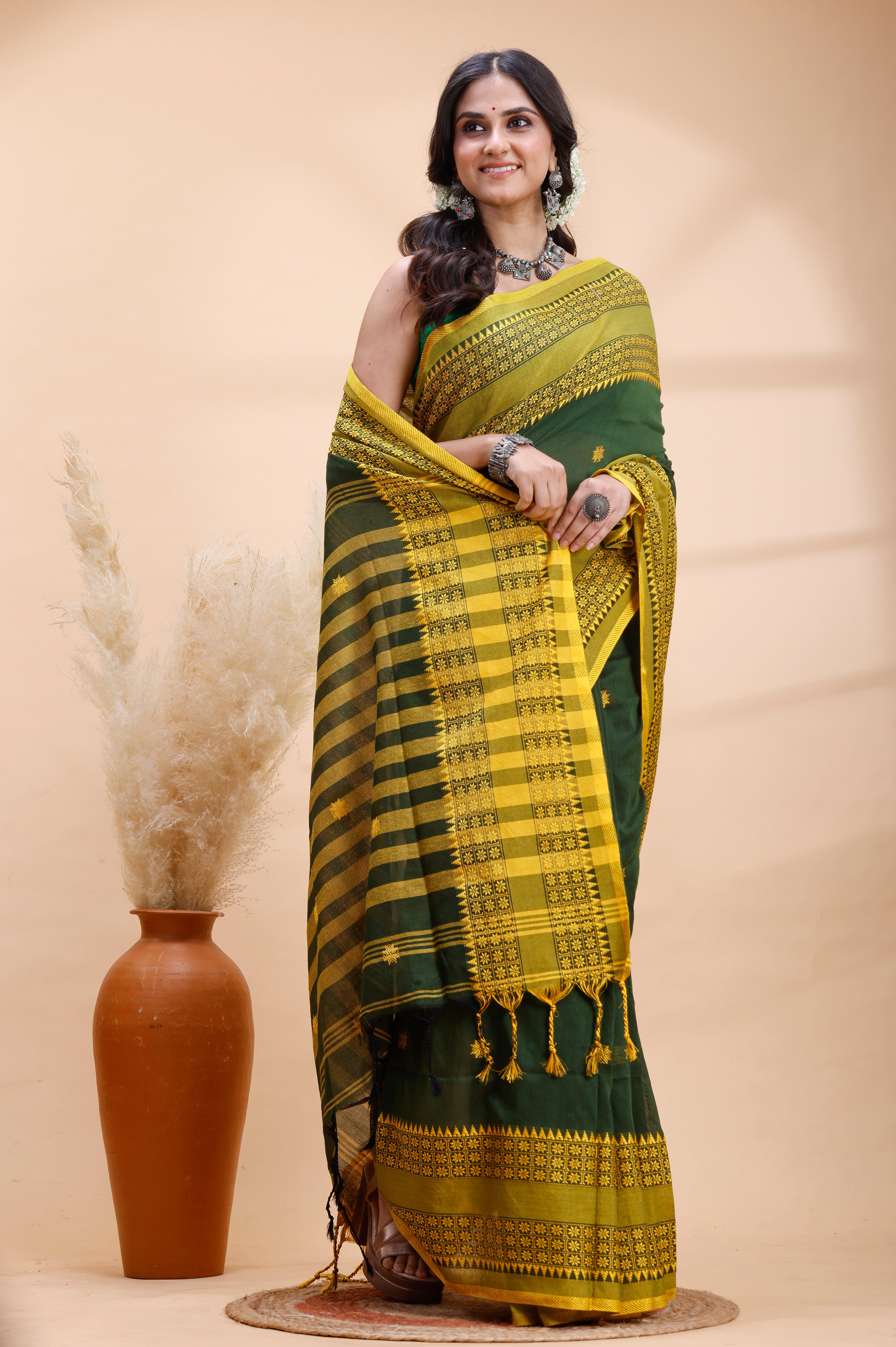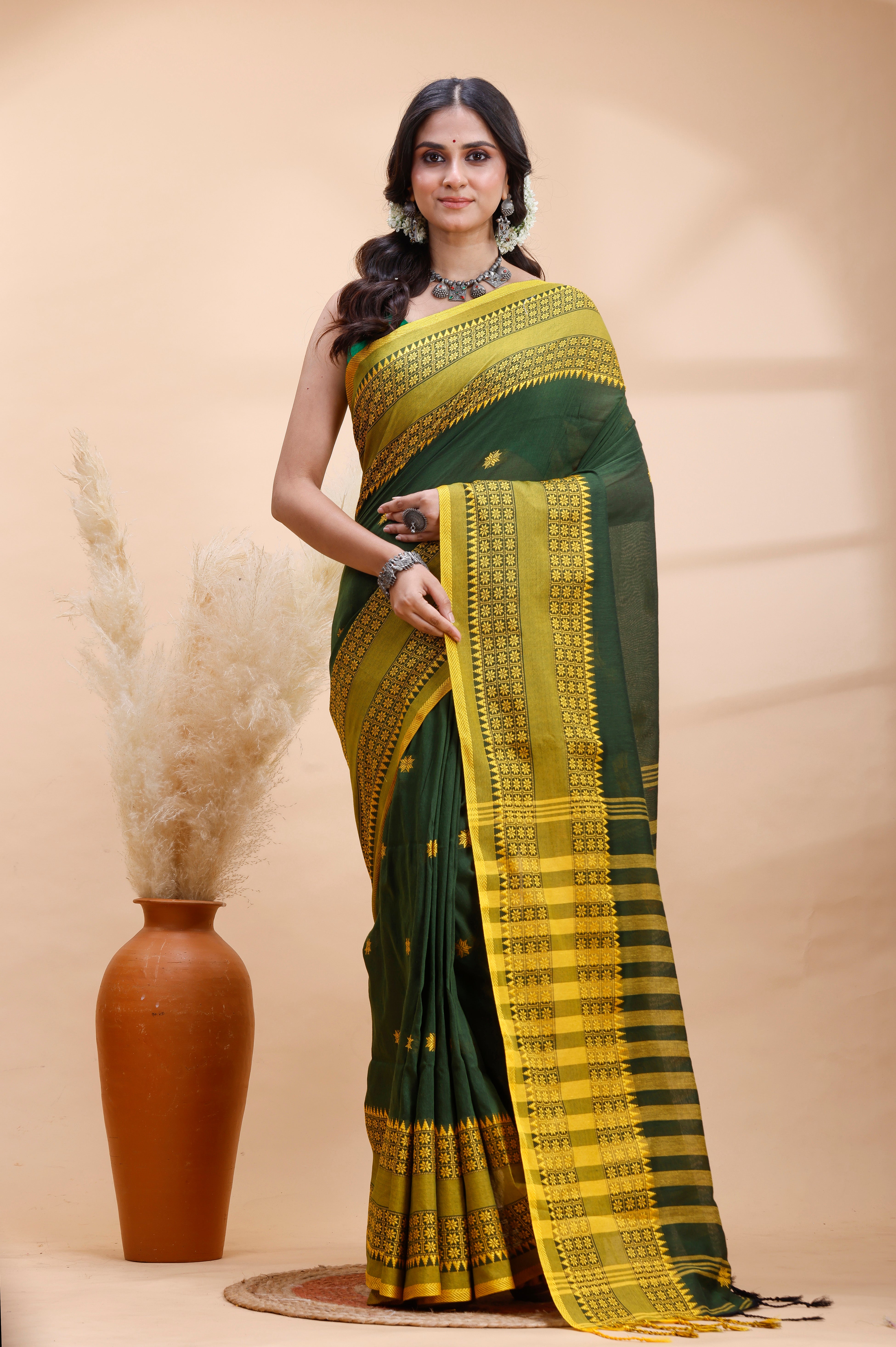 DARK GREEN HANDLOOM COTTON SAREE WITH YELLOW TRADITIONAL BORDER & INTRICATE WEAVING DESIGN