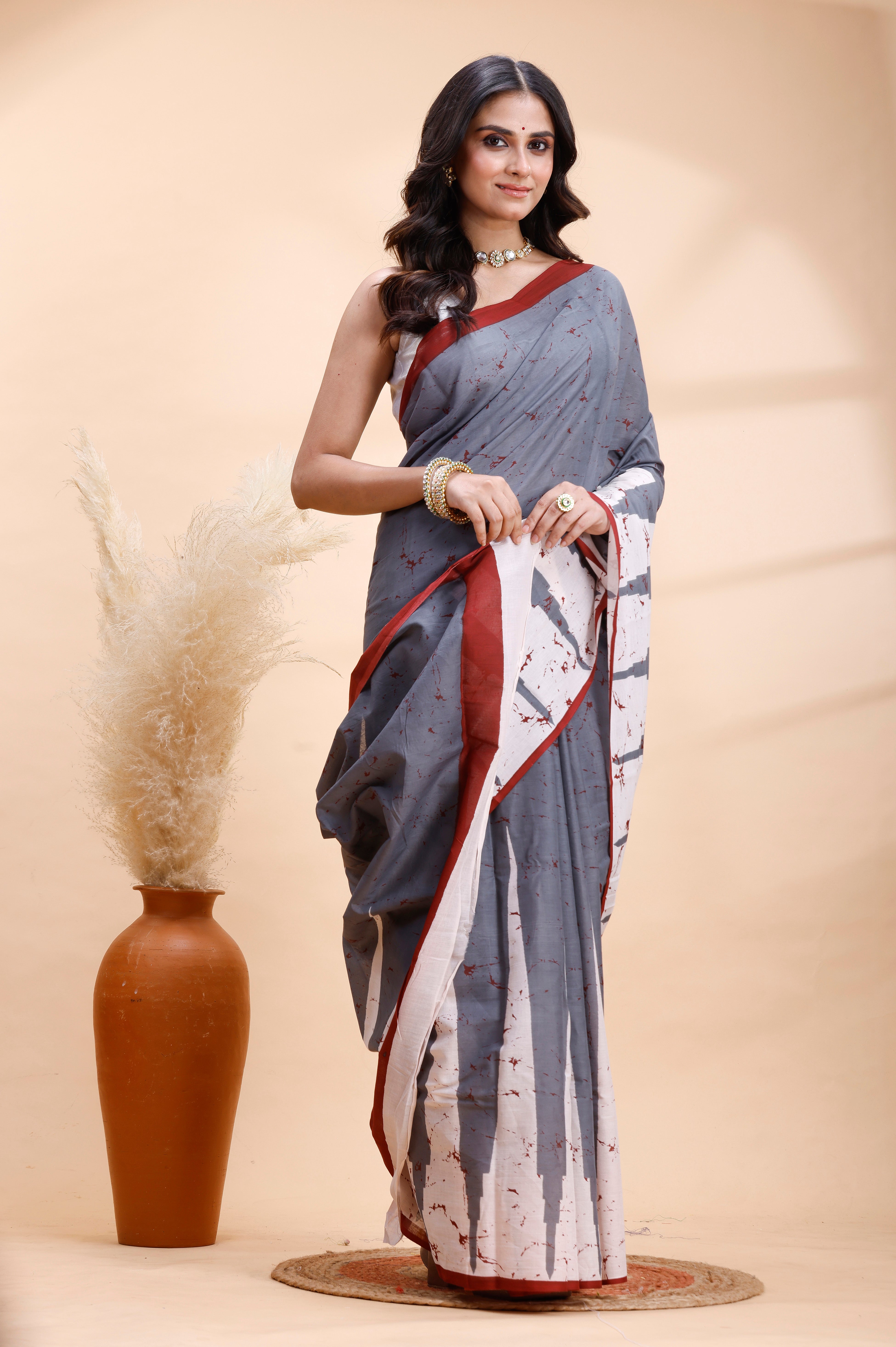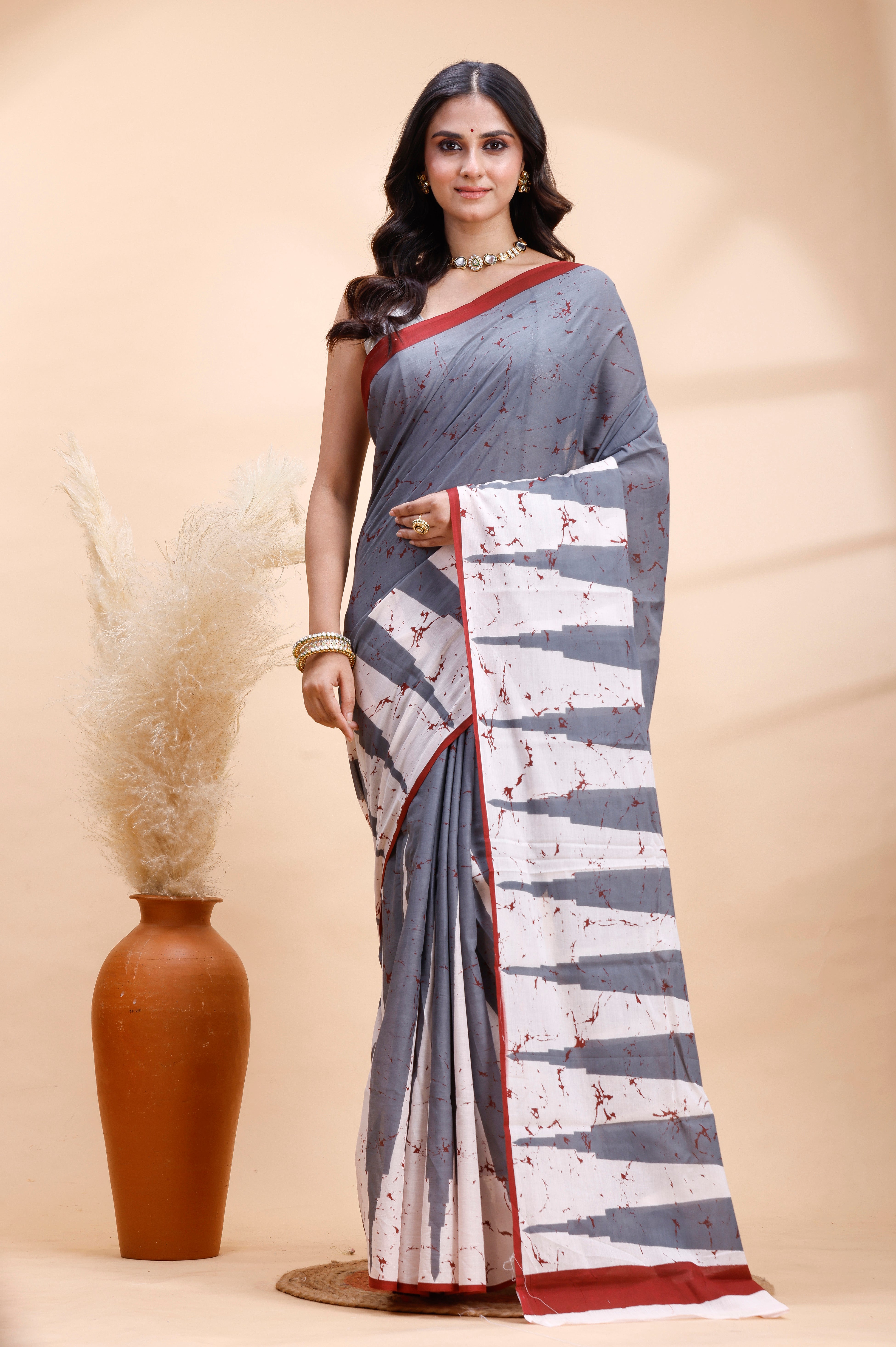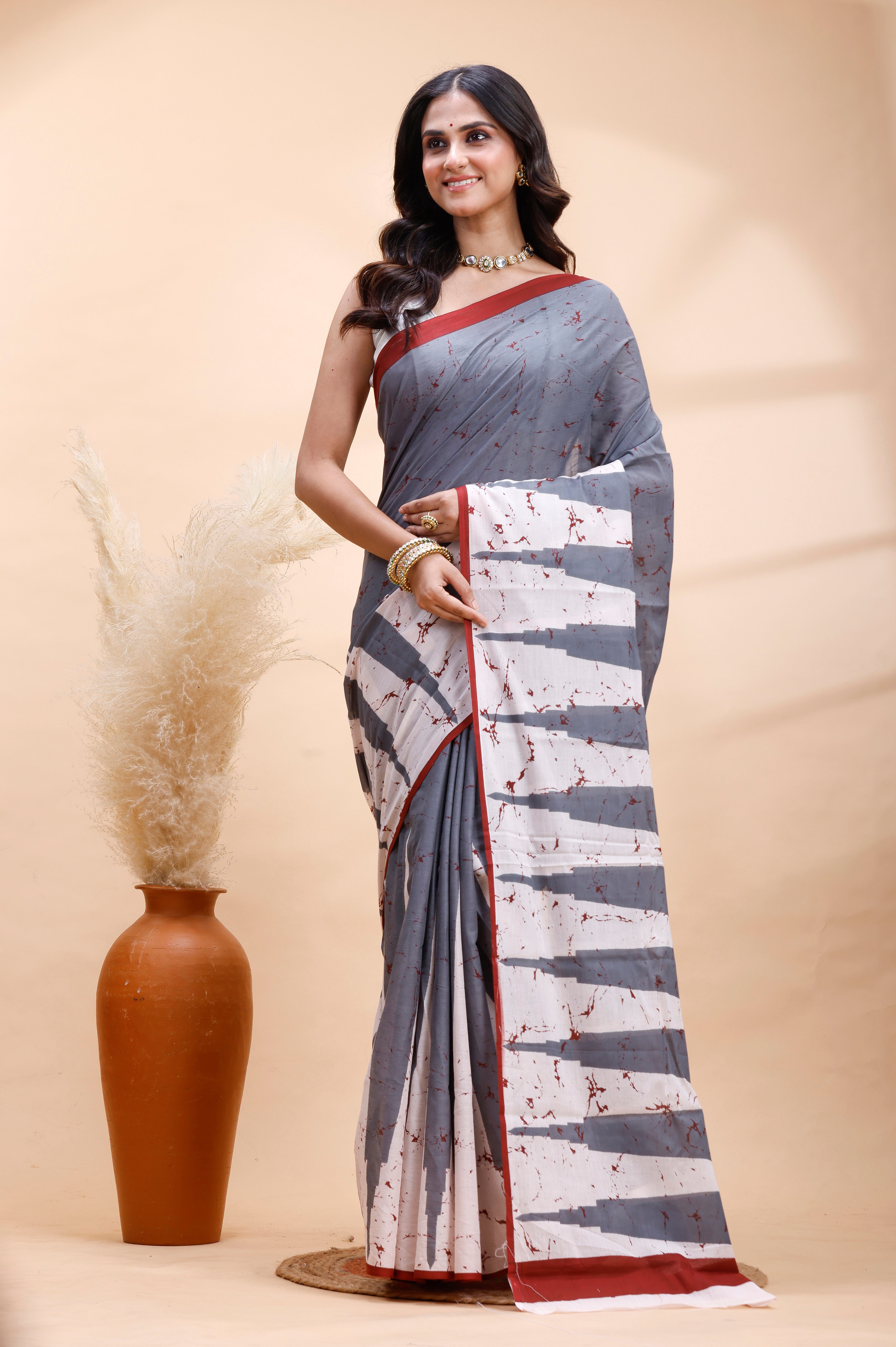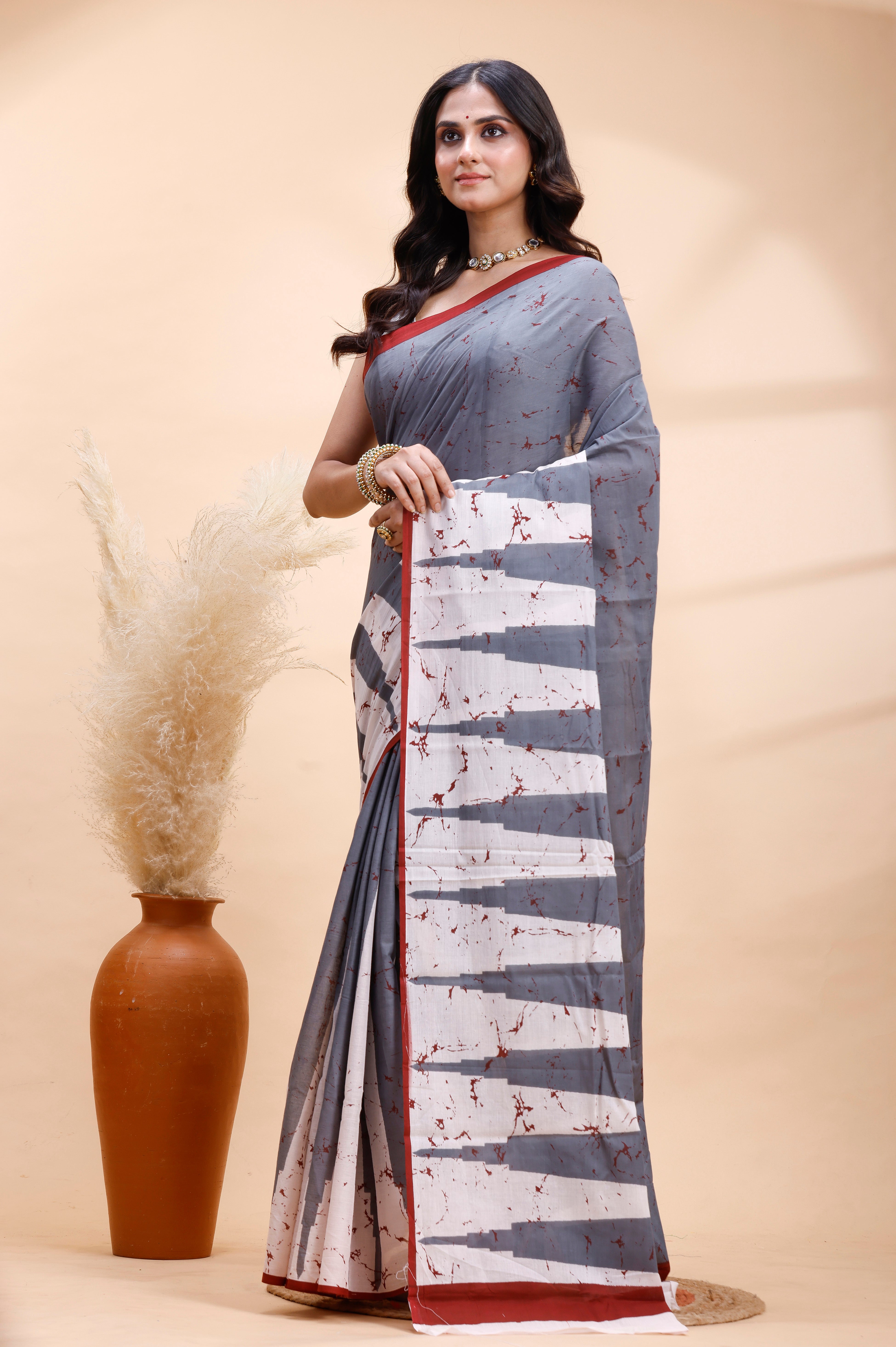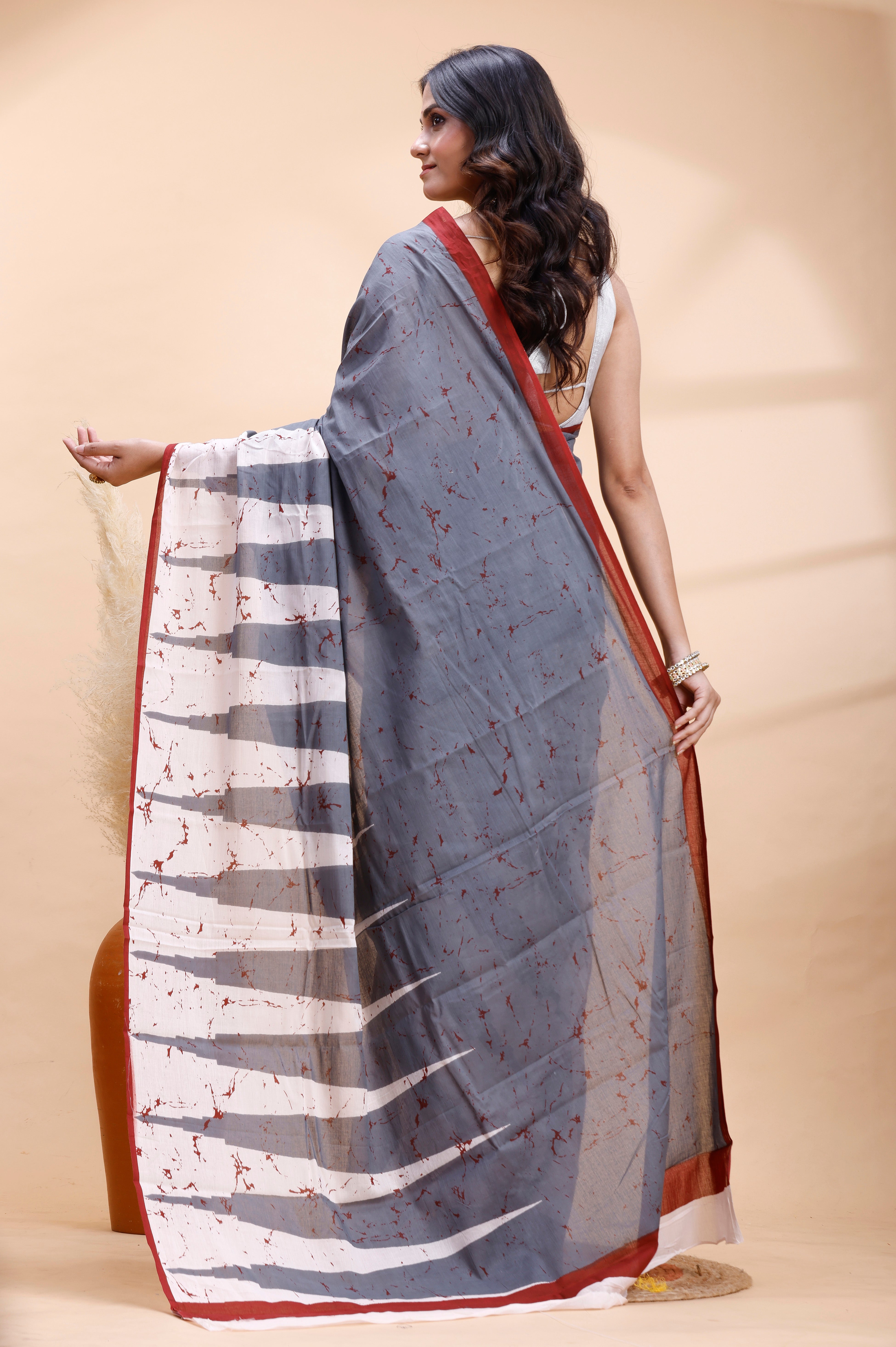 GRAY MALMAL COTTON SAREE WITH ABSTRACT WHITE PALLU AND SUBTLE RED ACCENTS