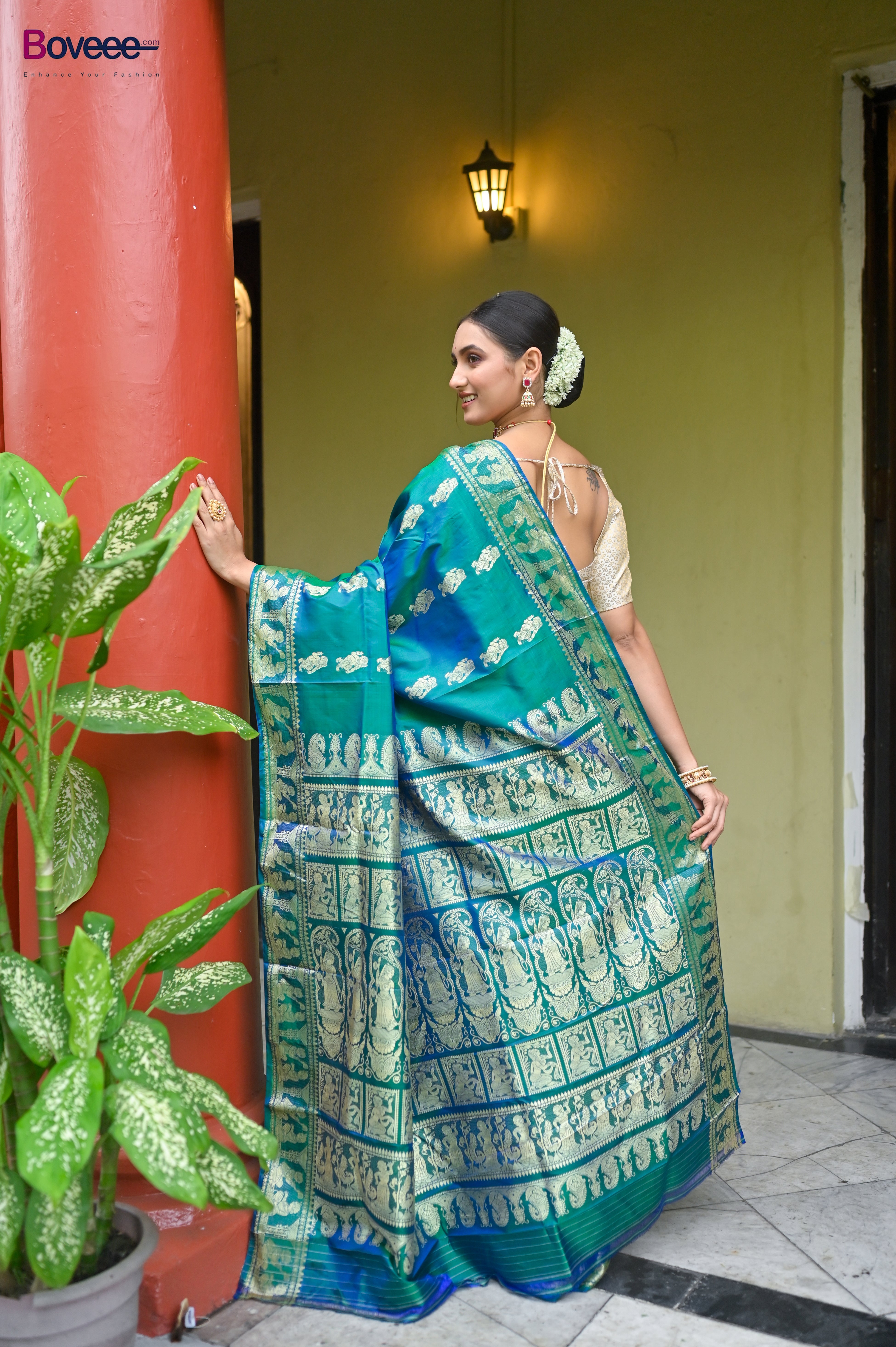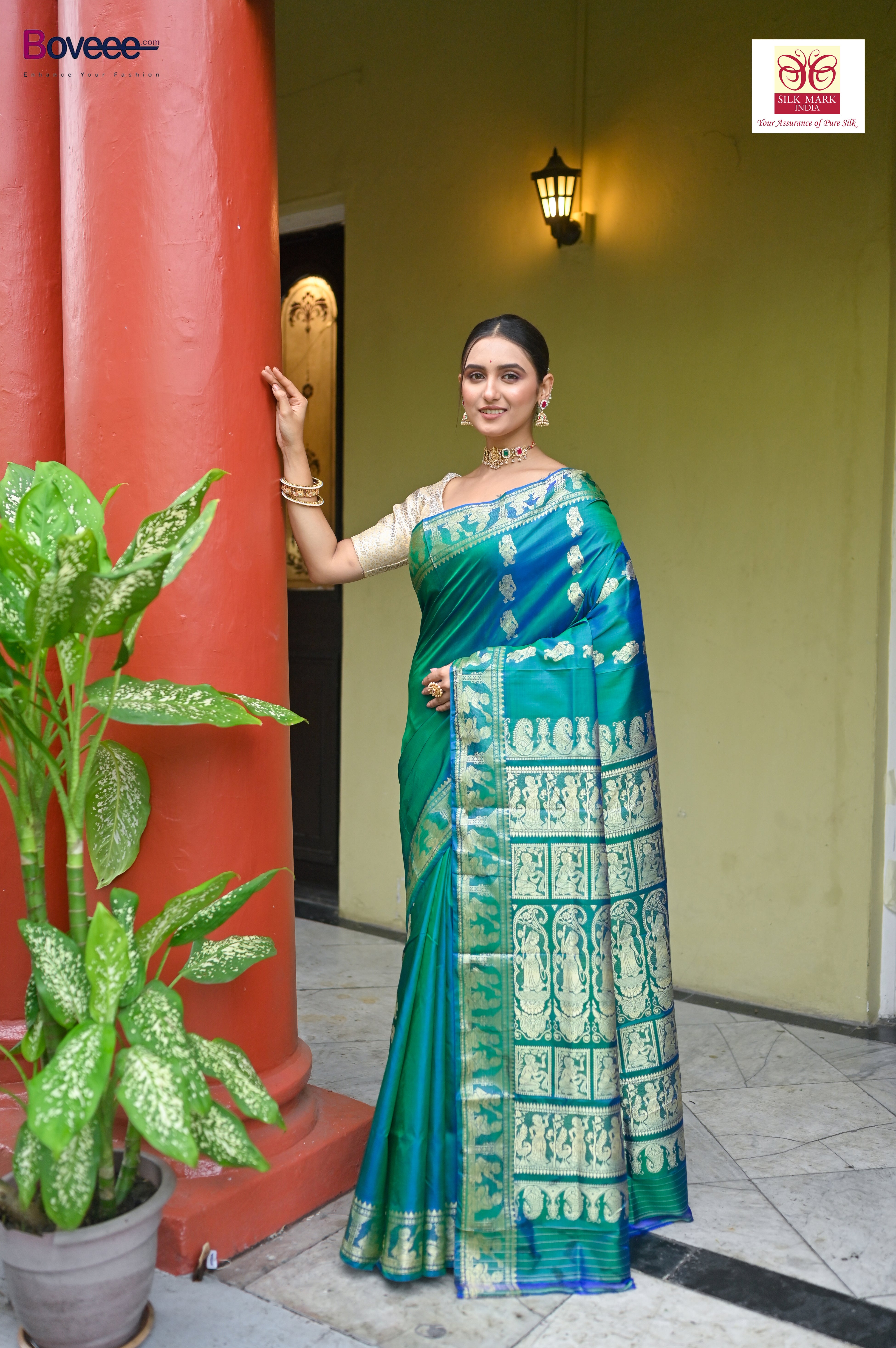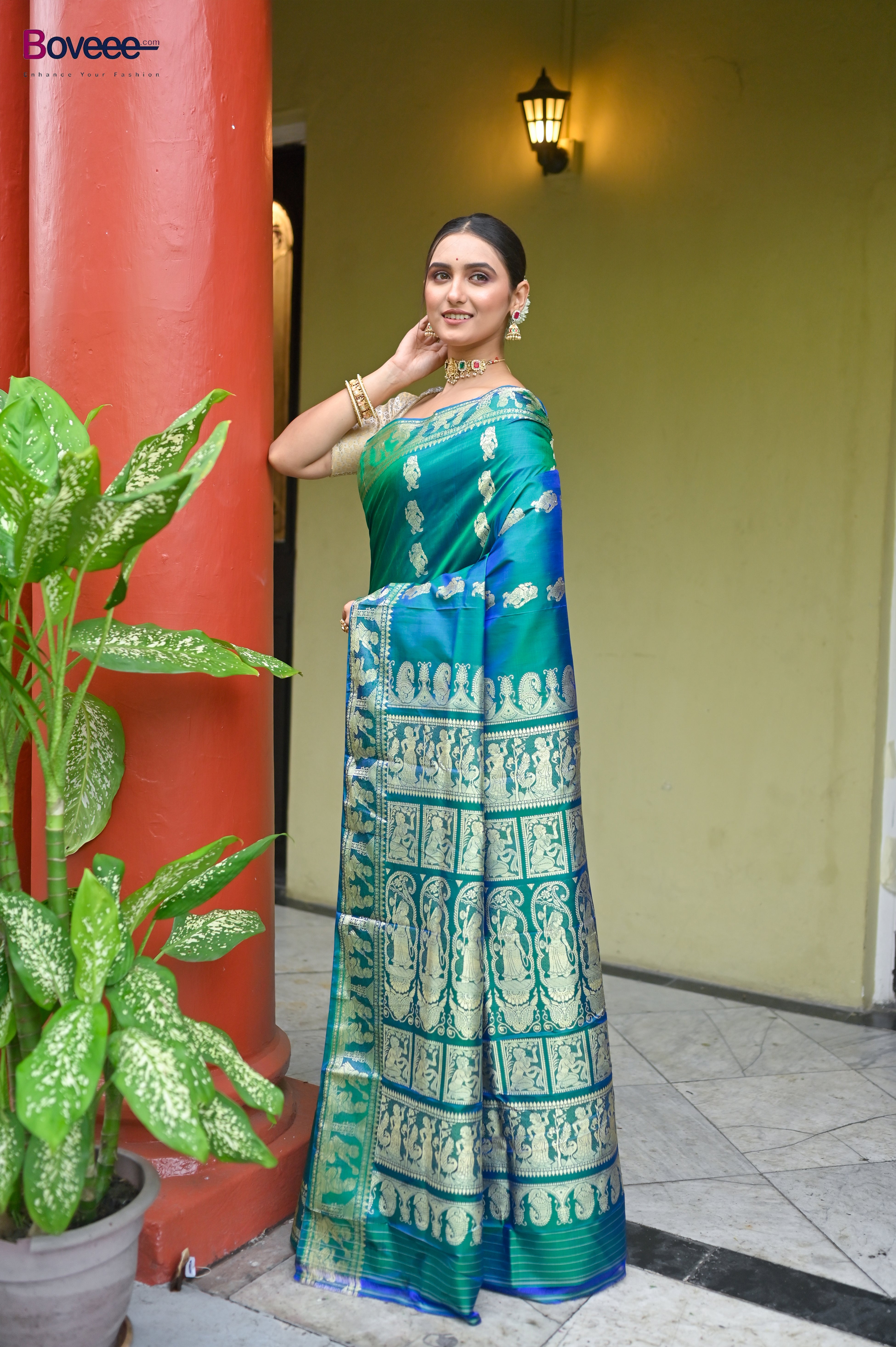 GREEN DUAL TONED PURE HANDWOVEN BALUCHARI SILK SAREE WITH EXQUISITE RESHAM WORK IN COPPER COLOR