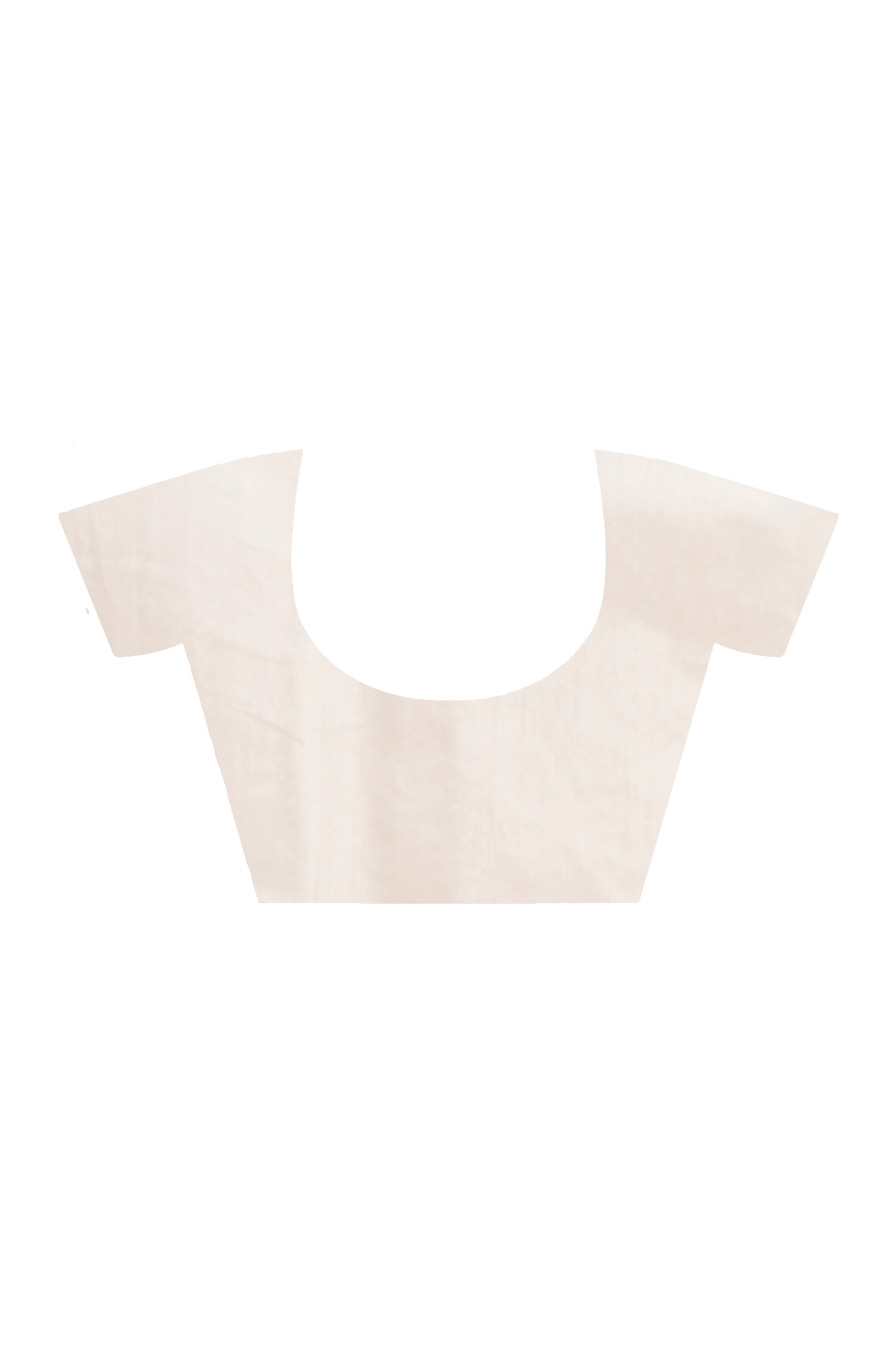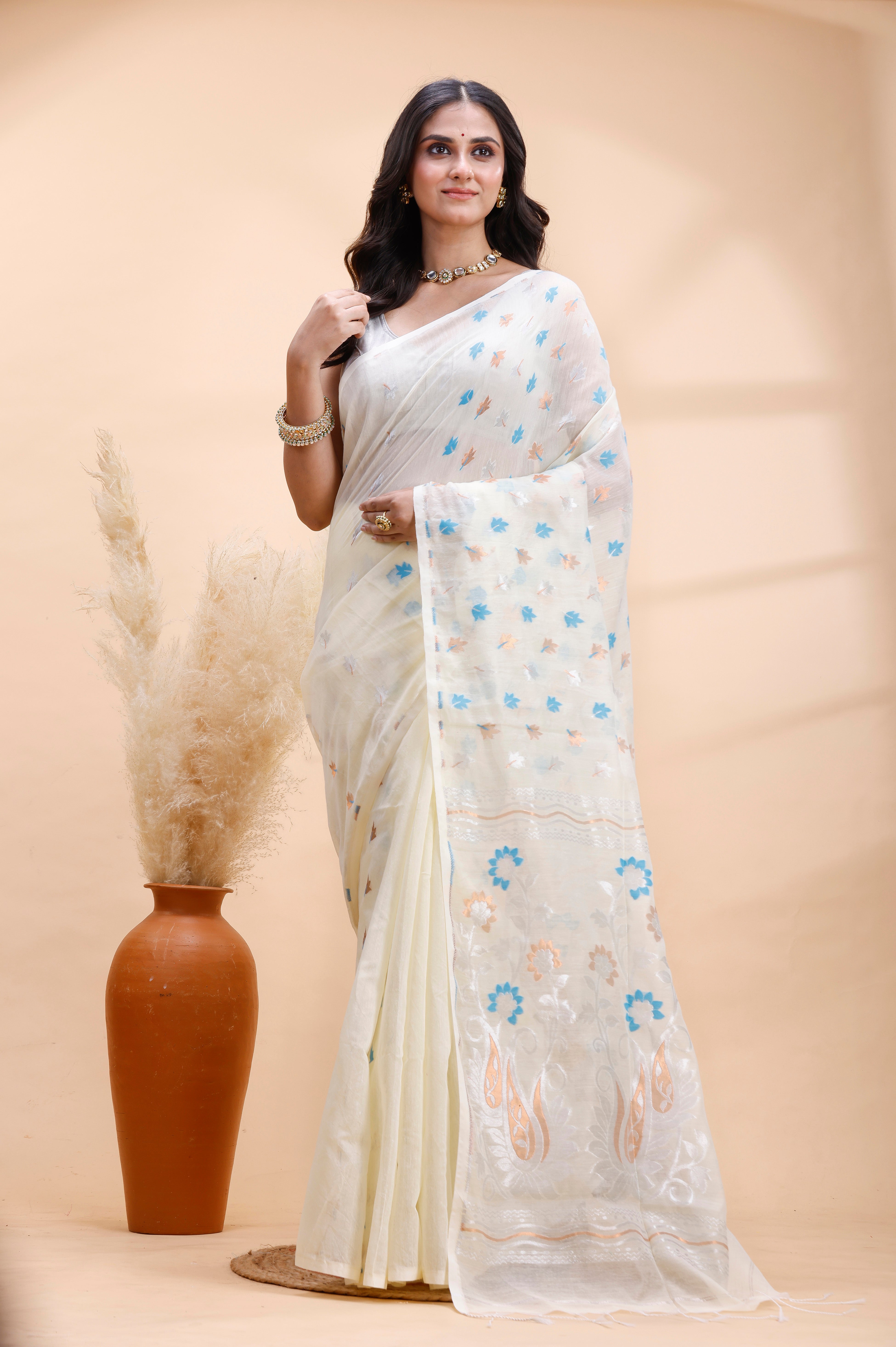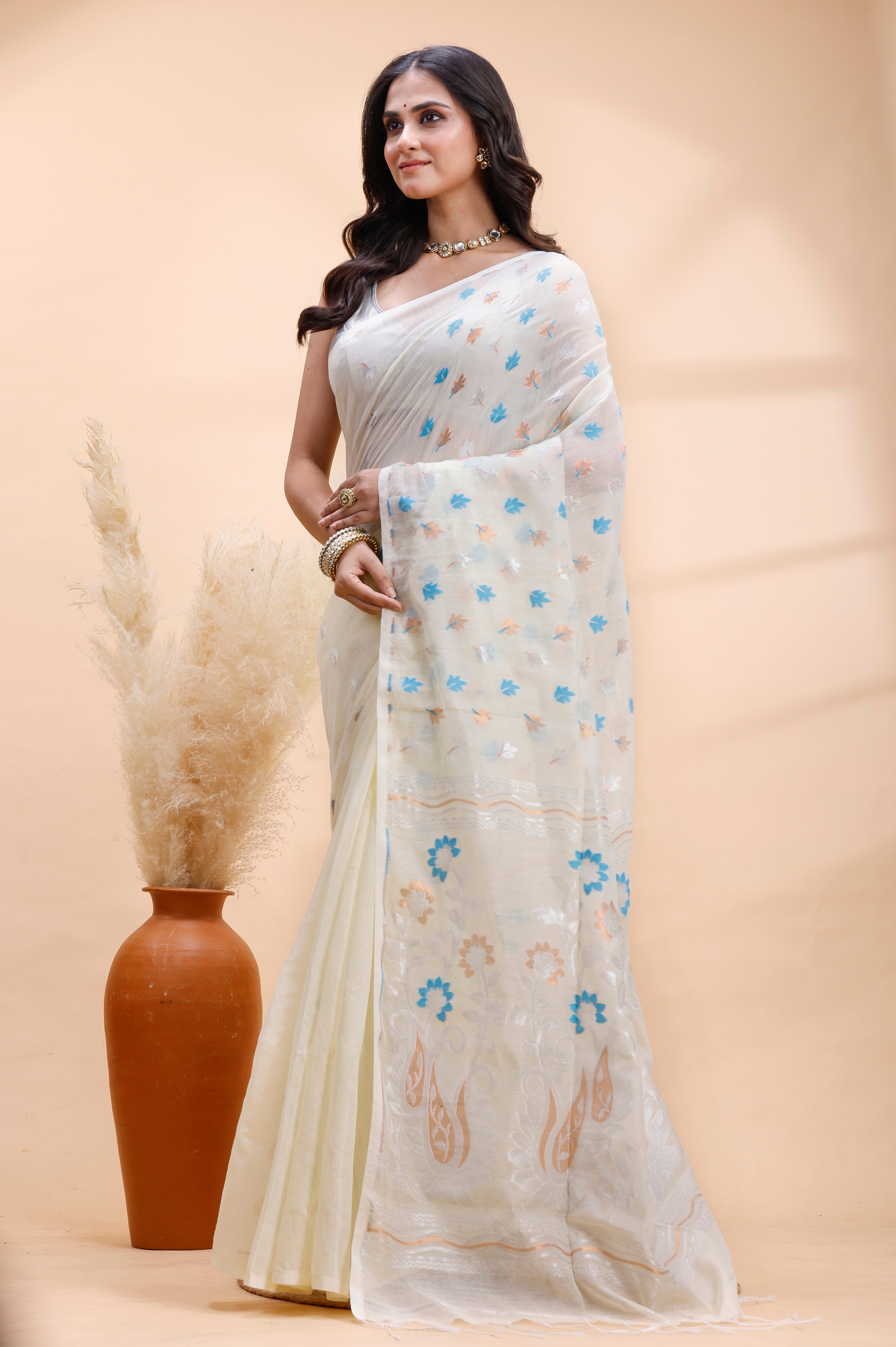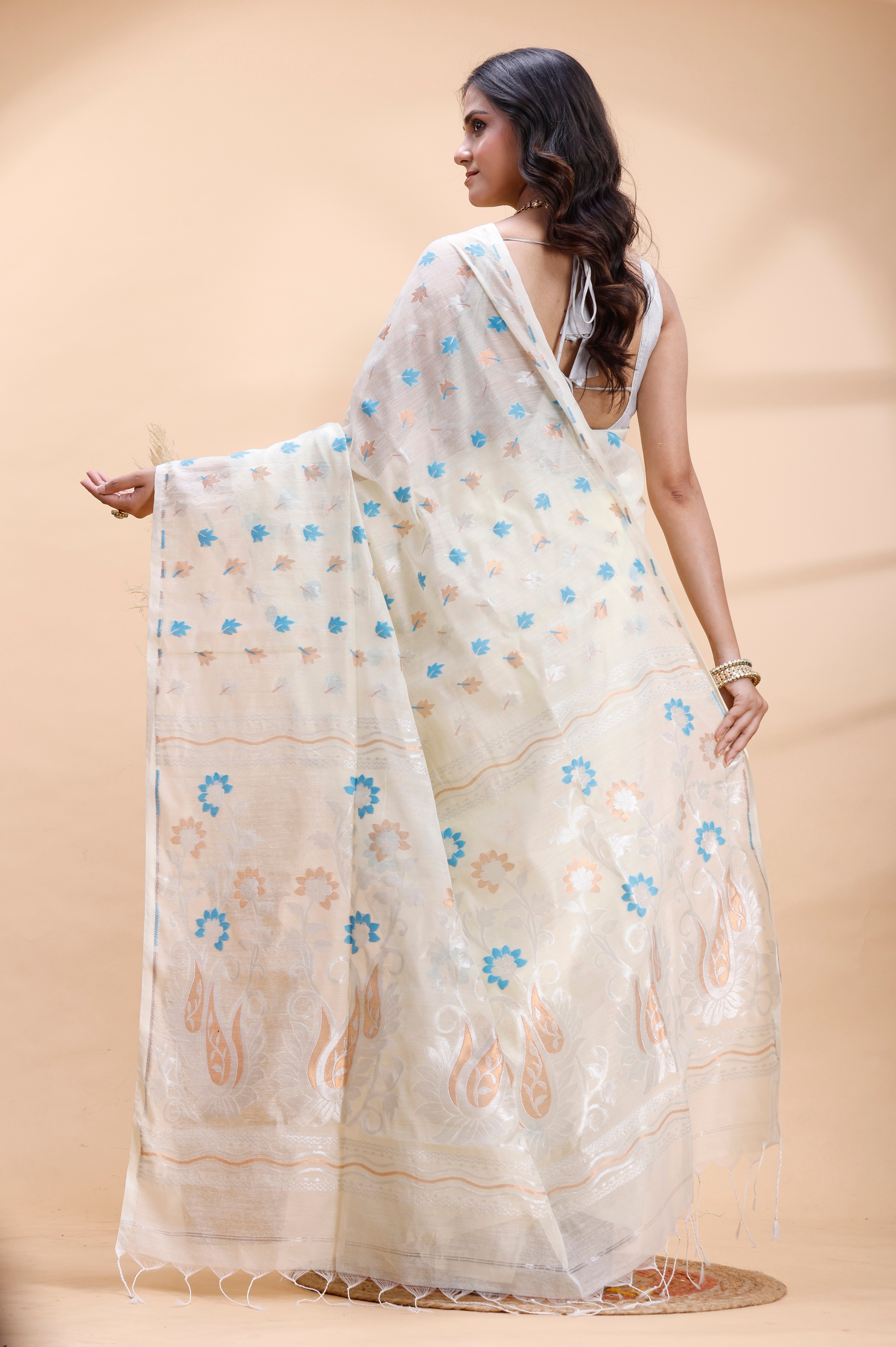 IVORY HANDLOOM COTTON SAREE WITH DELICATE BLUE AND GOLDEN FLORAL BUTI AND ARTISTIC WOVEN PALLU