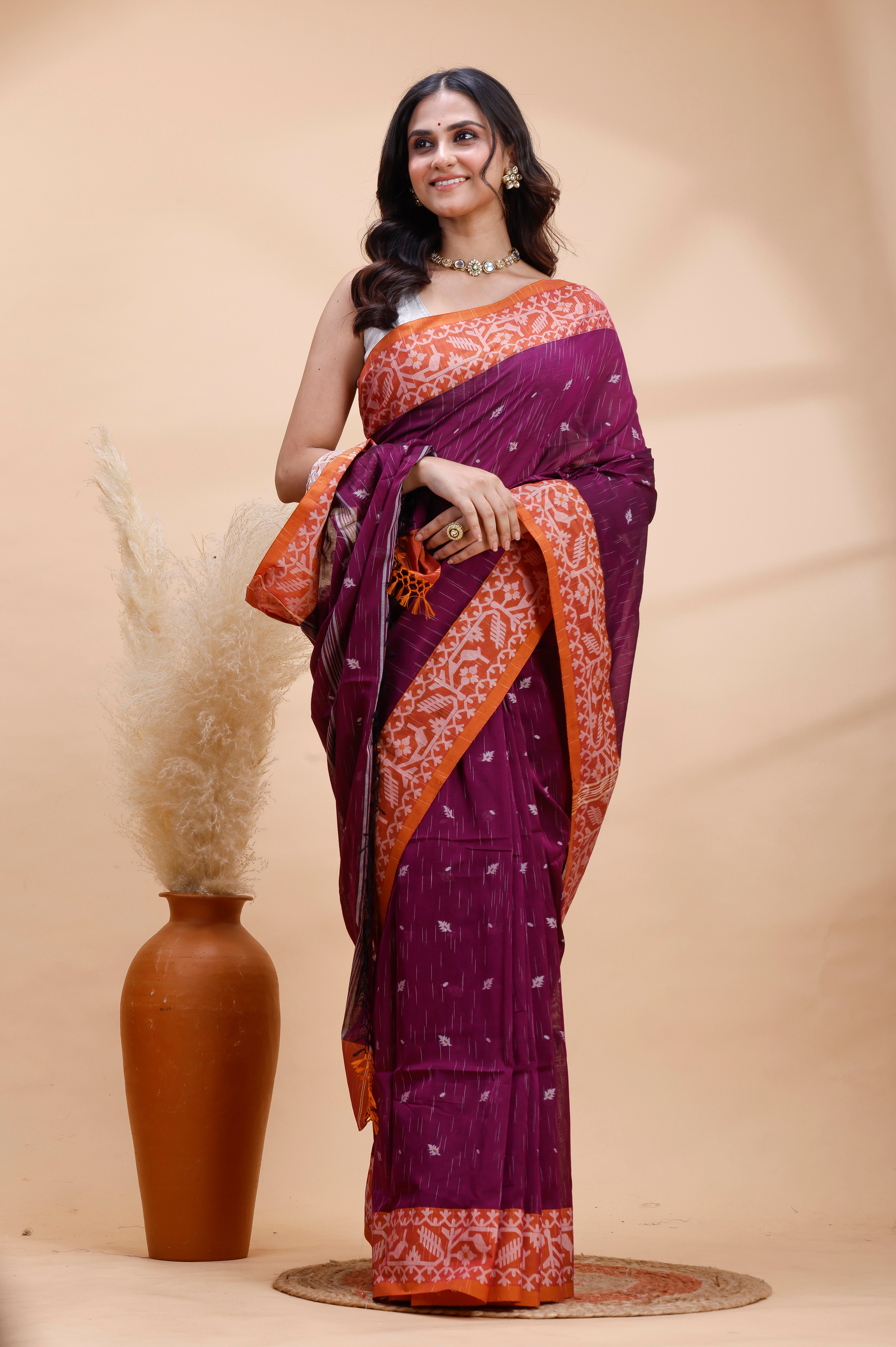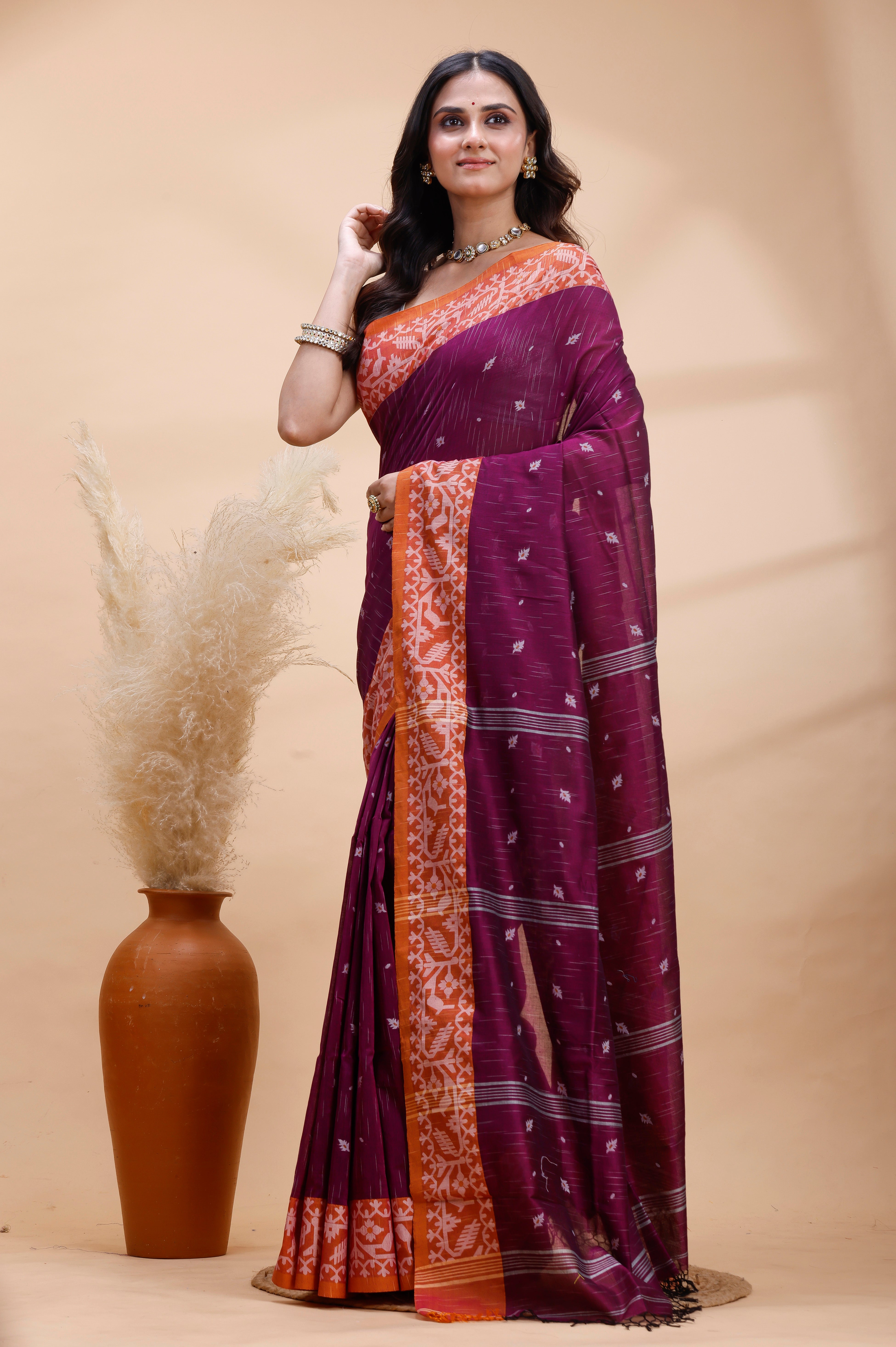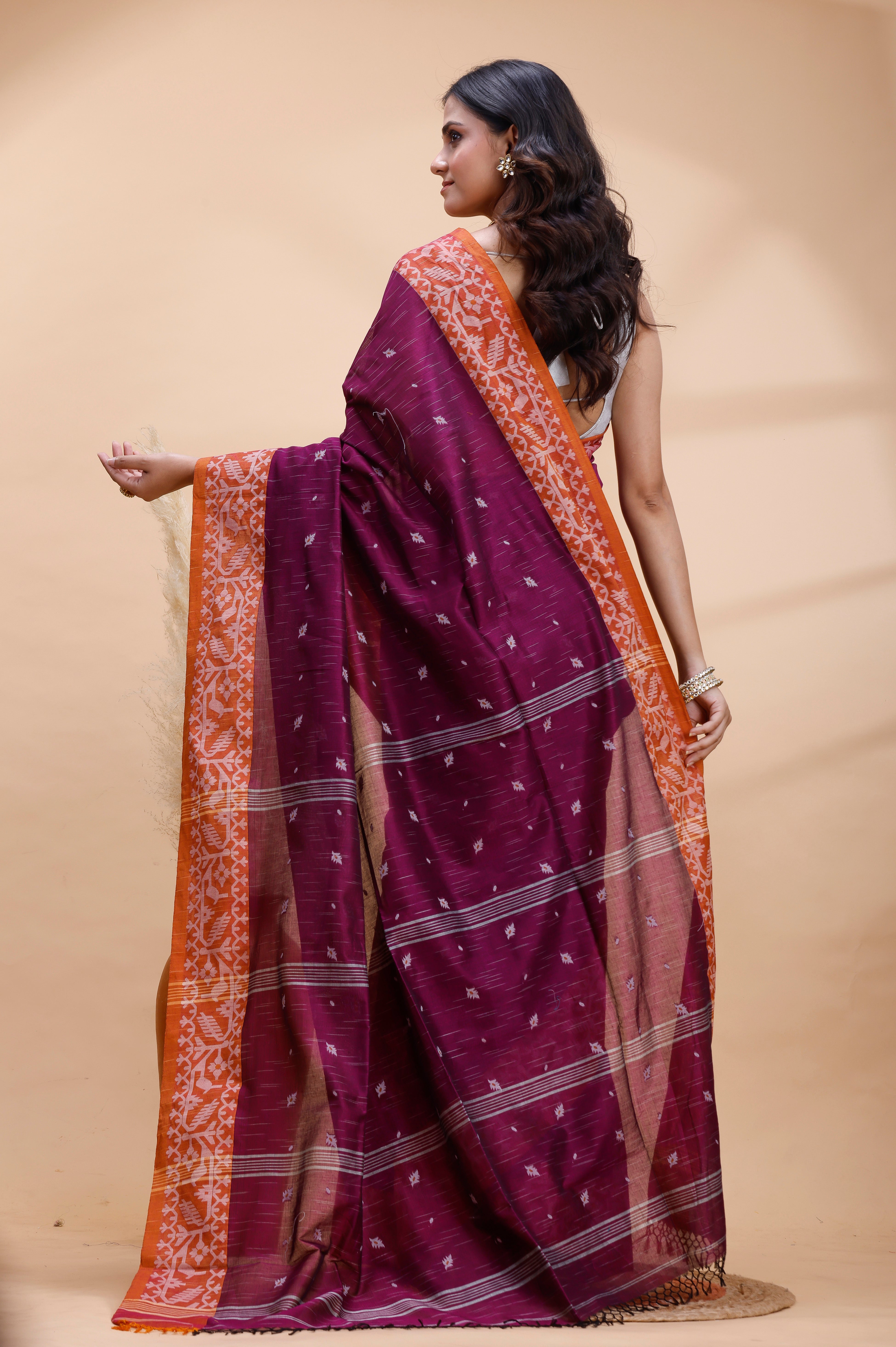 MAGENTA HANDLOOM COTTON SAREE WITH RUST HERITAGE BORDER