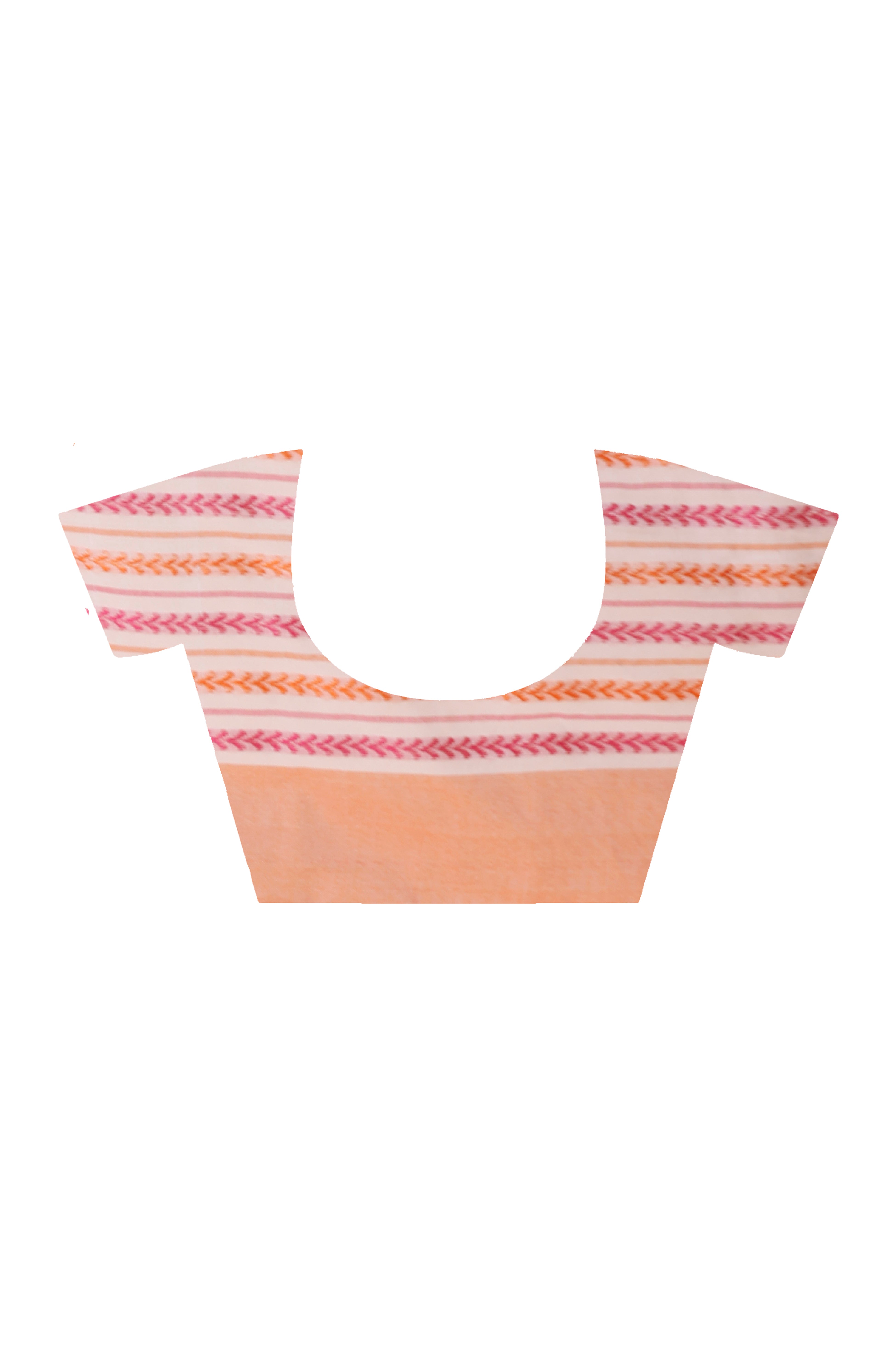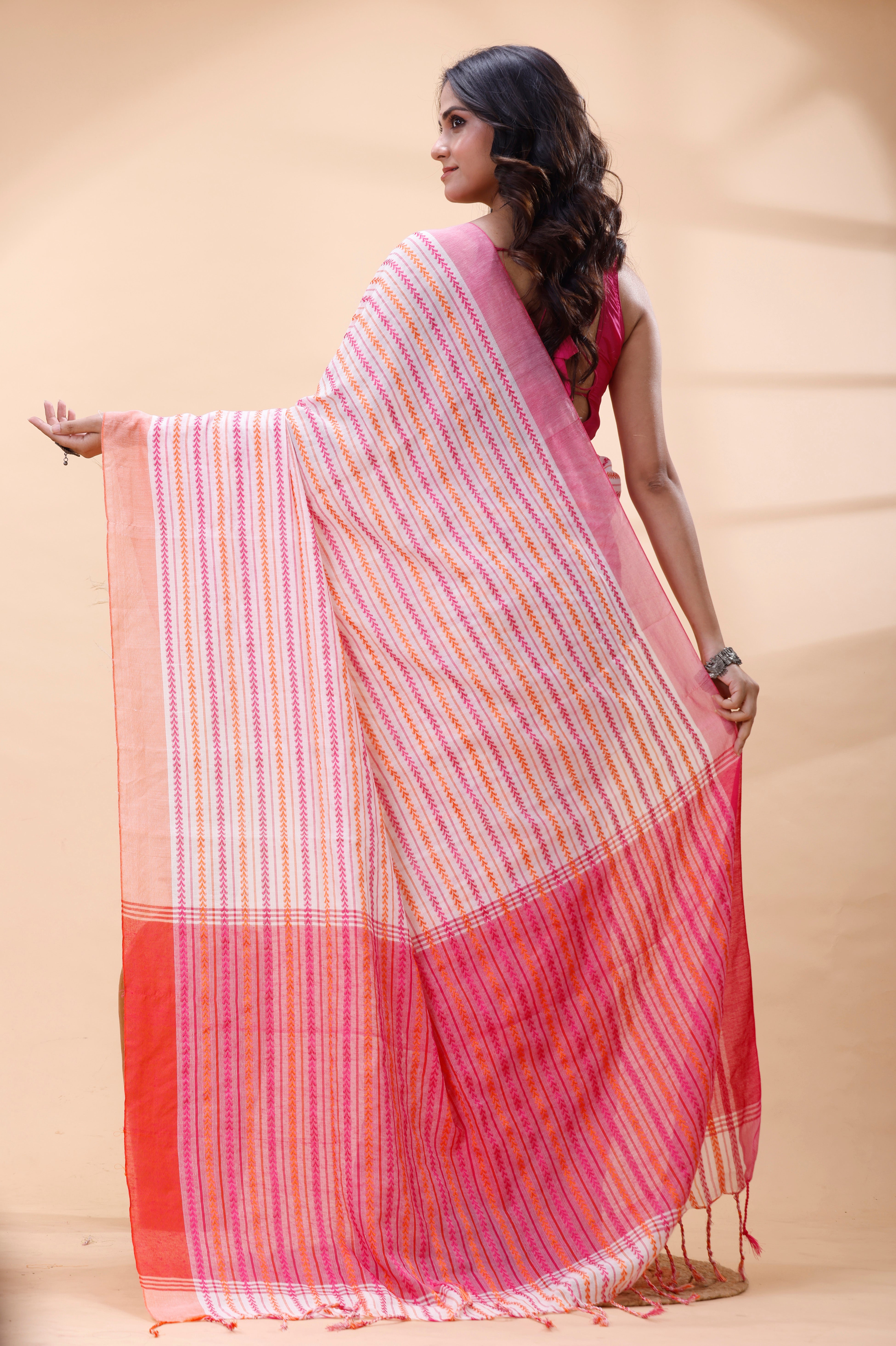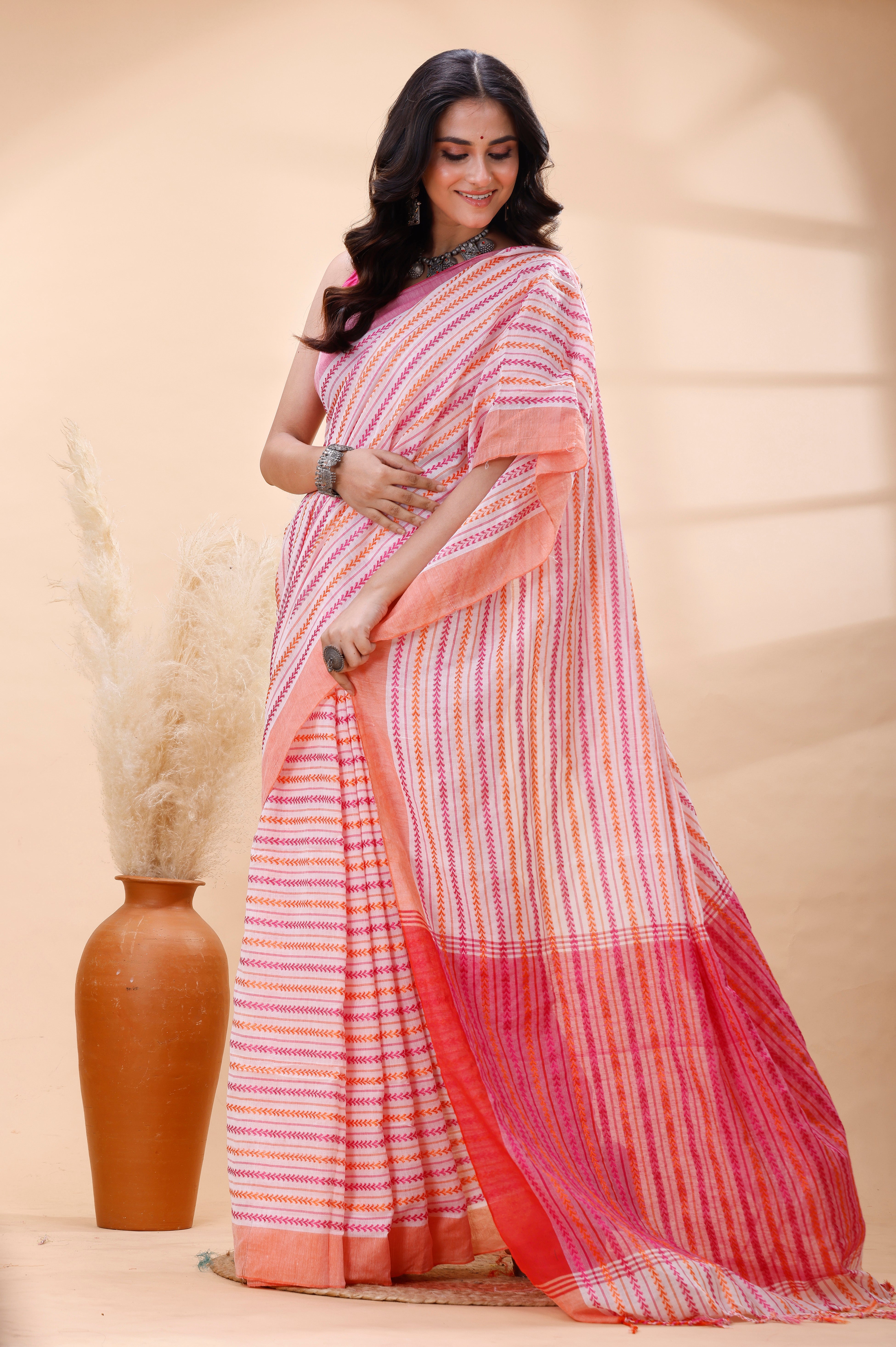 WHITE HANDLOOM COTTON SAREE WITH PINK AND ORANGE FINE STRIPED WEAVE AND TRADITIONAL BORDER